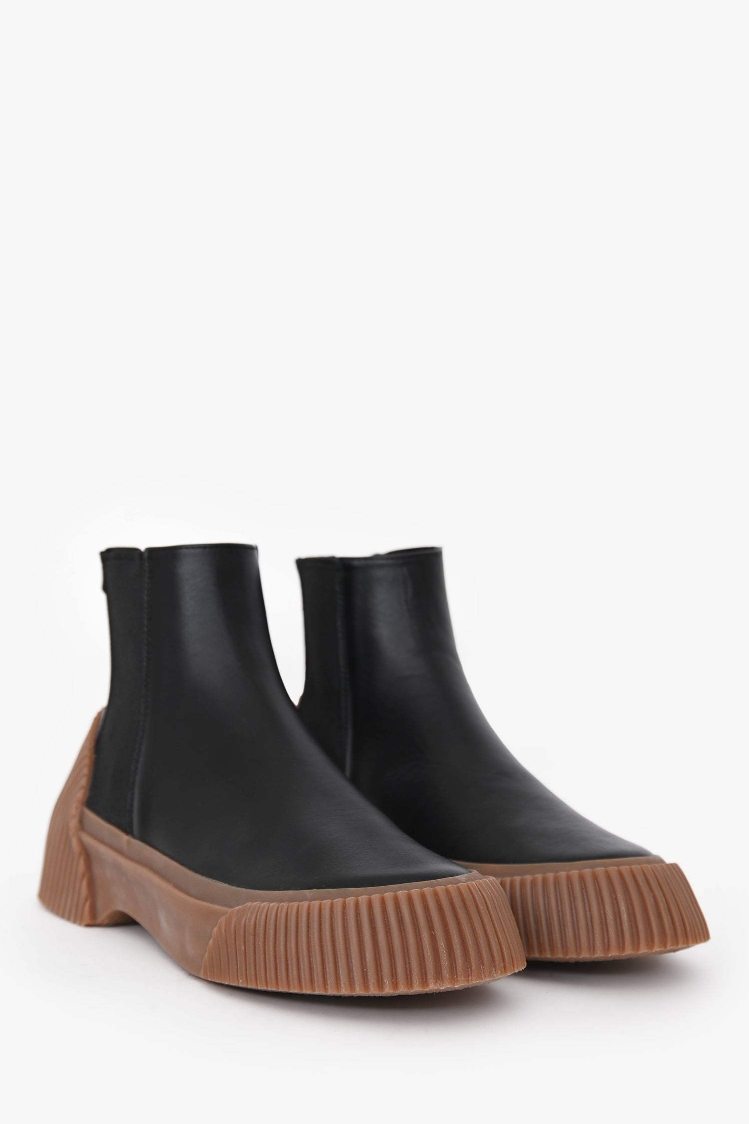 3.1 Phillip Lim Black/Brown Rubber 'Lela' Chelsea Ankle Boots. Pull-on. Round toe. Tonal stitching.