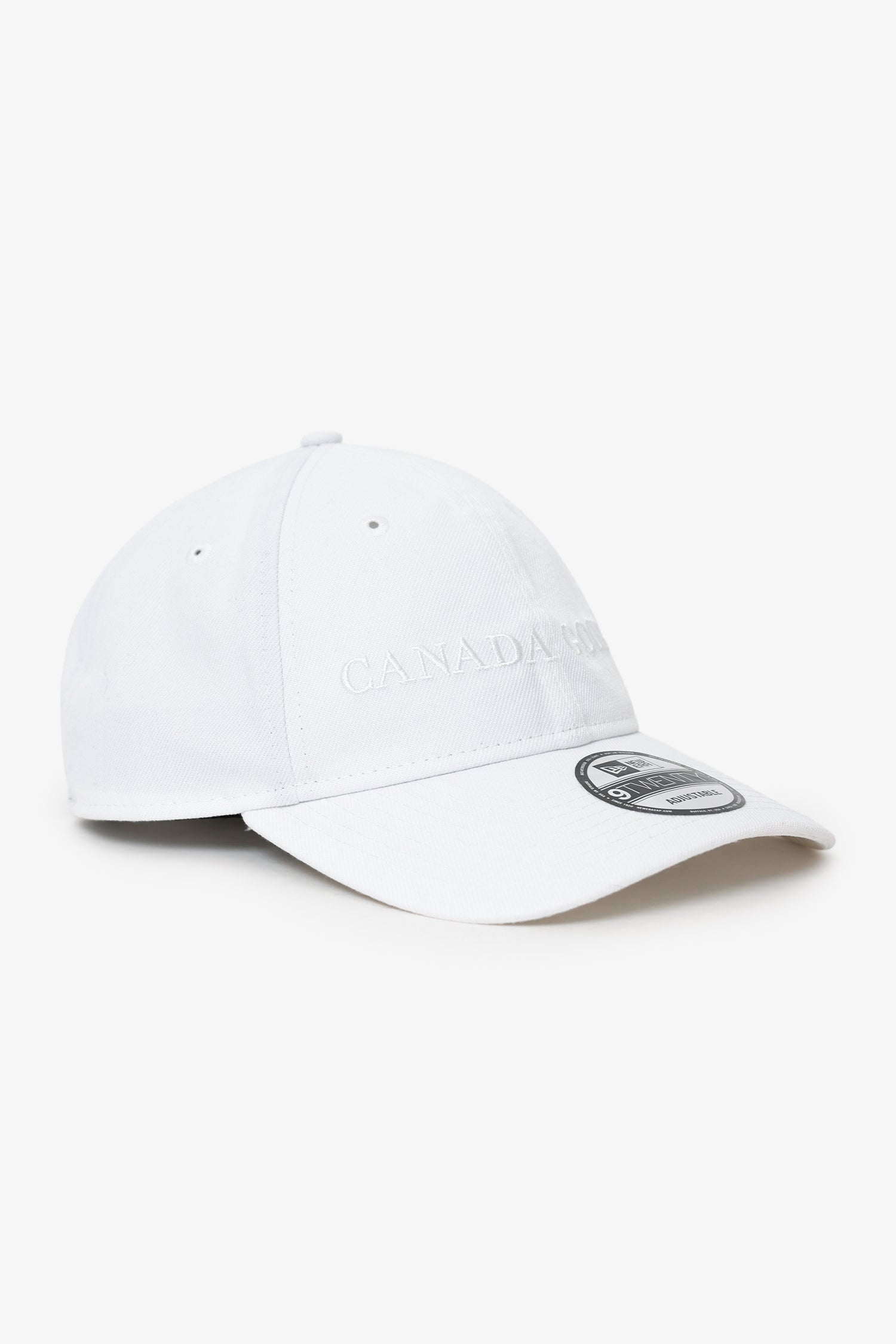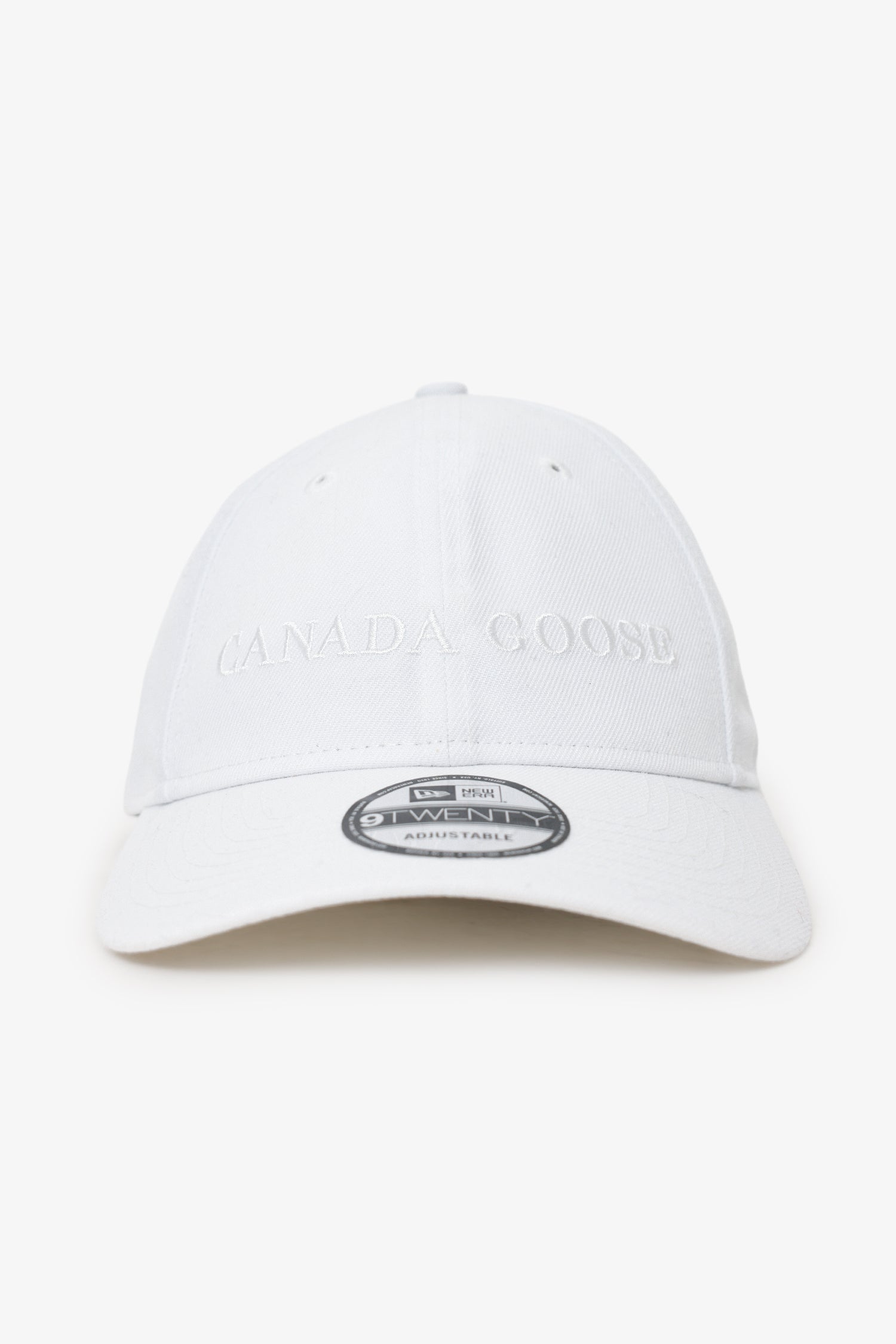 Canada Goose White Wordmark Cap. Adjustable rear pull-through buckle closure. Tonal stitching.