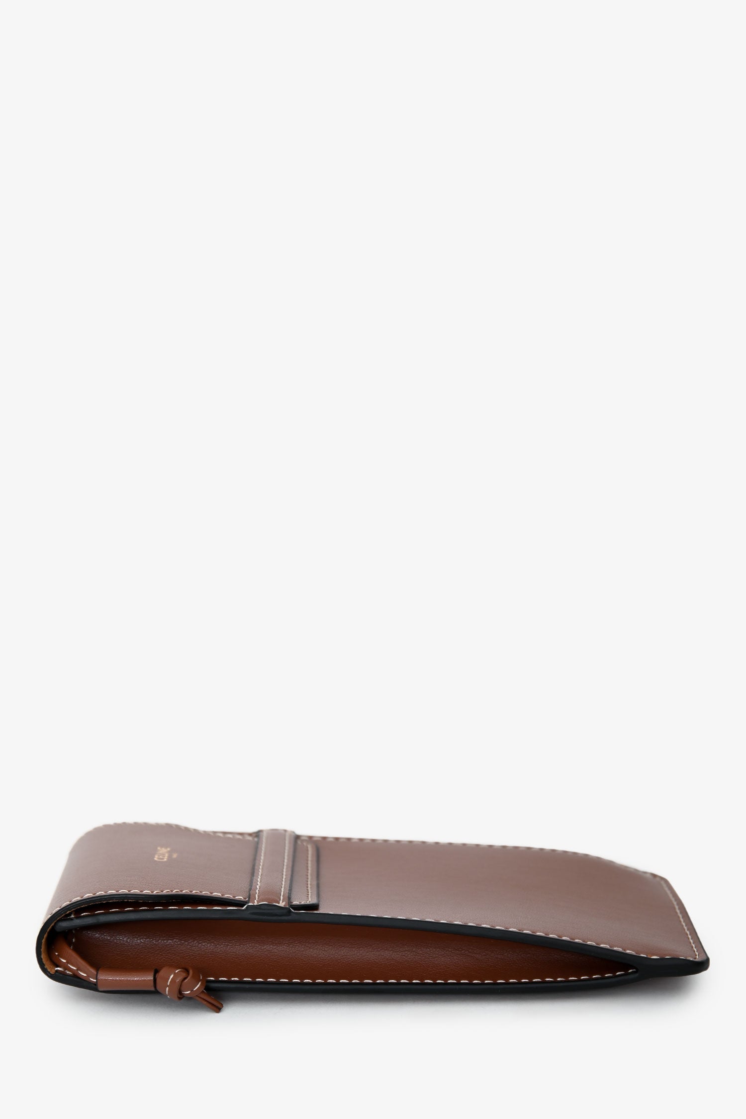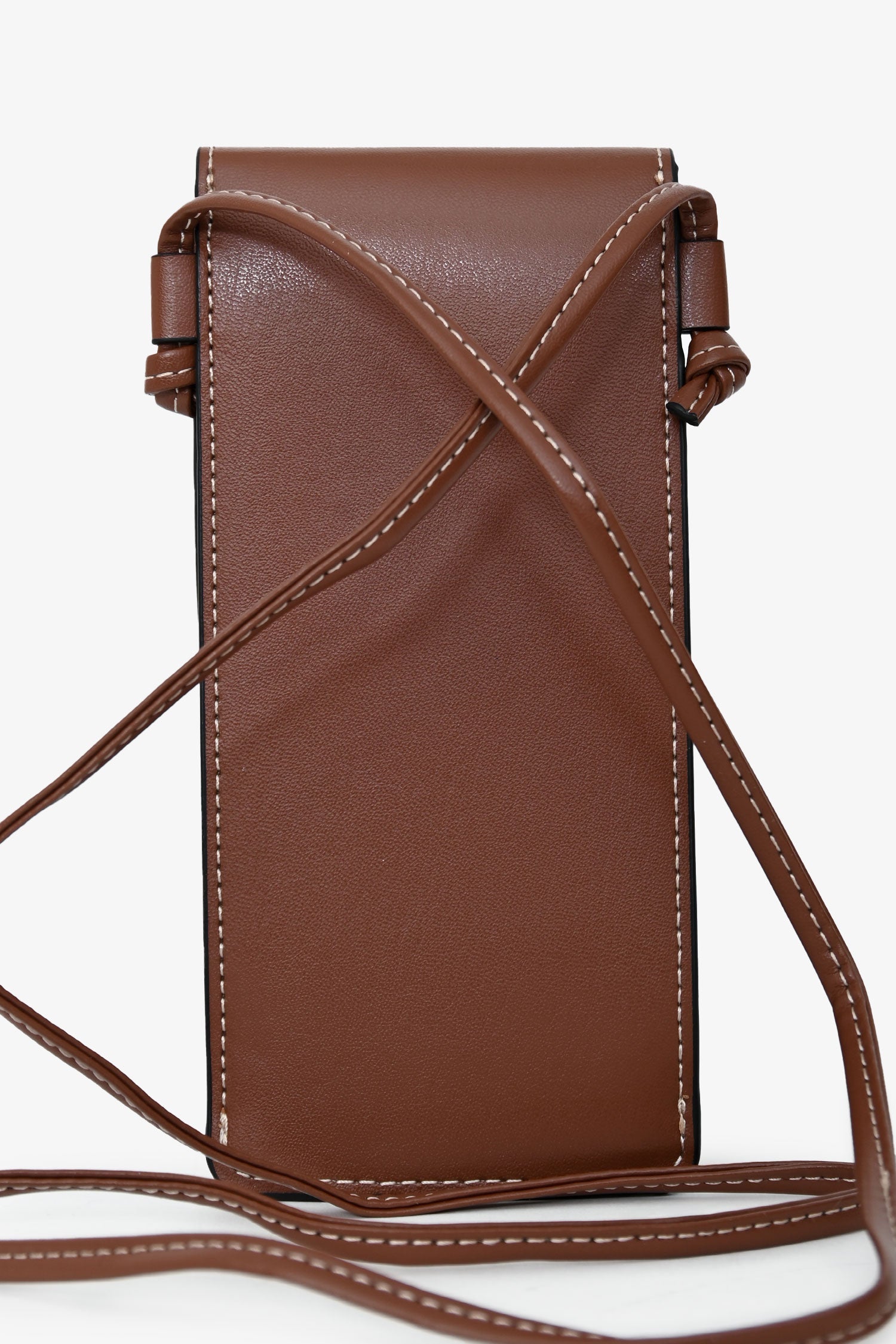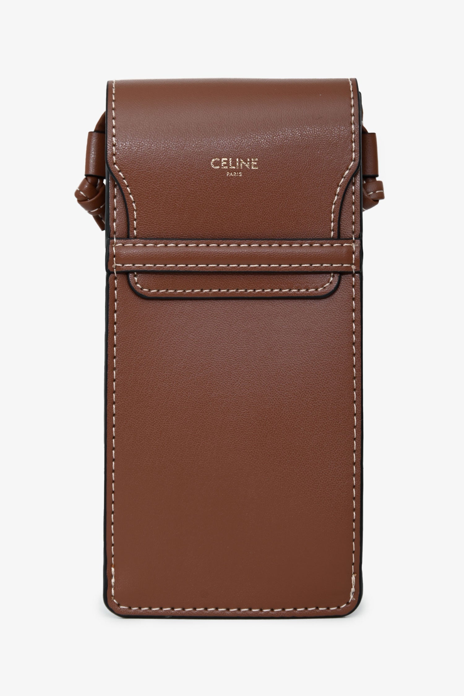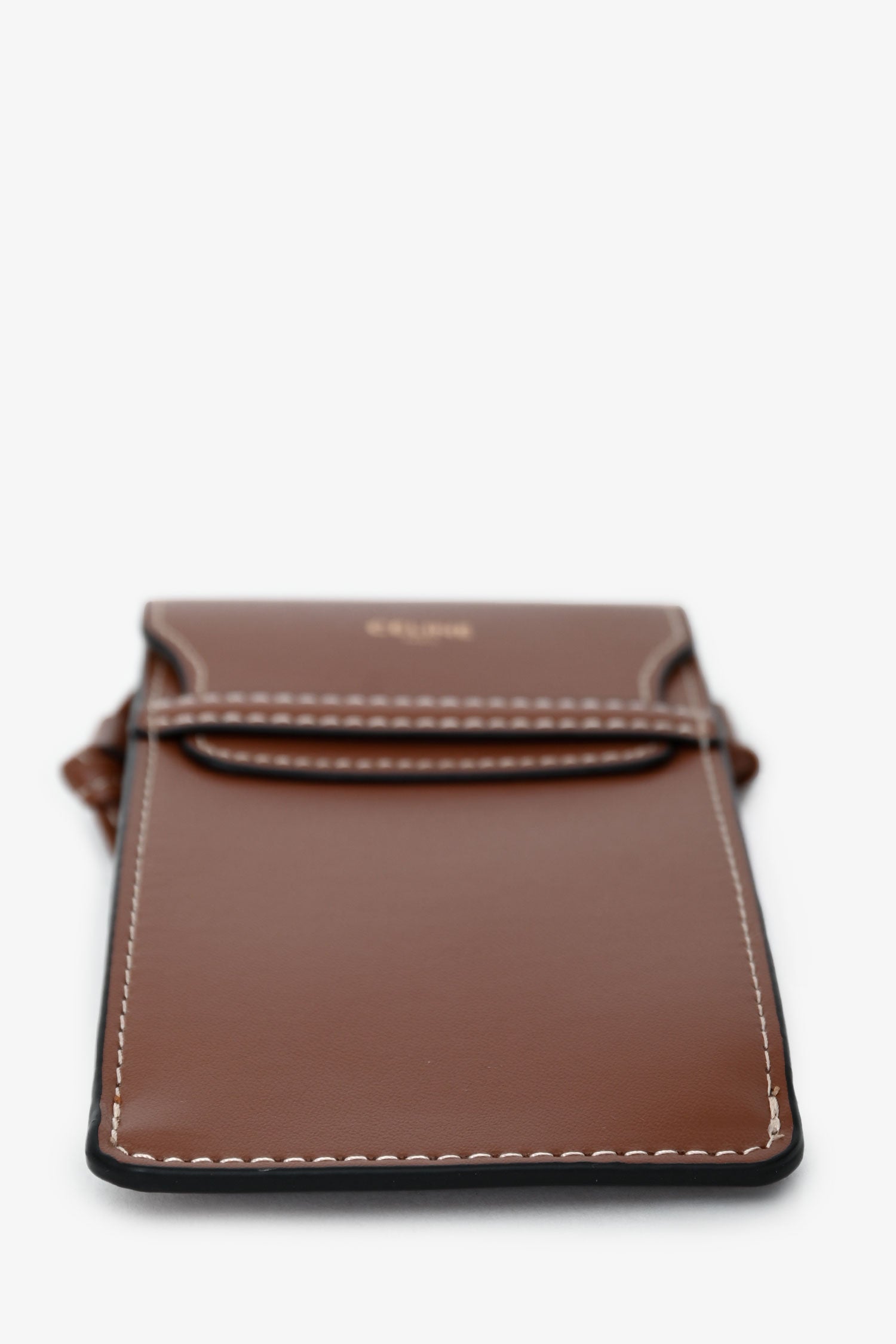 Celine Brown Leather Sunglasses Pouch. Fold-over flap. Shoulder strap. Suede interior. Contrast stitching.