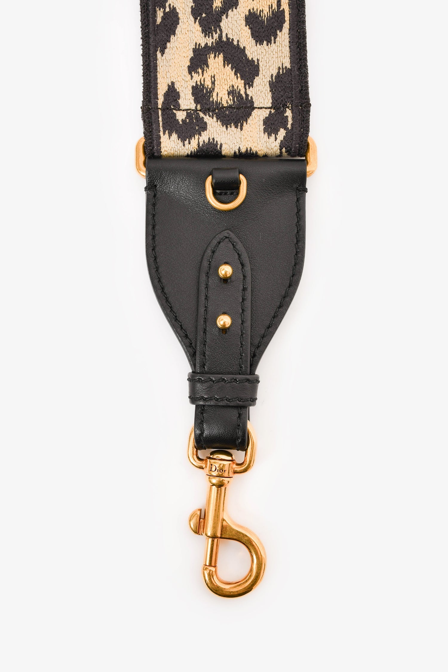 Christian Dior Black/Gold Leopard Jacquard Guitar Bag Strap. Lobster clasp closure. Gold-tone hardware. Tonal stitching.
