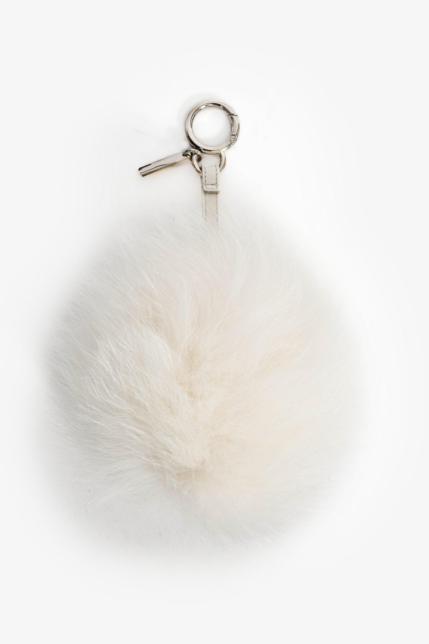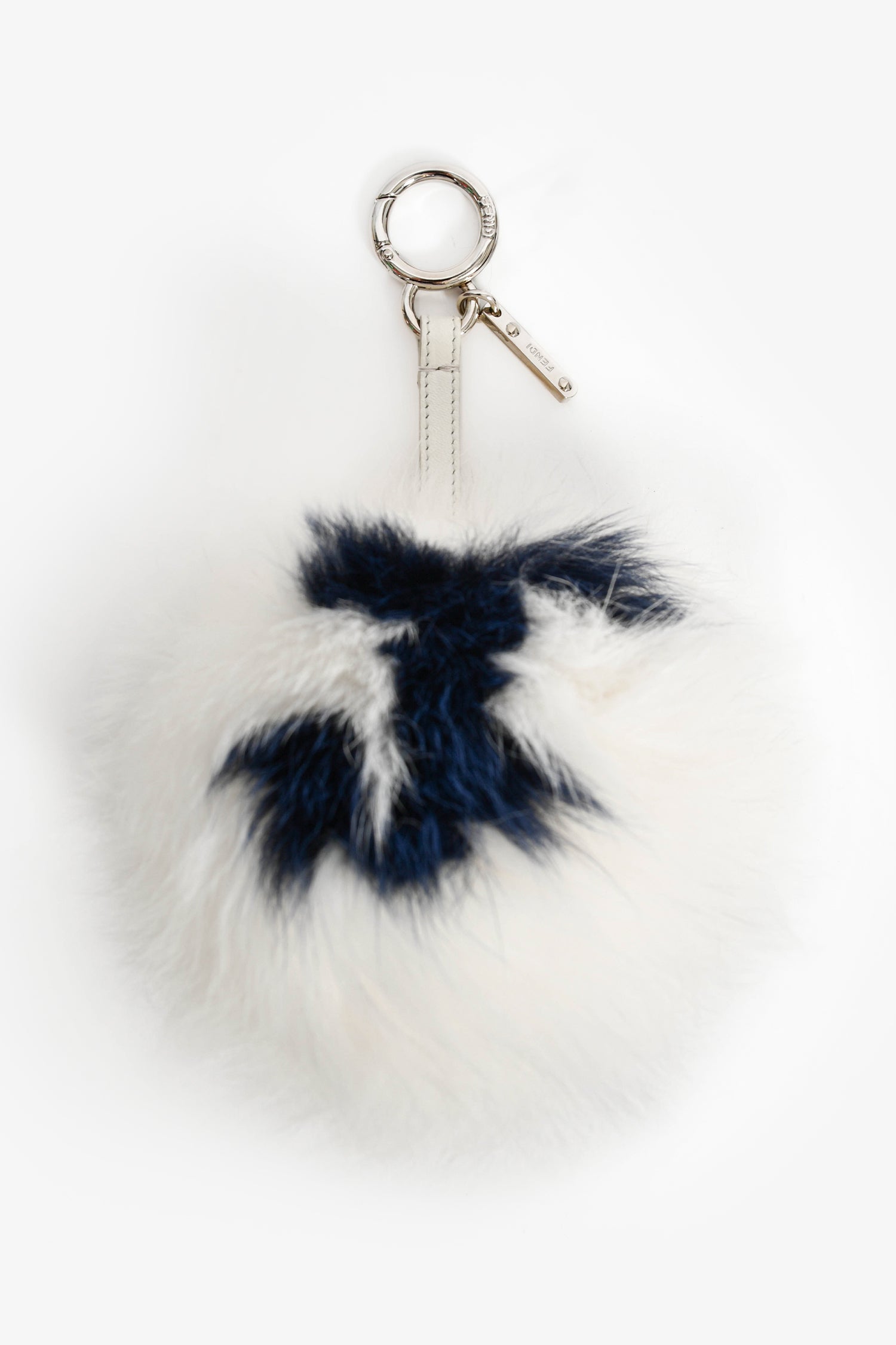 Fendi White/Navy Blue Fur 'J' Keychain. Clip closure.