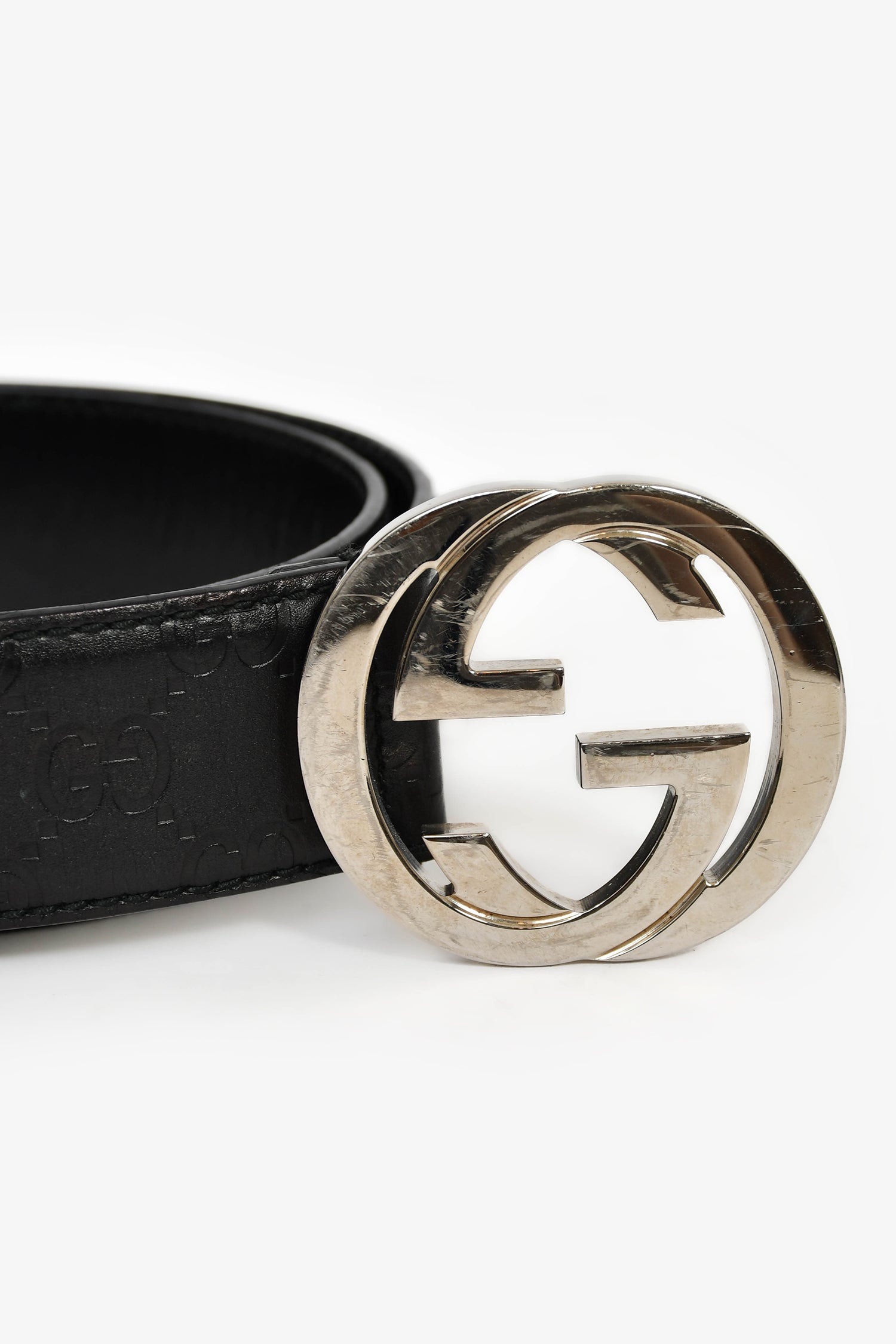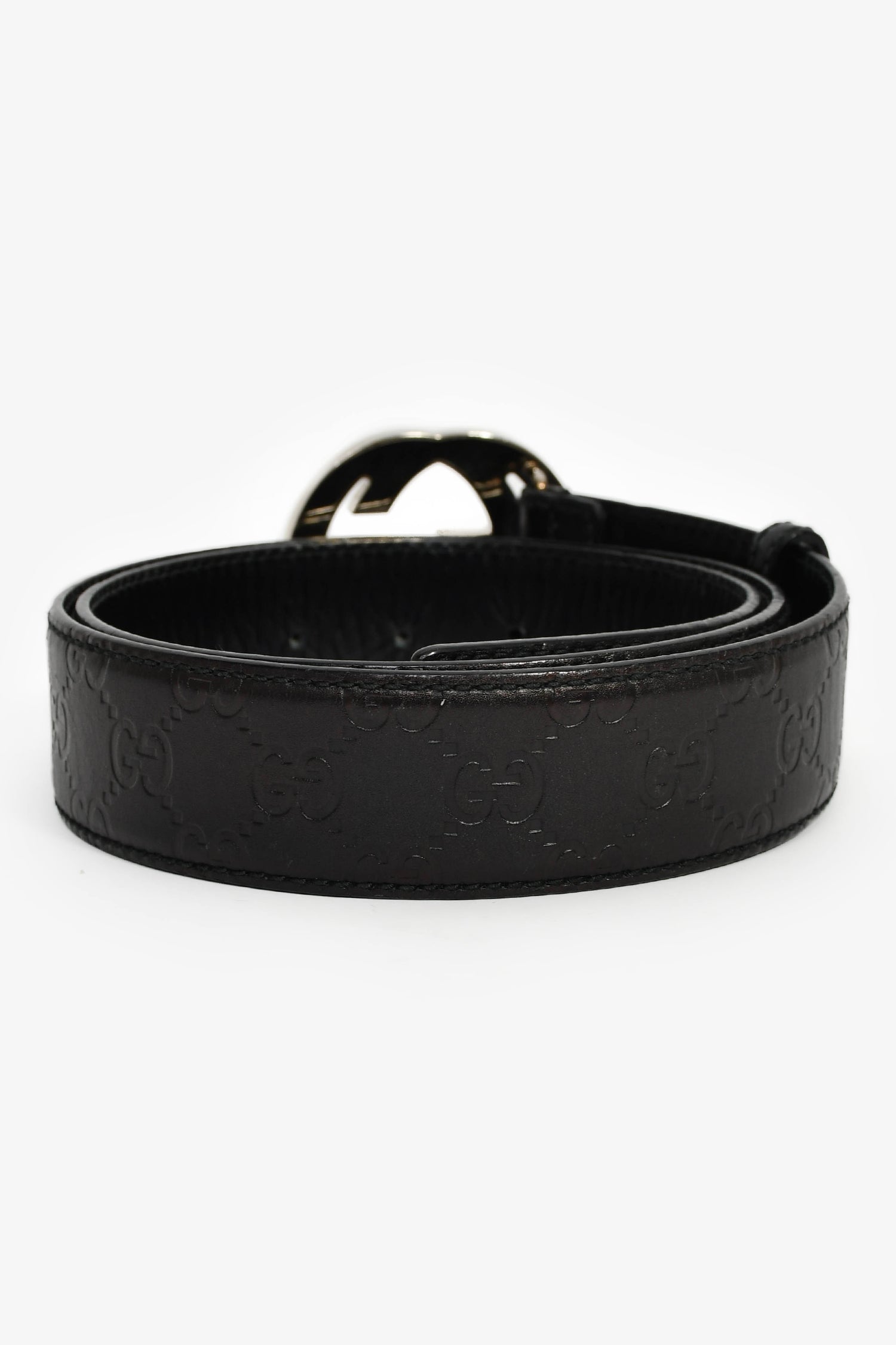 Gucci Black Leather GG Guccissima Belt. Adjustable pull-through closure. Silver-tone hardware. Tonal stitching.