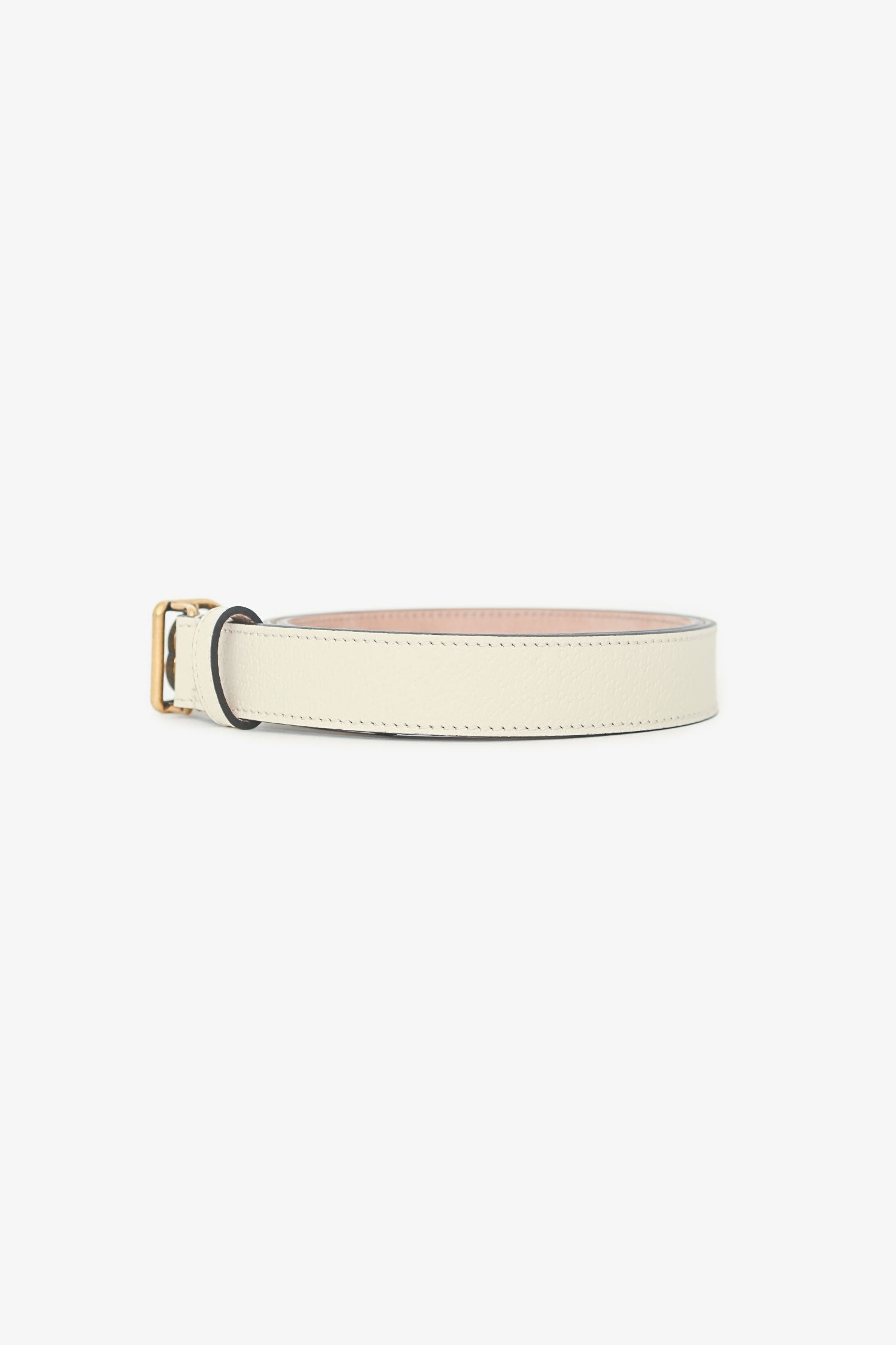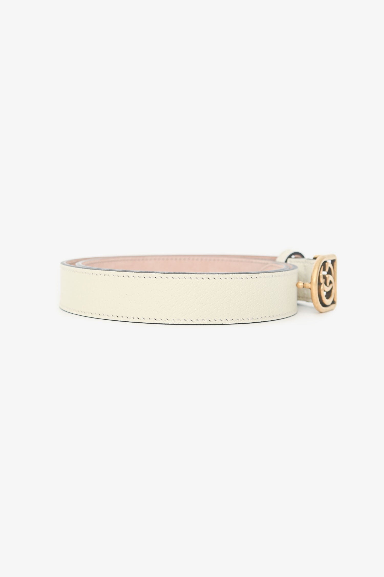 Gucci White Leather GG Logo Belt. Push-tab buckle closure. Gold-tone hardware. Tonal stitching.