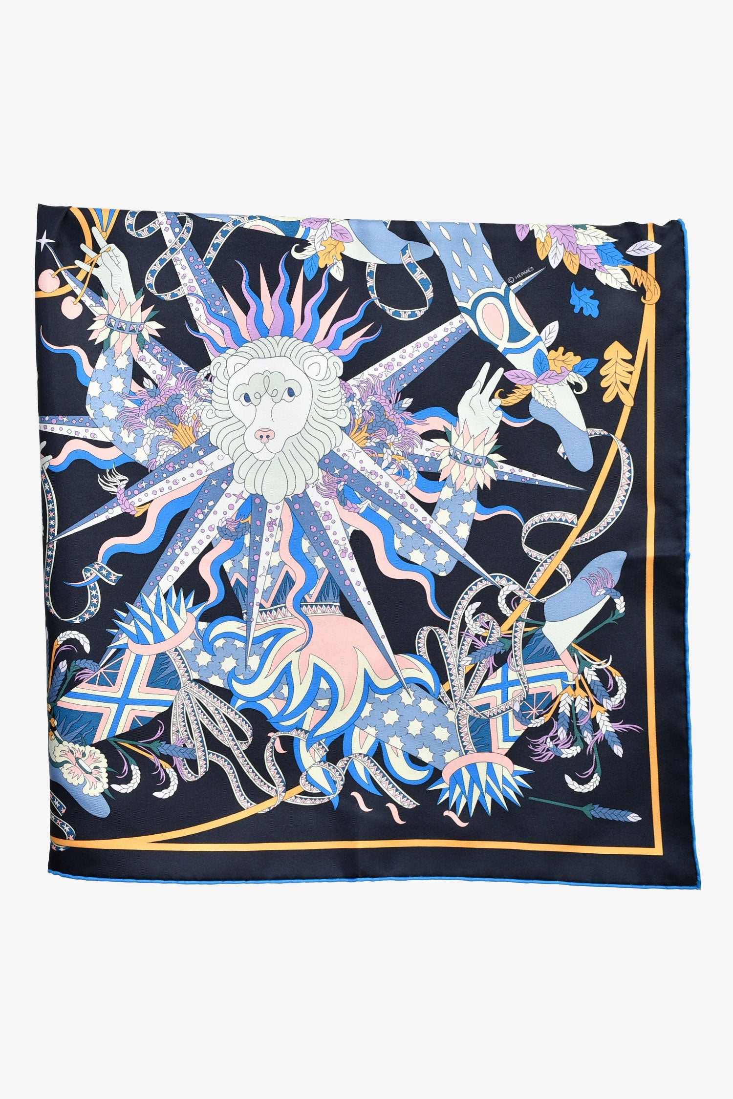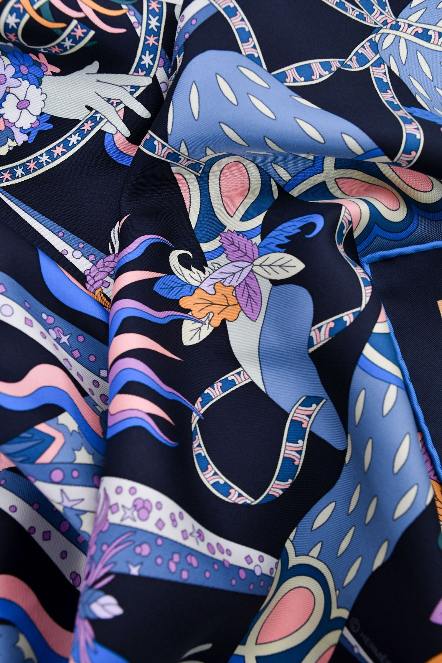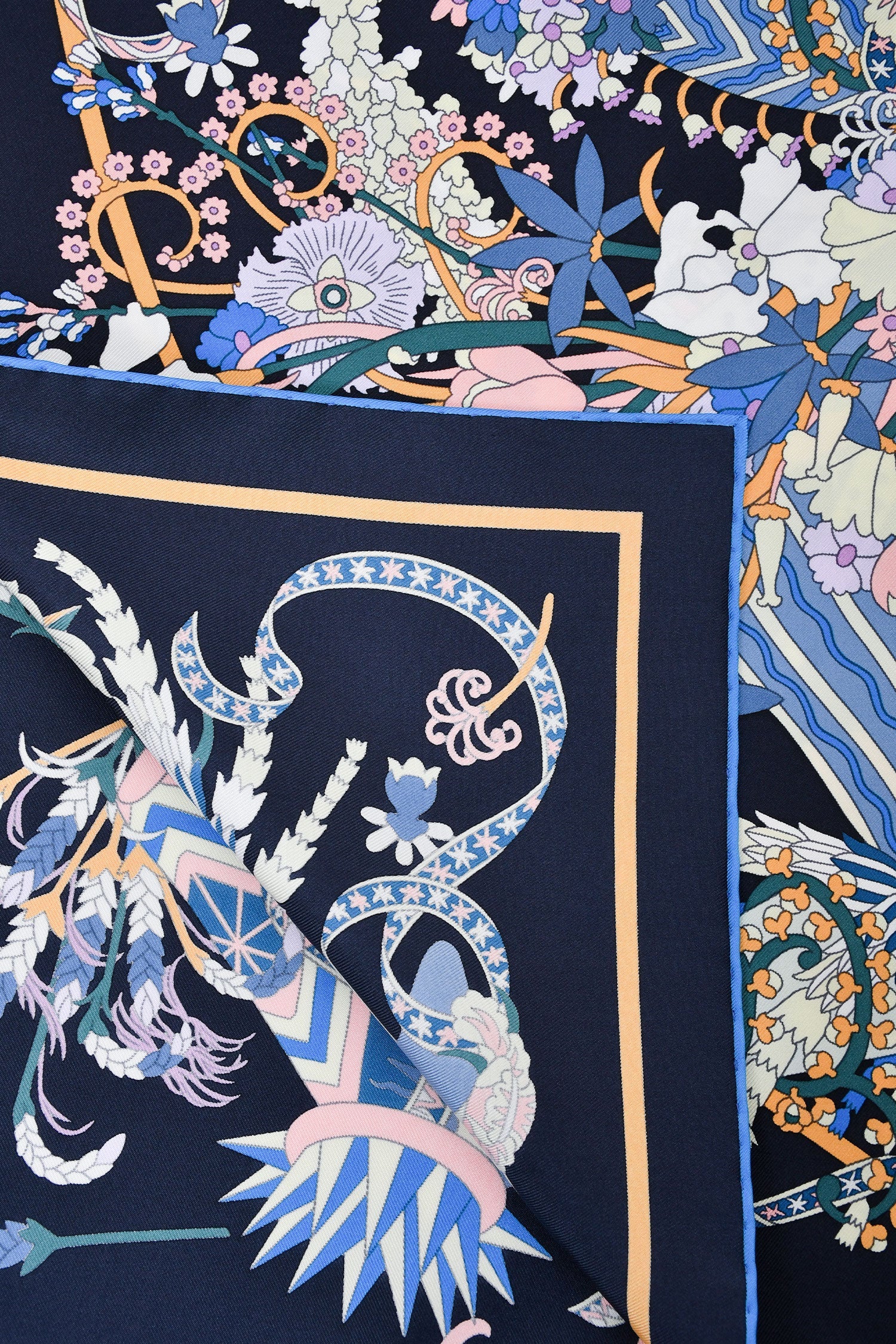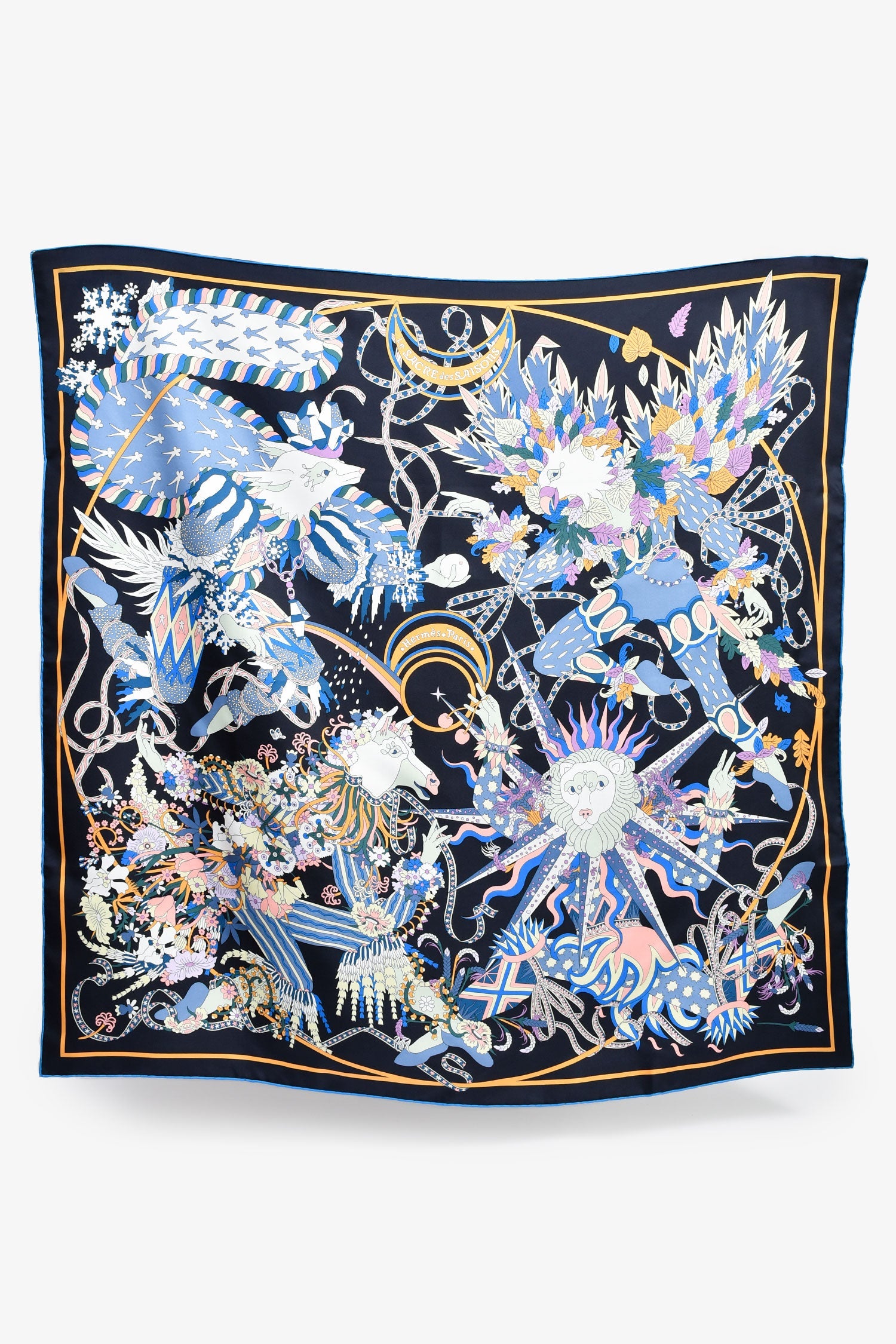 Hermès Black/Cobalt Silk 'Le Sacre des Saisons' Scarf 90