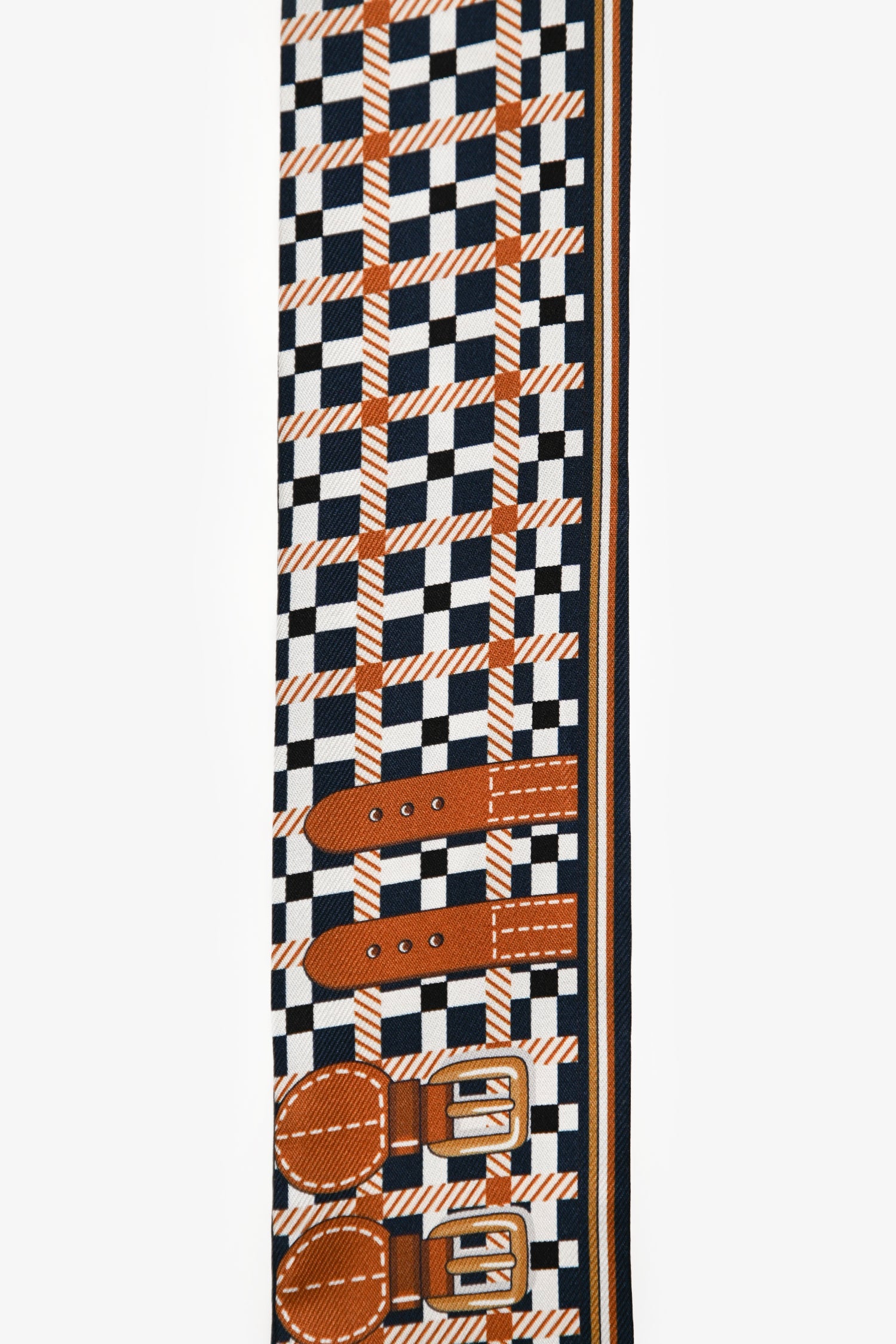 Hermes Navy/Brown Silk Carriage Twilly. Tonal stitching.