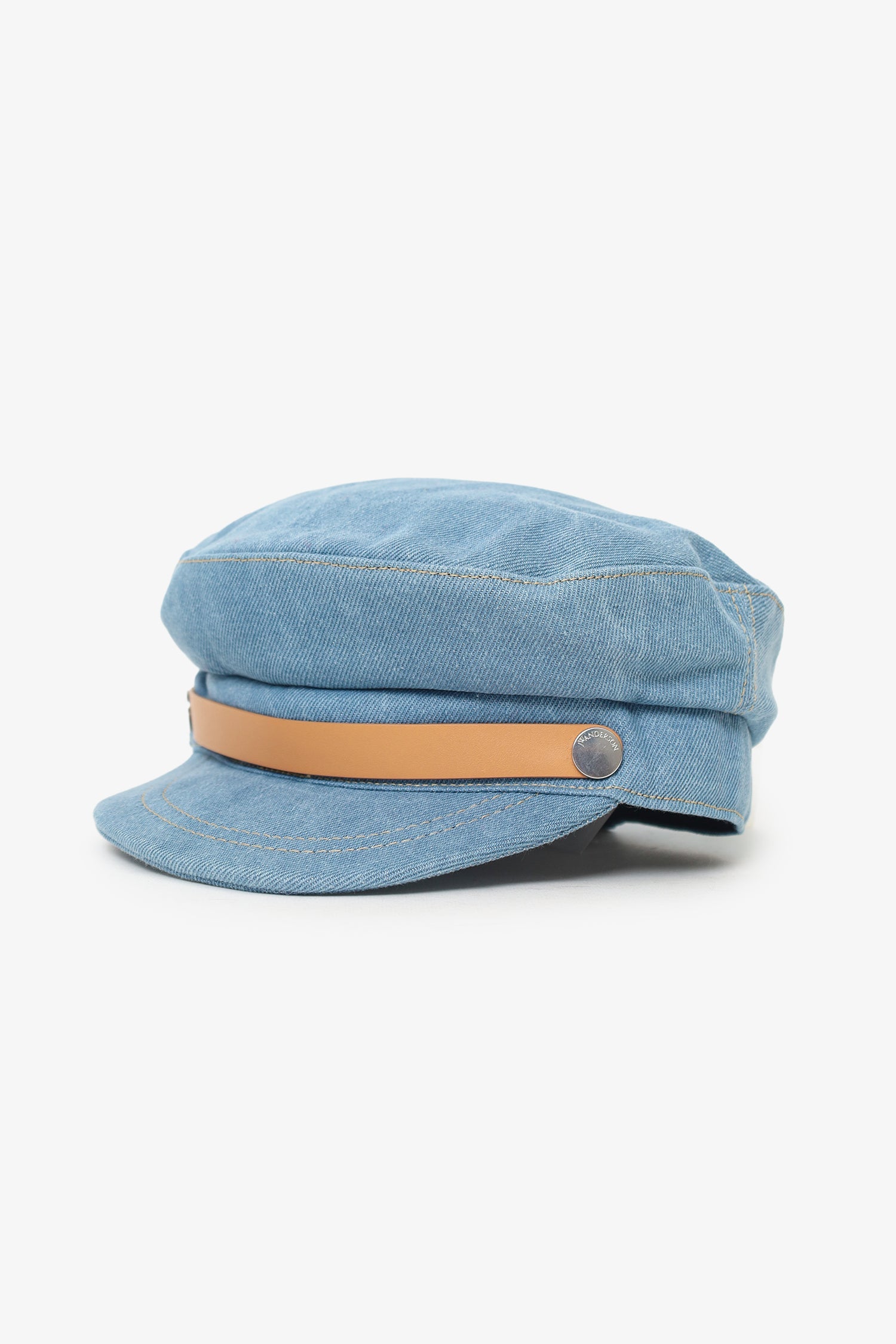 JW Anderson Blue/Brown Denim/Leather Newsboy Cap. Silver-tone hardware. Contrast stitching.