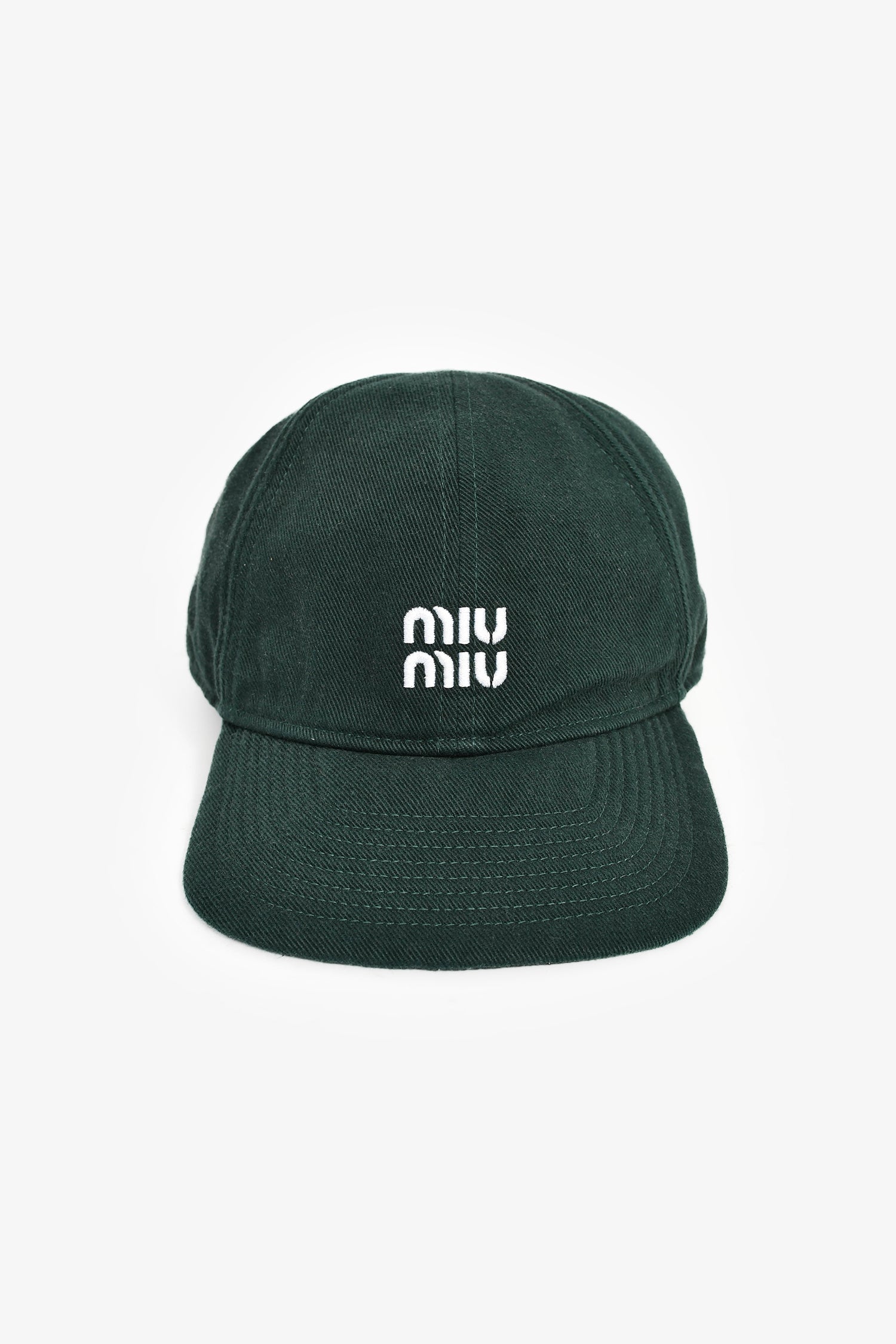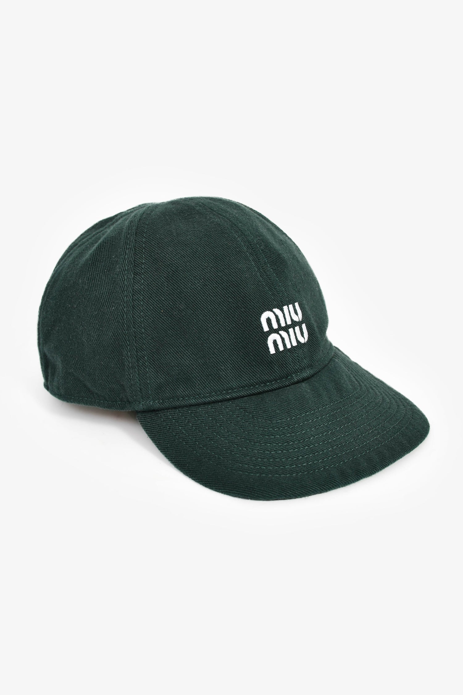 Miu Miu Green Cotton Logo Baseball Cap. Rear pull tabs. Gold-tone hardware. Tonal stitching.