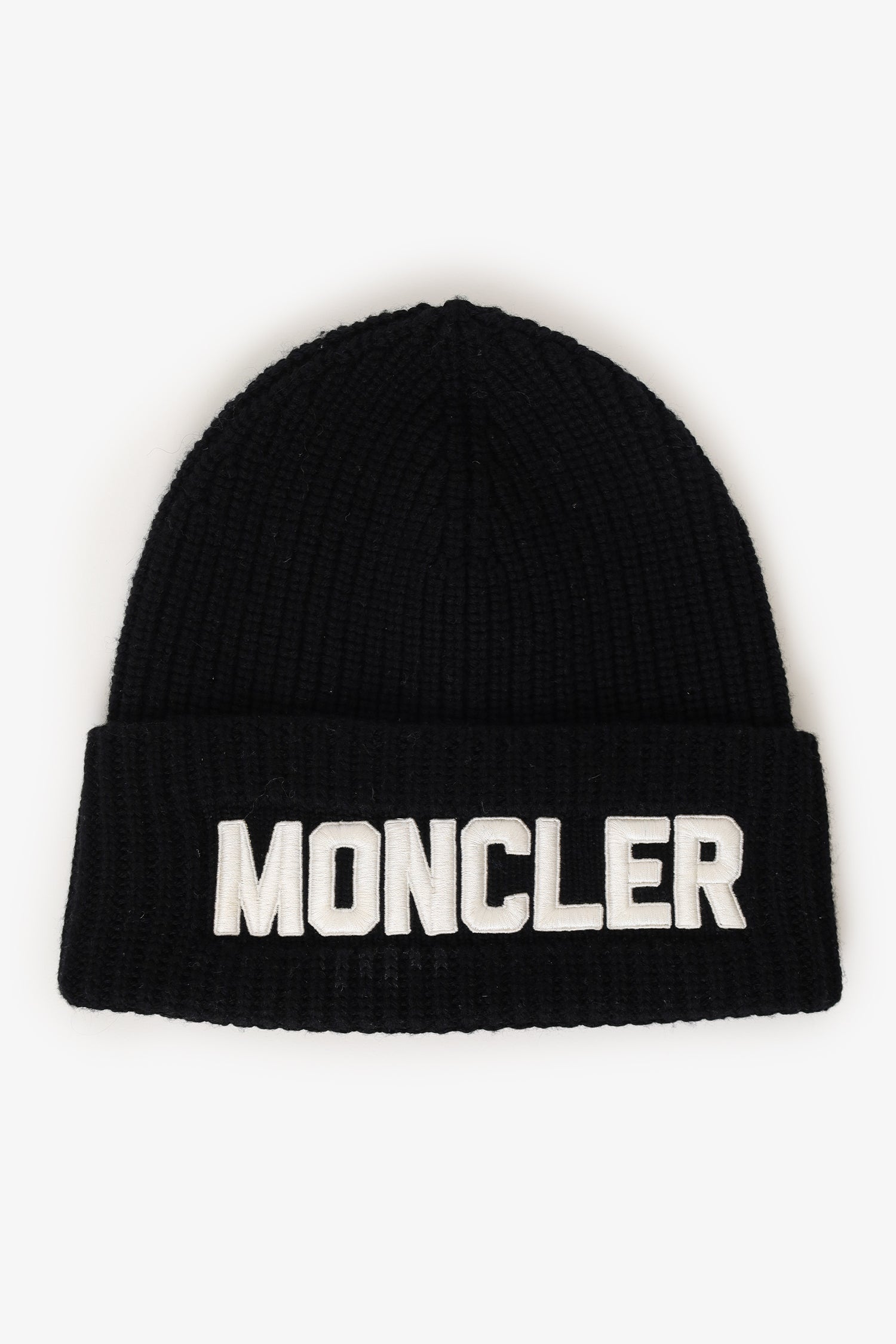 Moncler Black Wool Embroidered Logo Beanie. Tonal stitching.