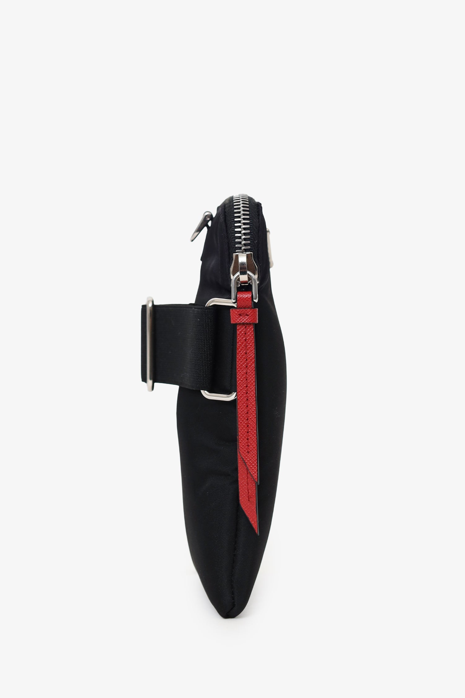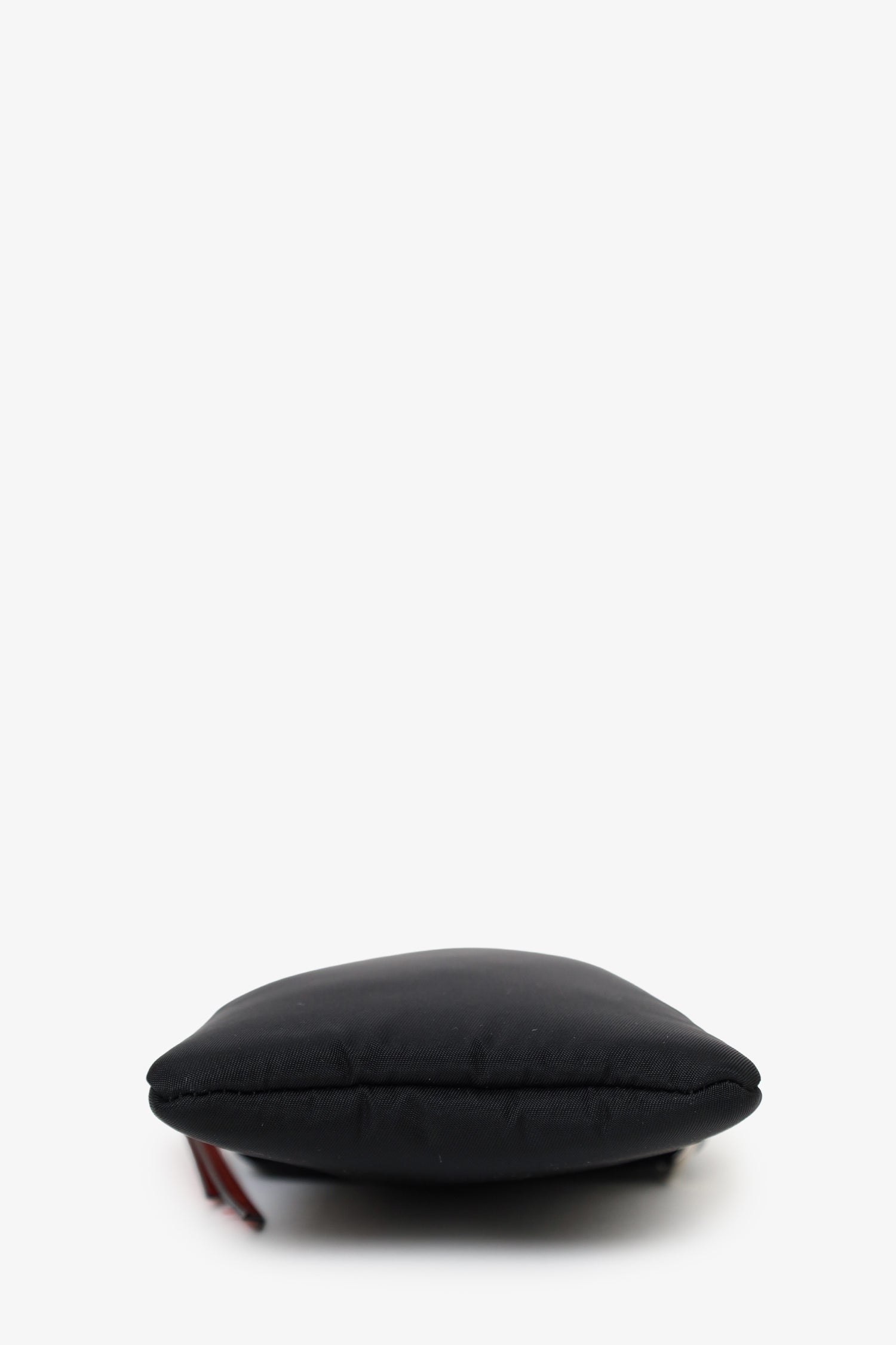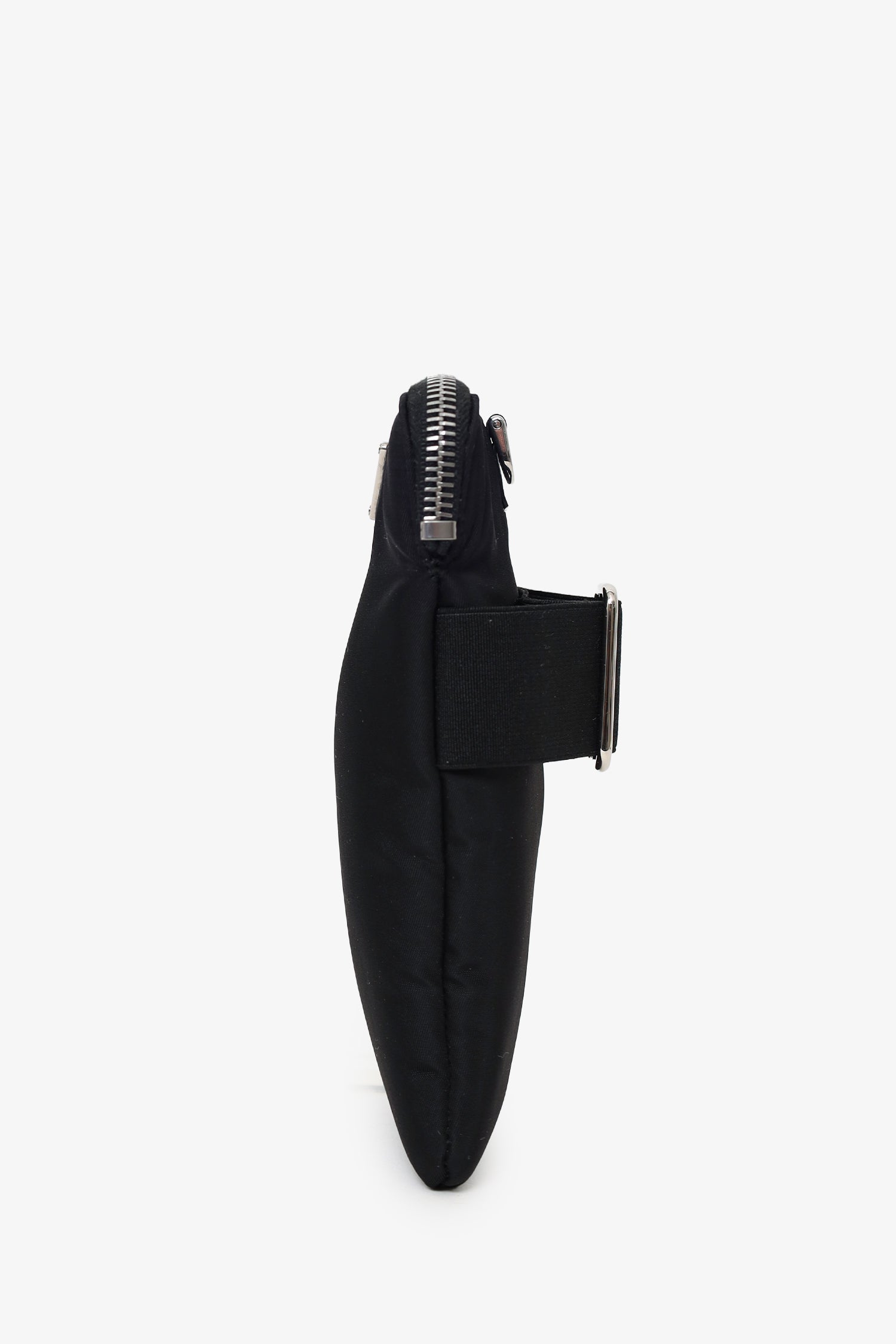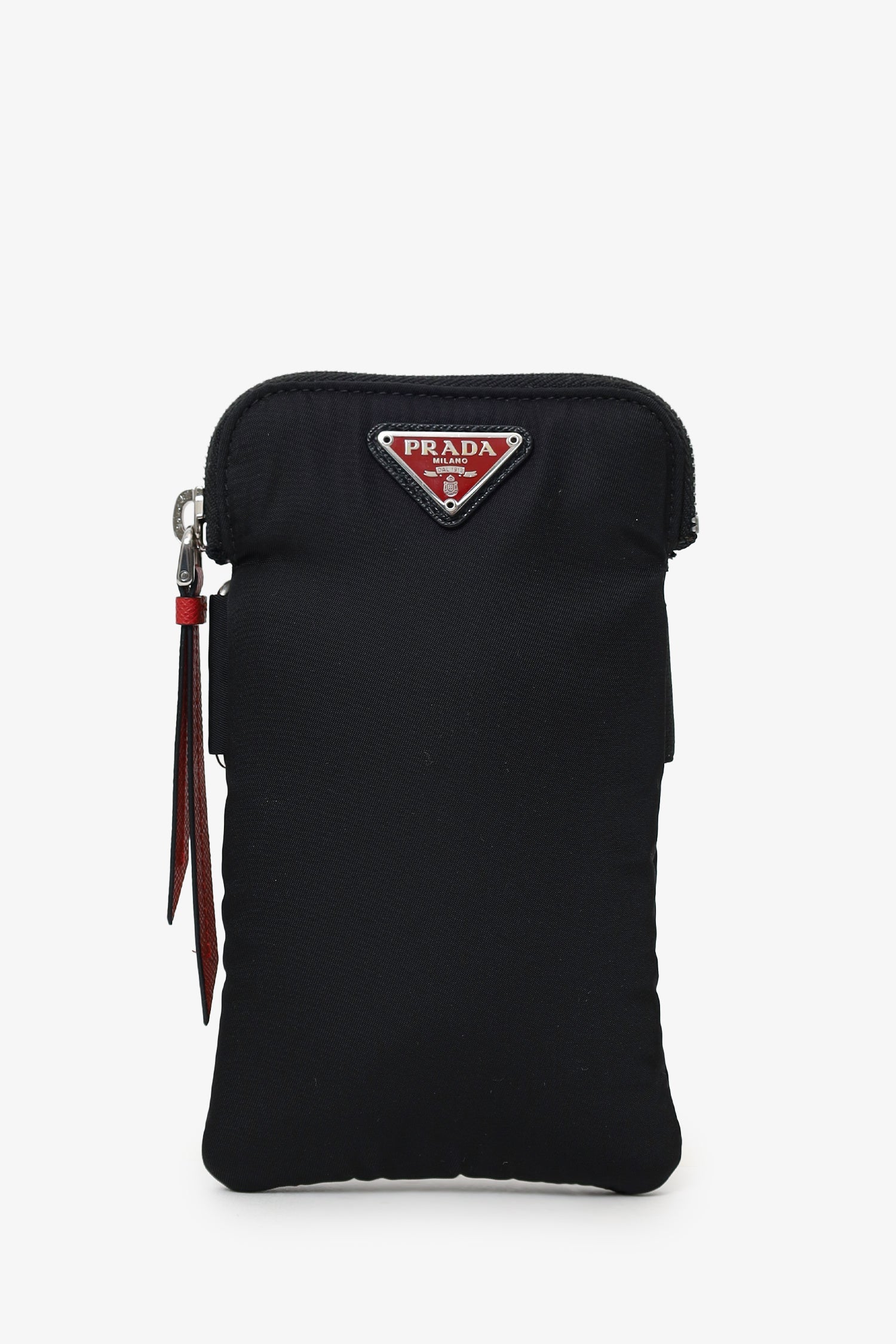 Prada Black Nylon Phone Pouch With Strap. Top zip-up closure. Adjustable pull-through buckle closure to rear. Lined interior. Silver-tone hardware. Tonal stitching.