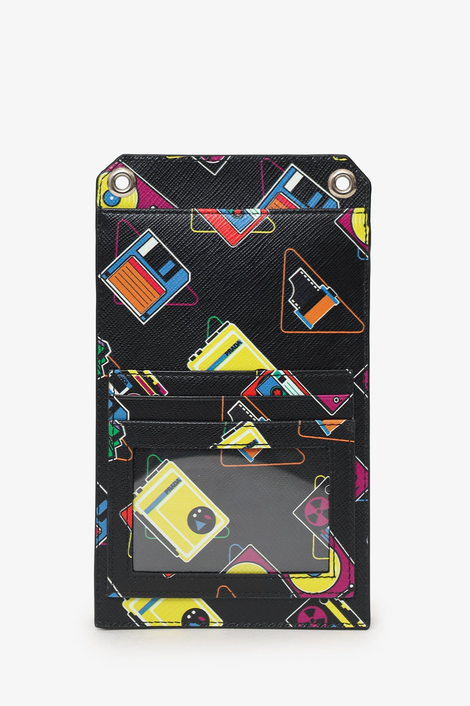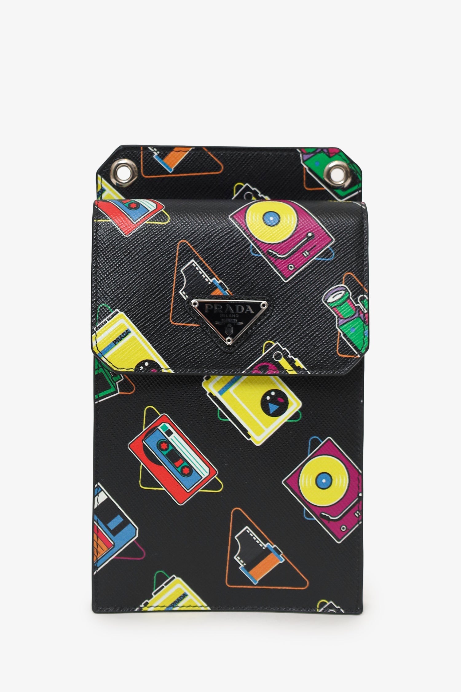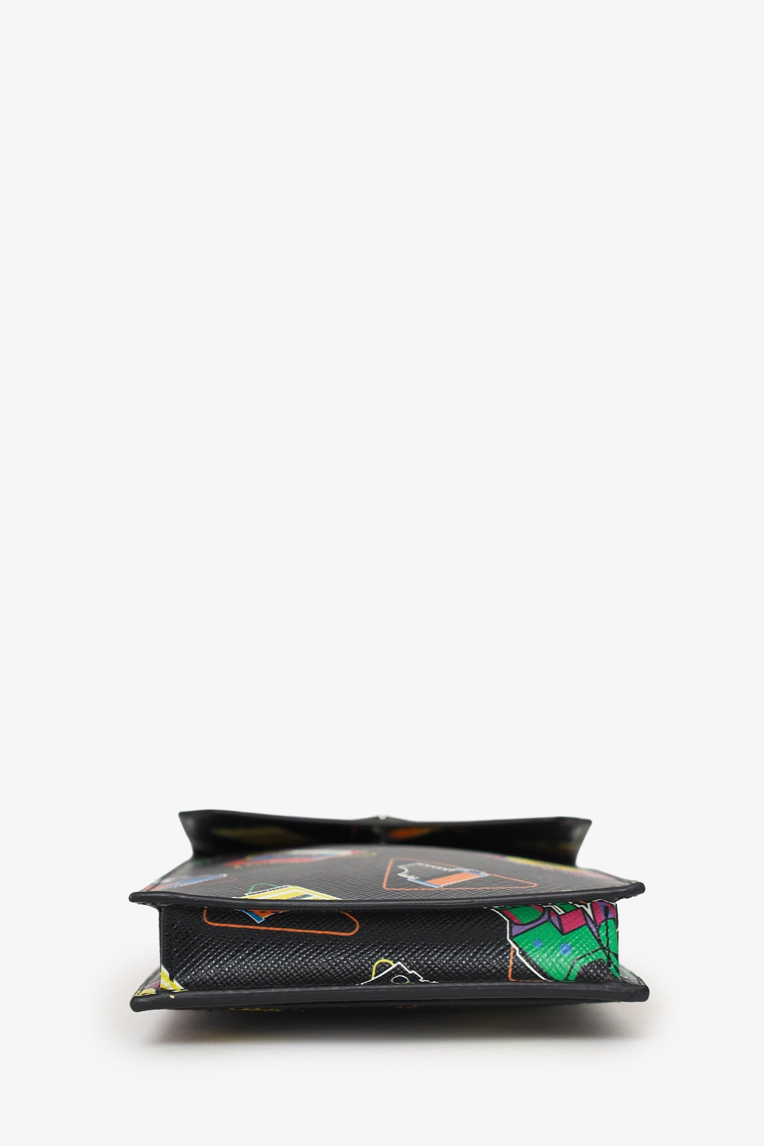 Prada Black Saffiano Robot Print Phone Case Bag. Front-fold-over-flap with snap-button-up closure. Removable crossbody strap with clasp closure. 4 exterior rear pockets; 1 slip, and 3 card slots. Silver-tone hardware. Tonal stitching.