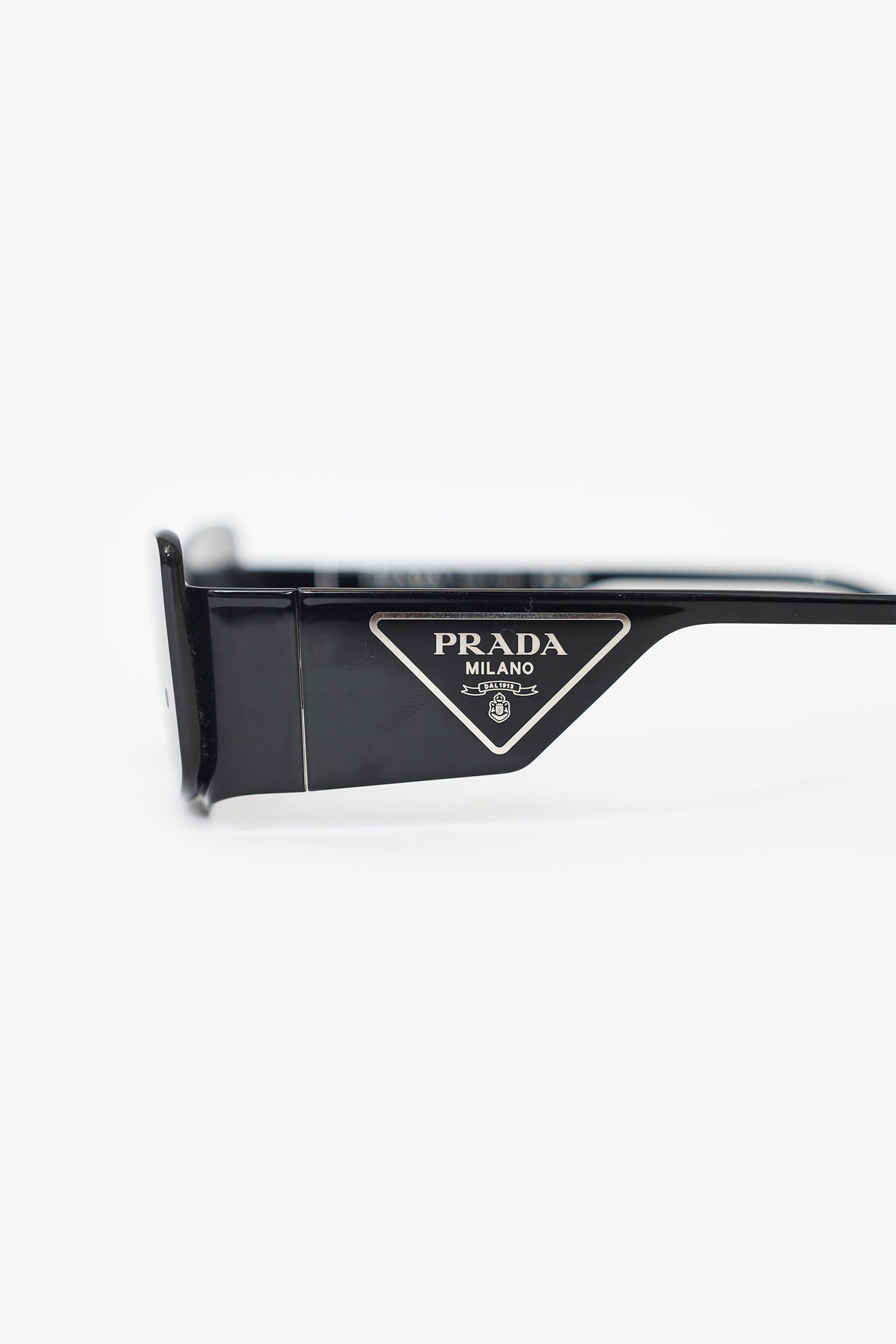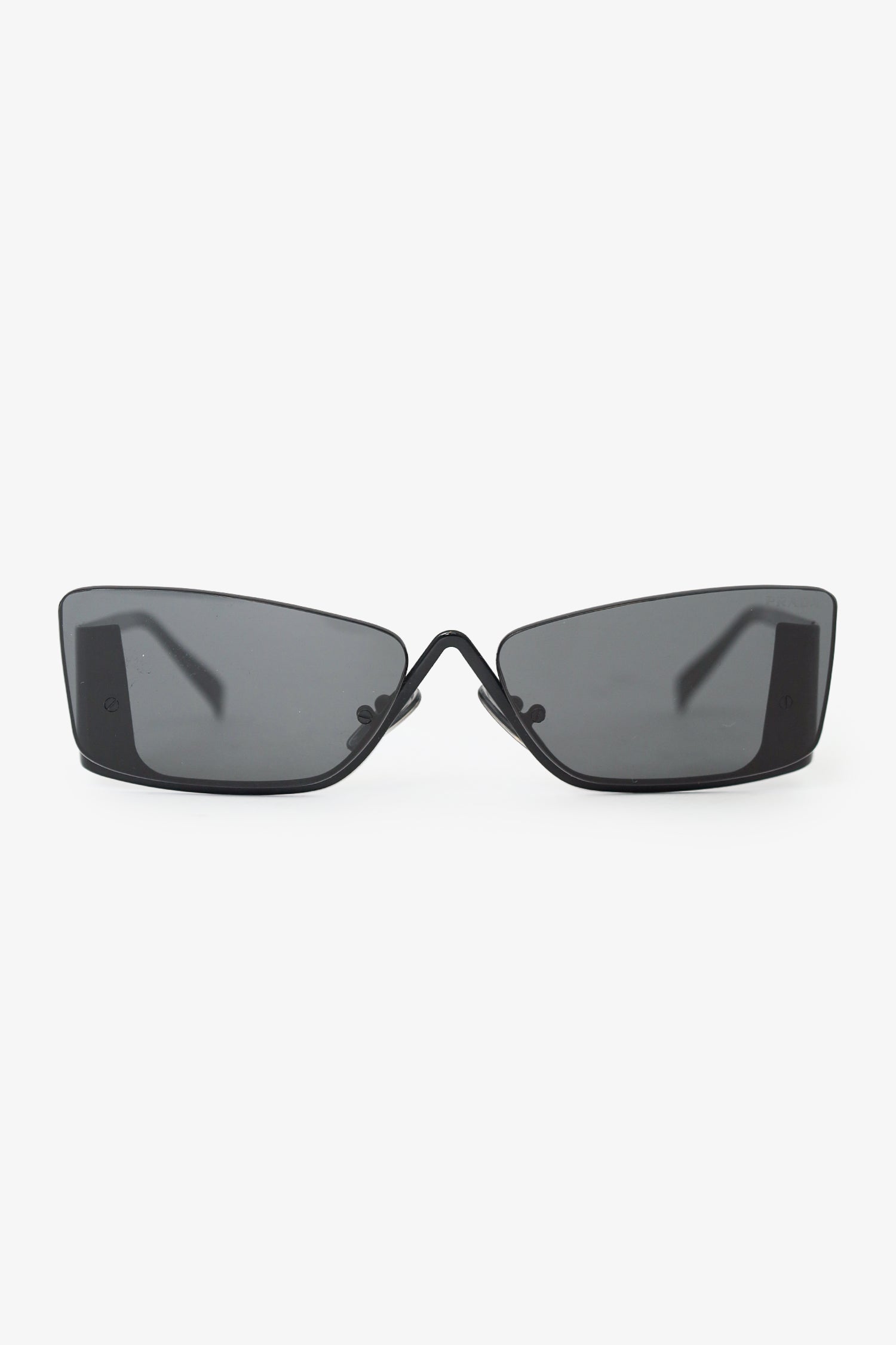 Prada Black SPR 59Z Runaway Shield Sunglasses. Adjustable nose pads. Silver-tone hardware.
