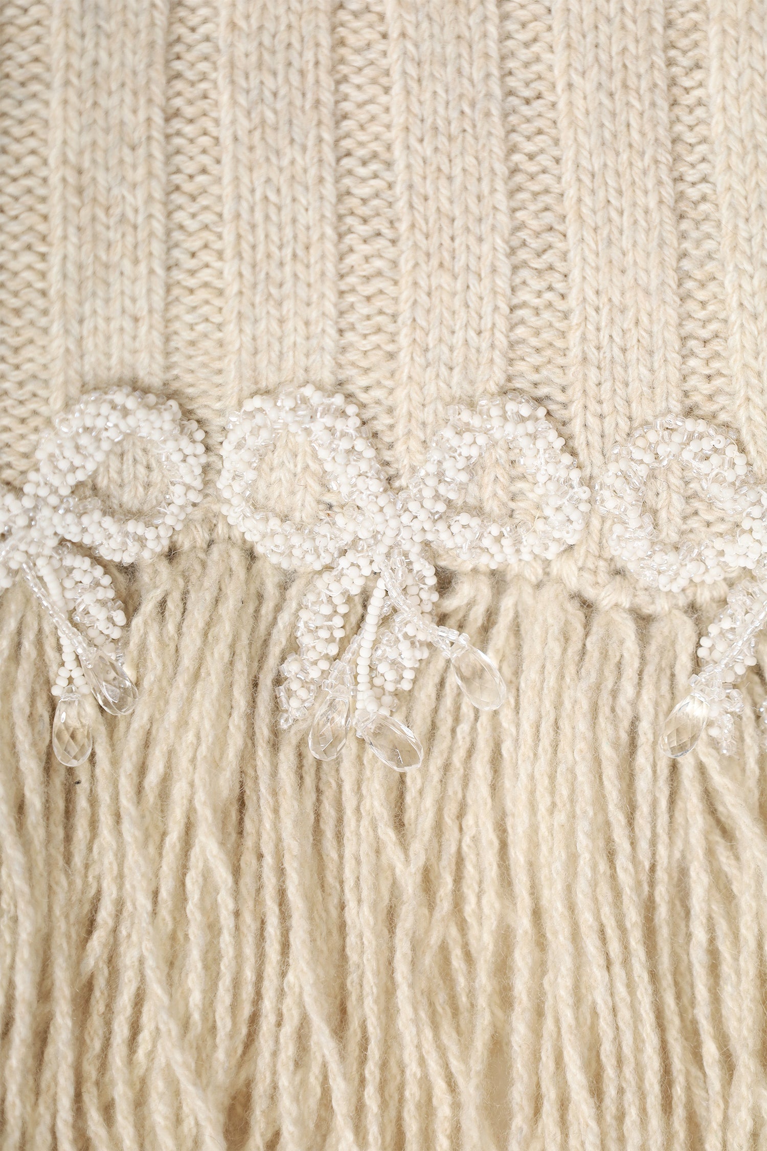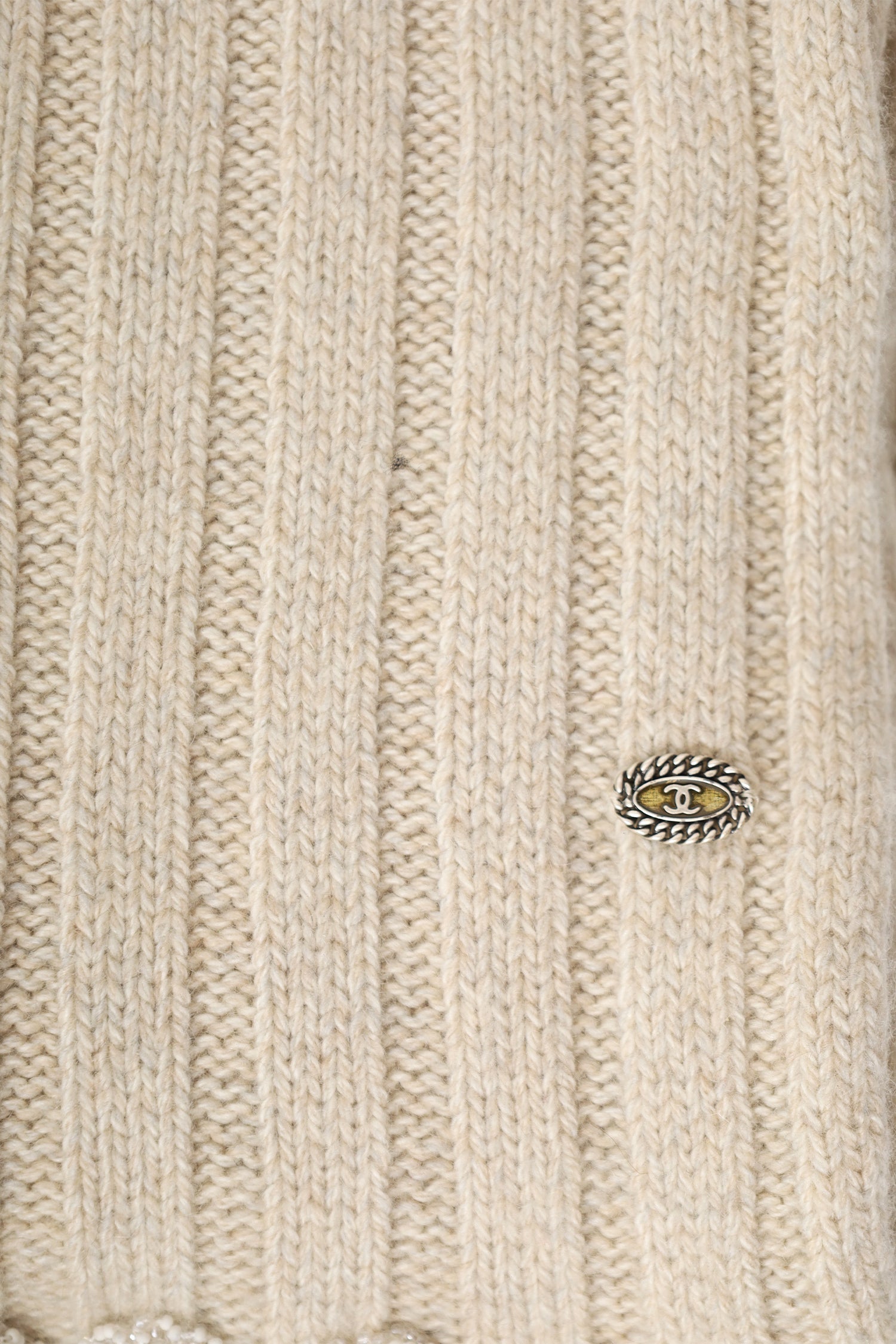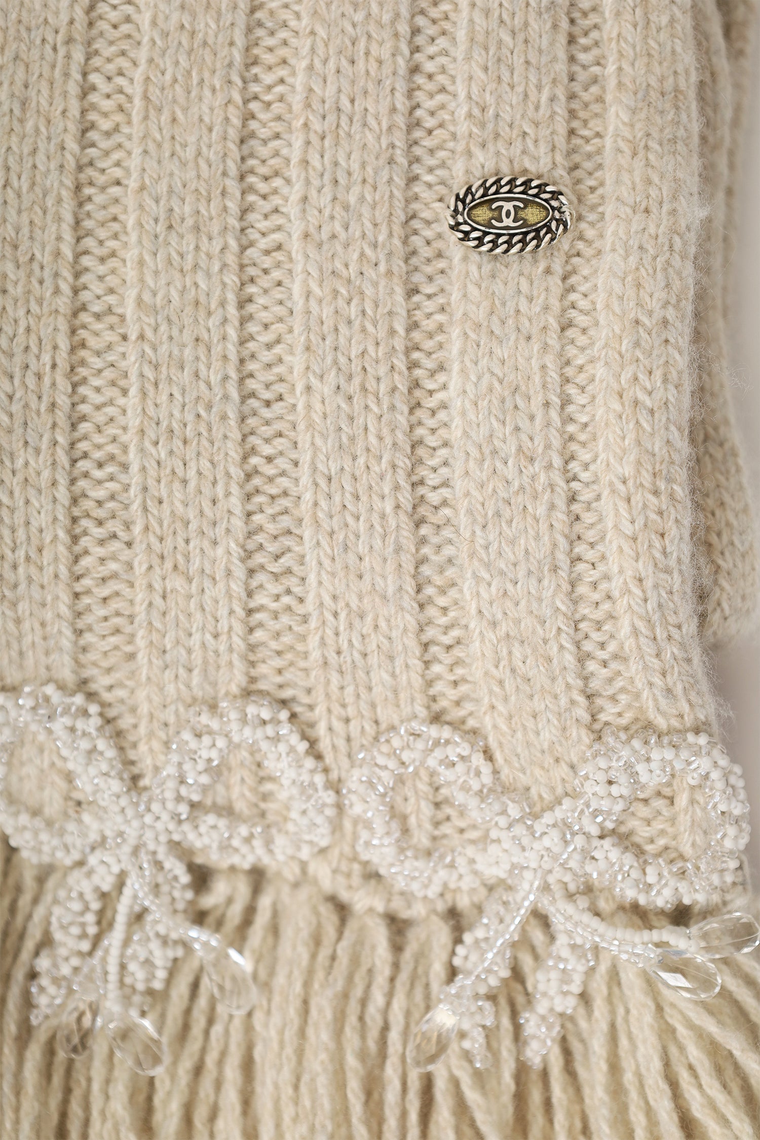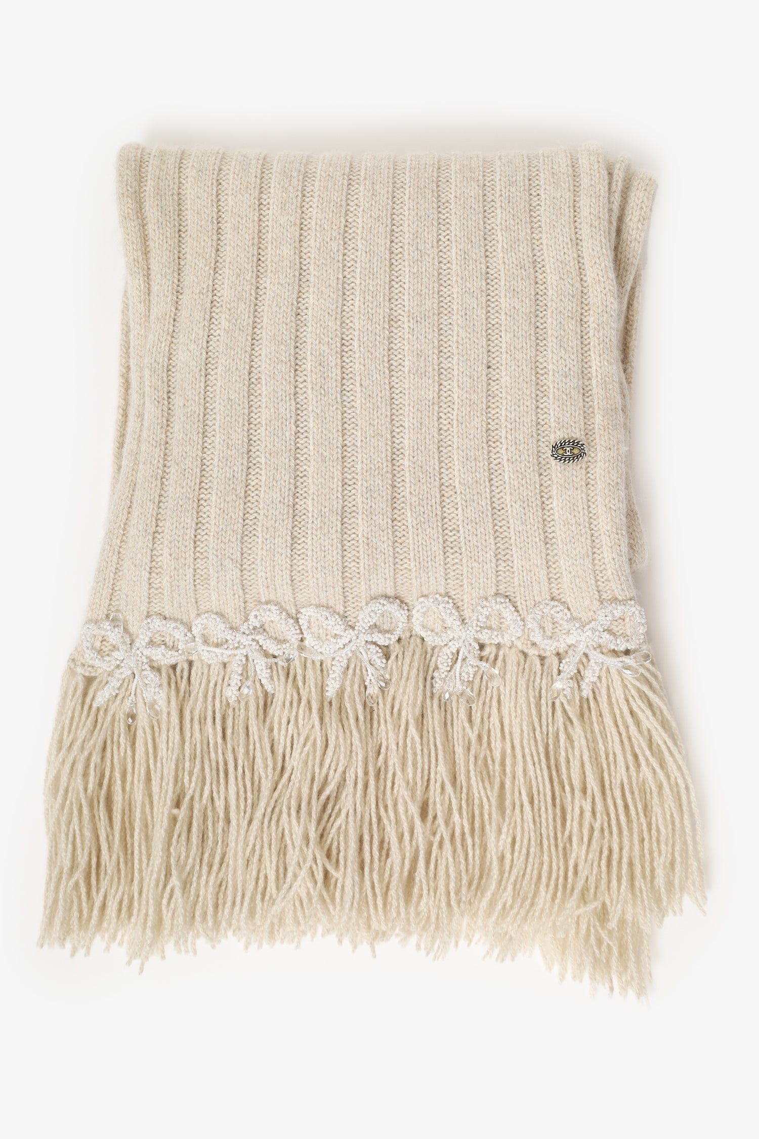 Pre-Loved Chanel™ Beige Cashmere Beaded Scarf. Pull-on. Fringe detail. Tonal stitching. Gold and silver-tone hardware.