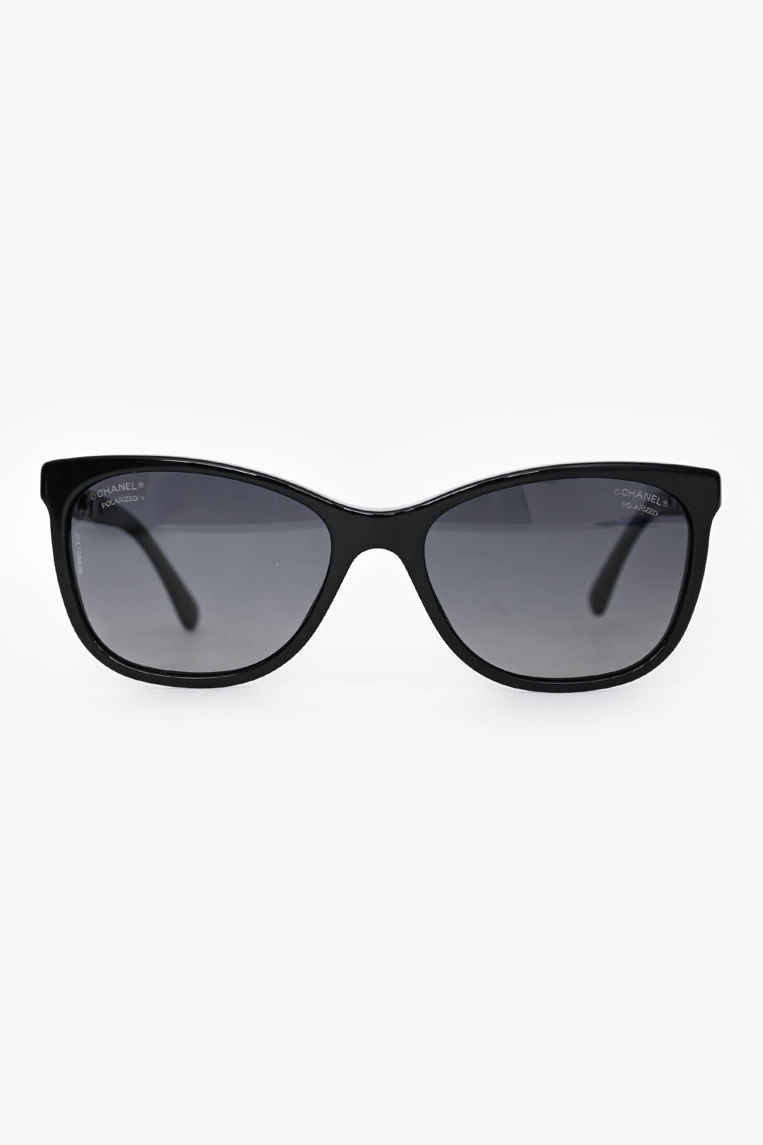 Pre-Loved Chanel™ Black Frame Wayfarer Leather Chain CC Polarized Sunglasses. Built-in nose pads.