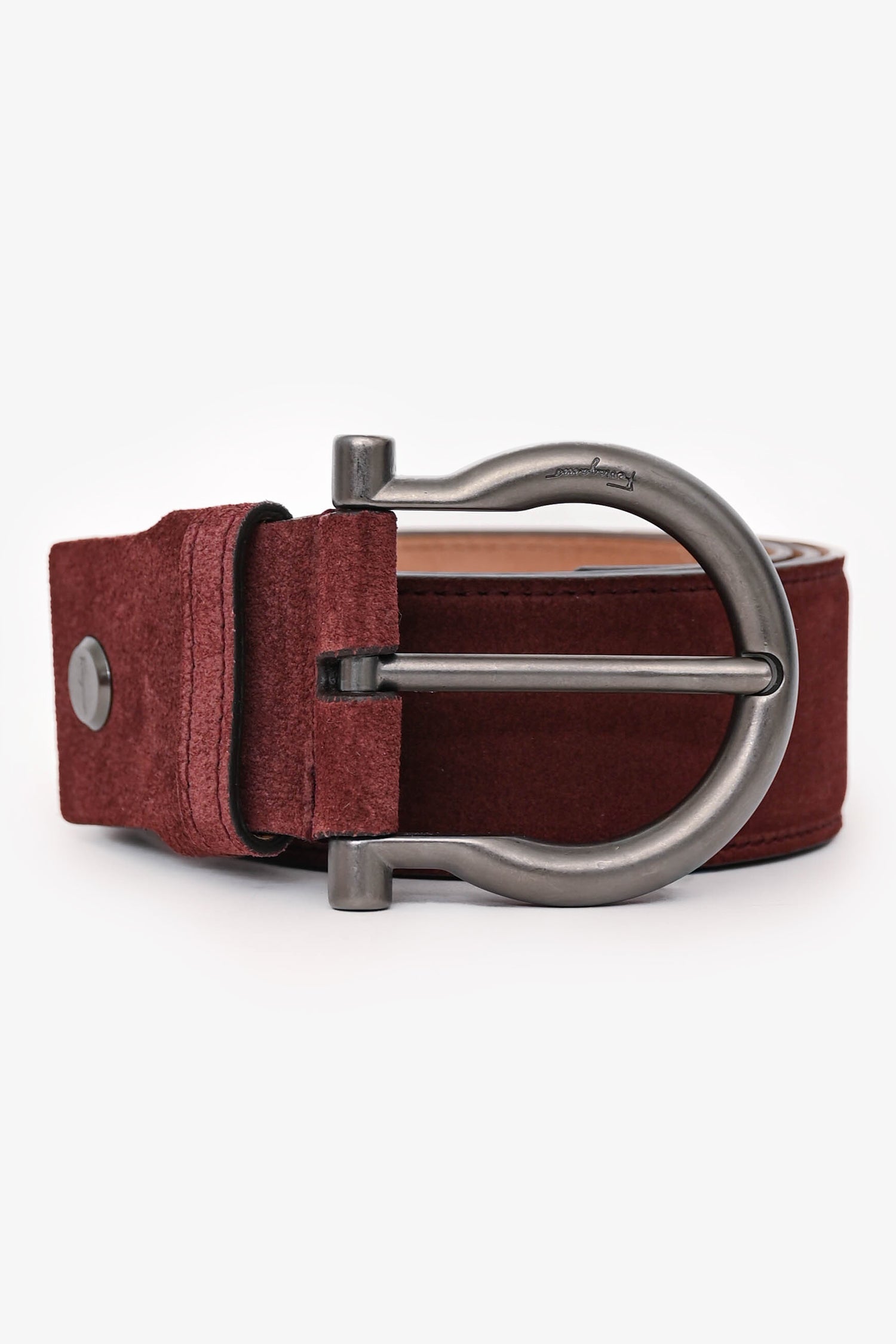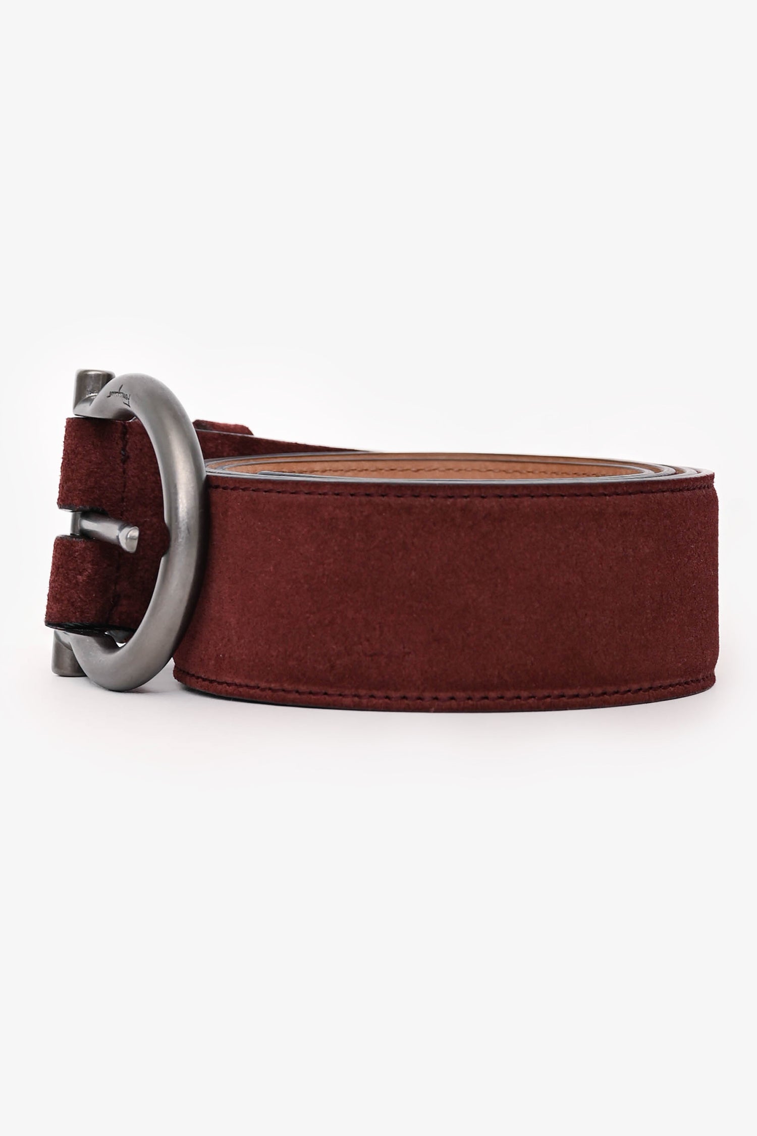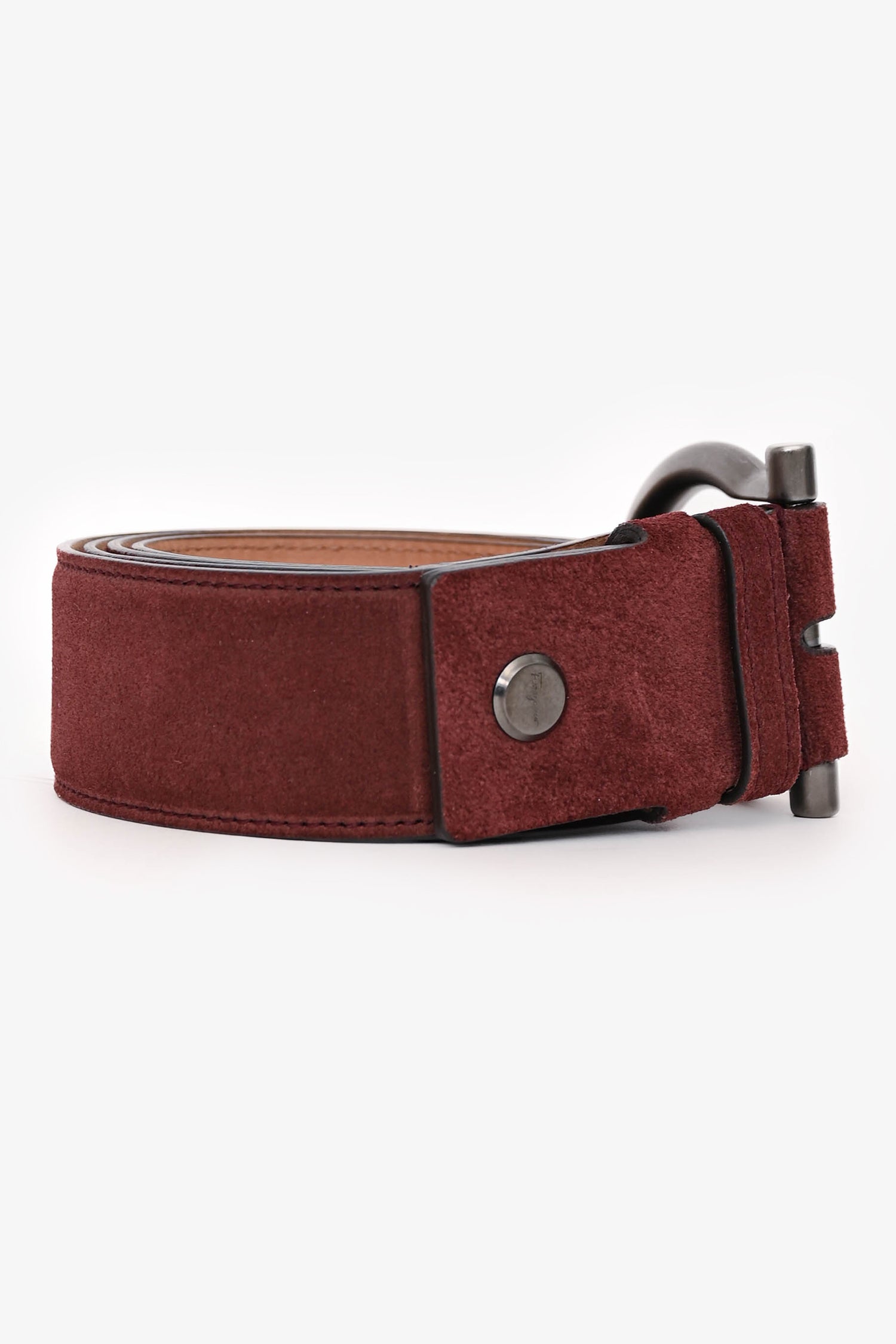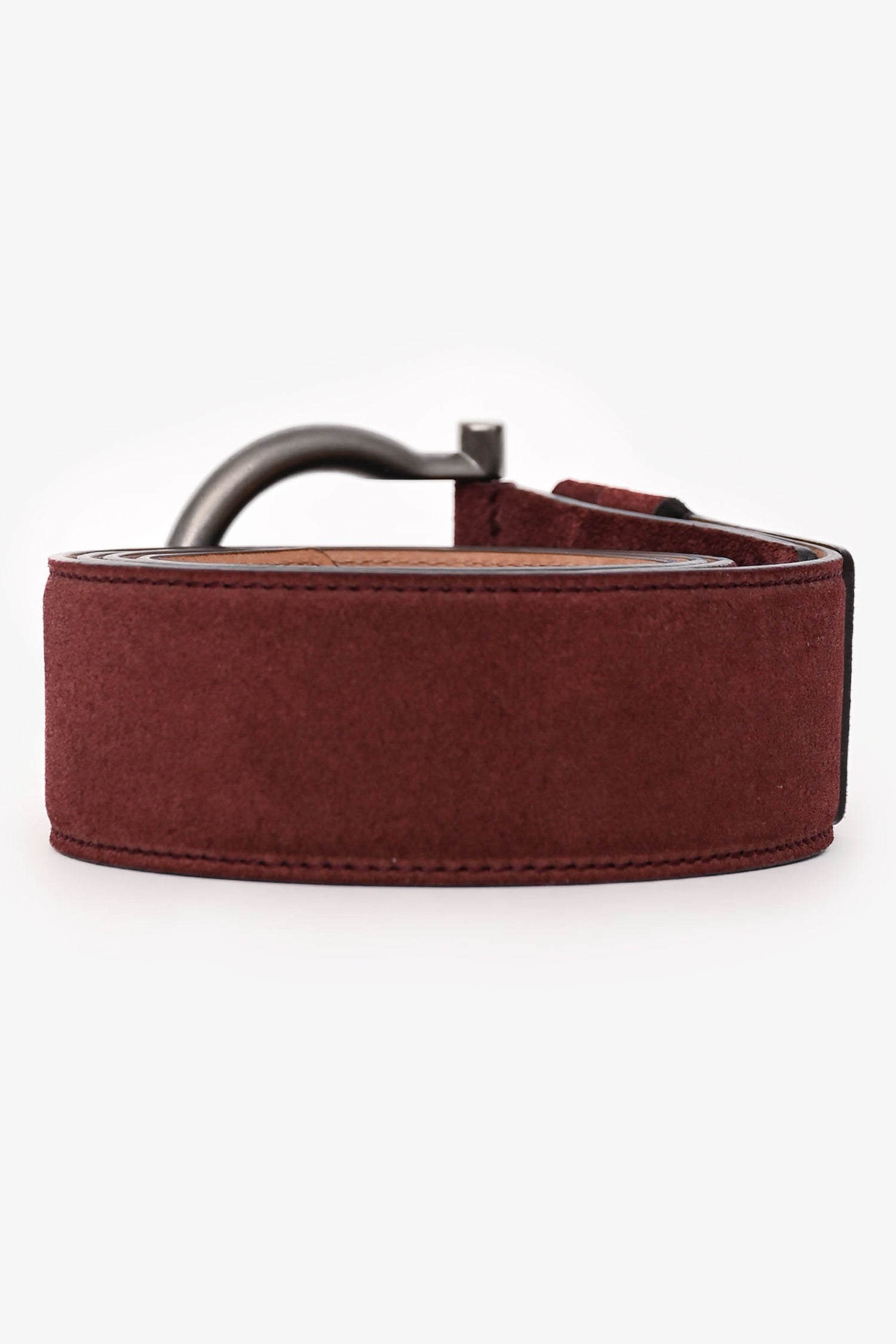 Salvatore Ferragamo Burgundy Suede Belt. Adjustable pull-through closure. Silver-tone hardware. Tonal stitching.