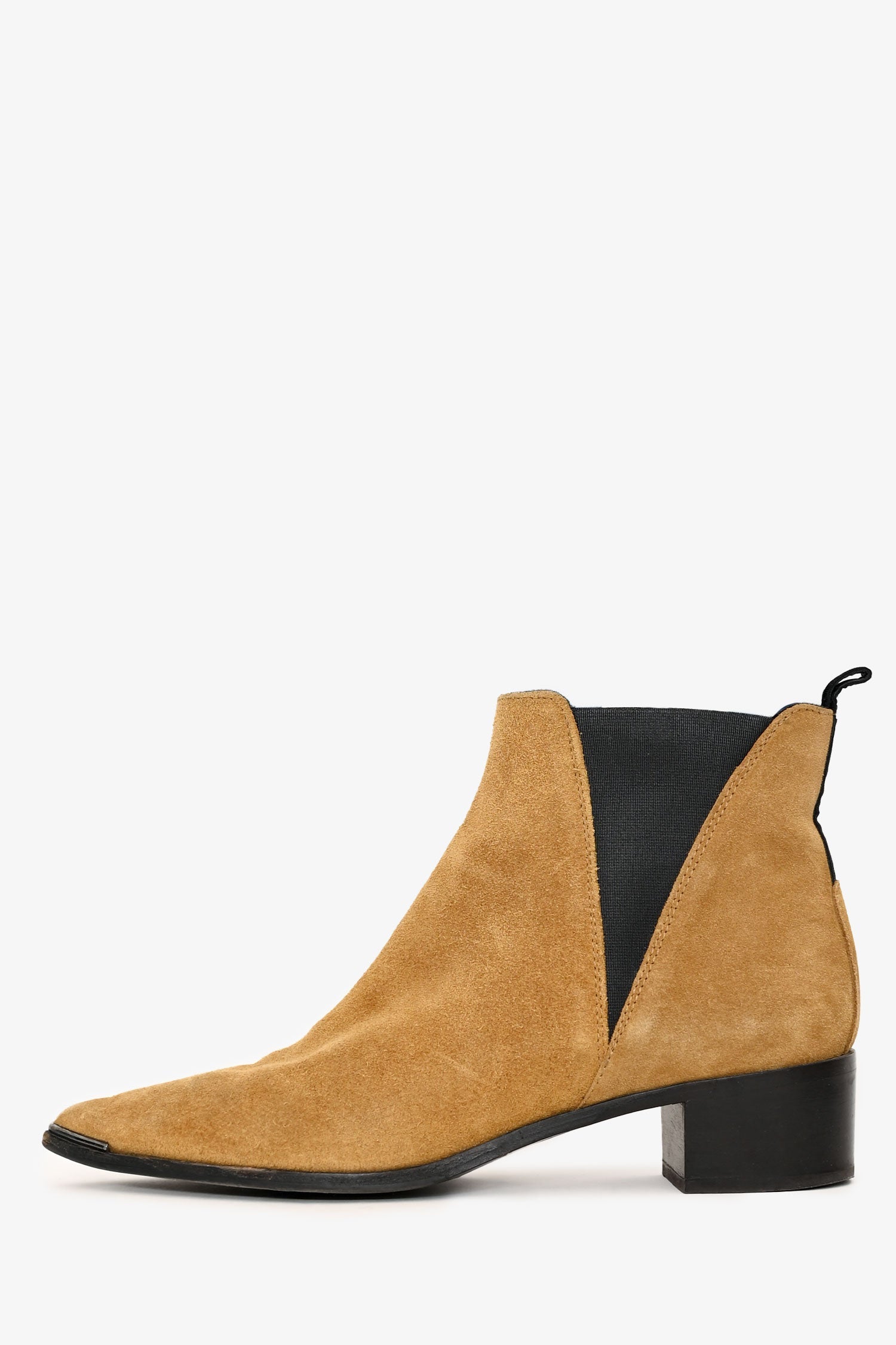 Acne Studios Brown Suede Leather Pointed Toe Ankle Boots. Pull-on. Pointed toe. Elasticized trims on the sides. Tonal stitching.