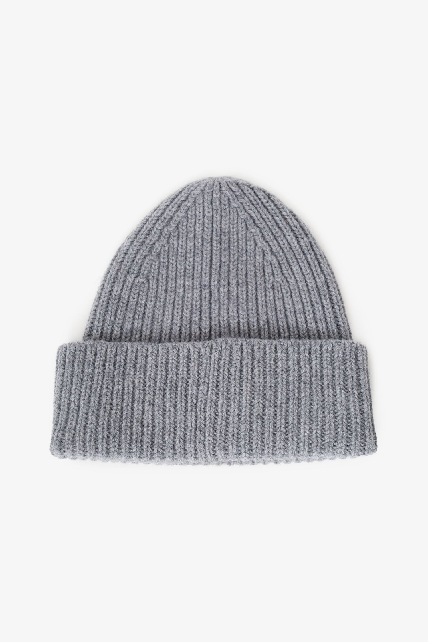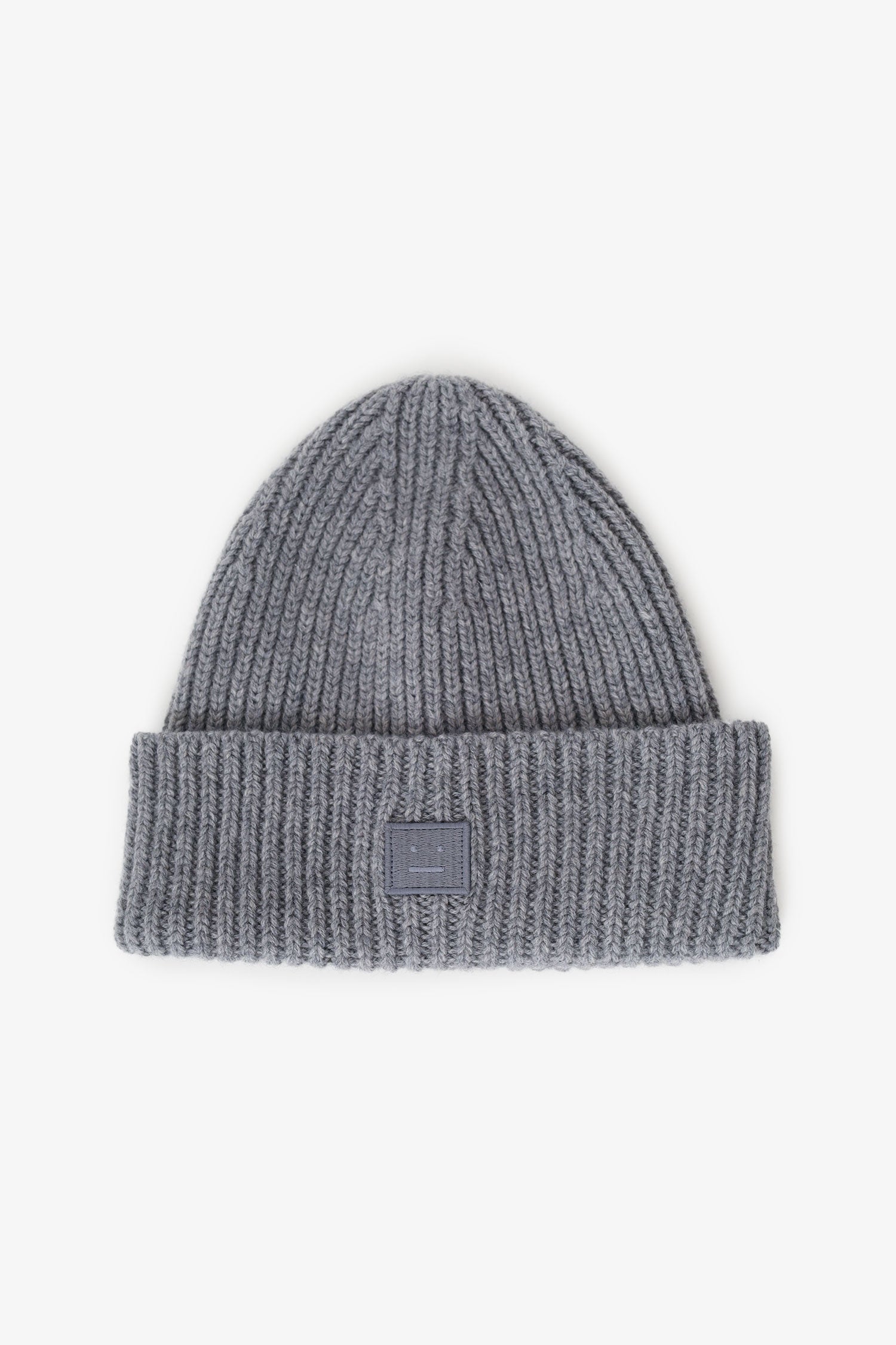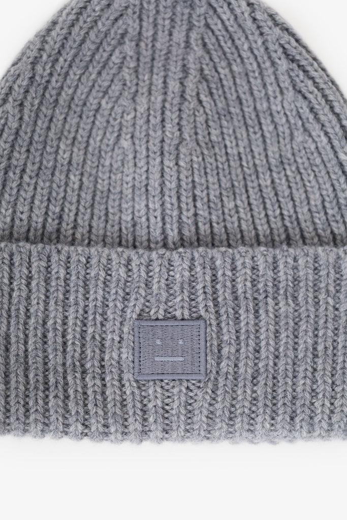 Acne Studios Grey Wool Knit Face Embroidered Beanie. Logo embellishment at front. Tonal stitching.