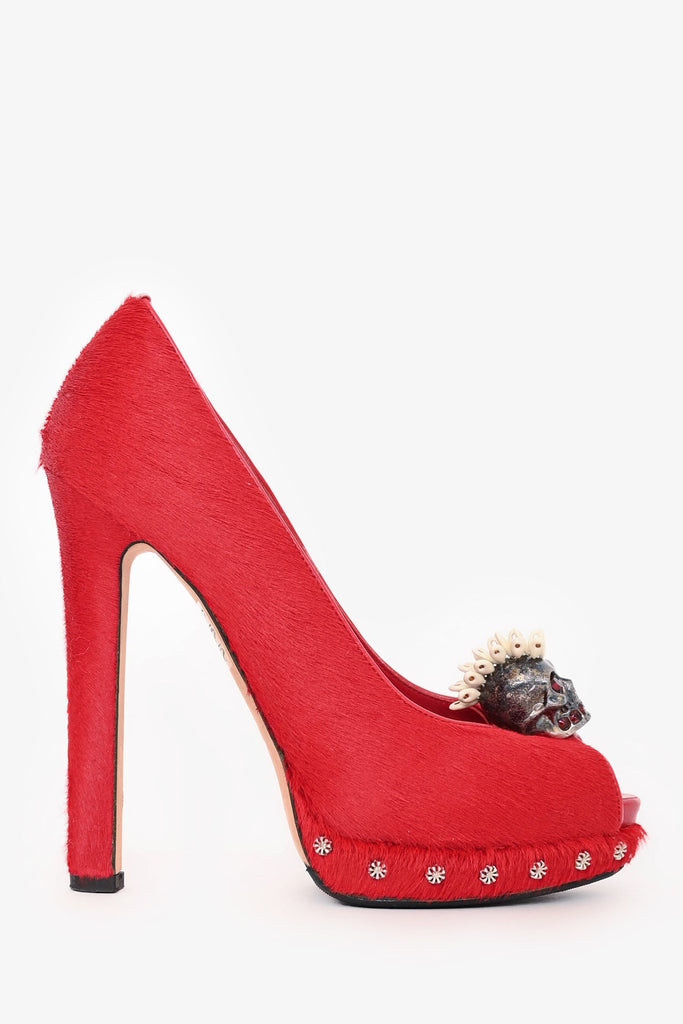 Alexander McQueen Red Ponyhair Calfskin Peep Toe Heels Size 36