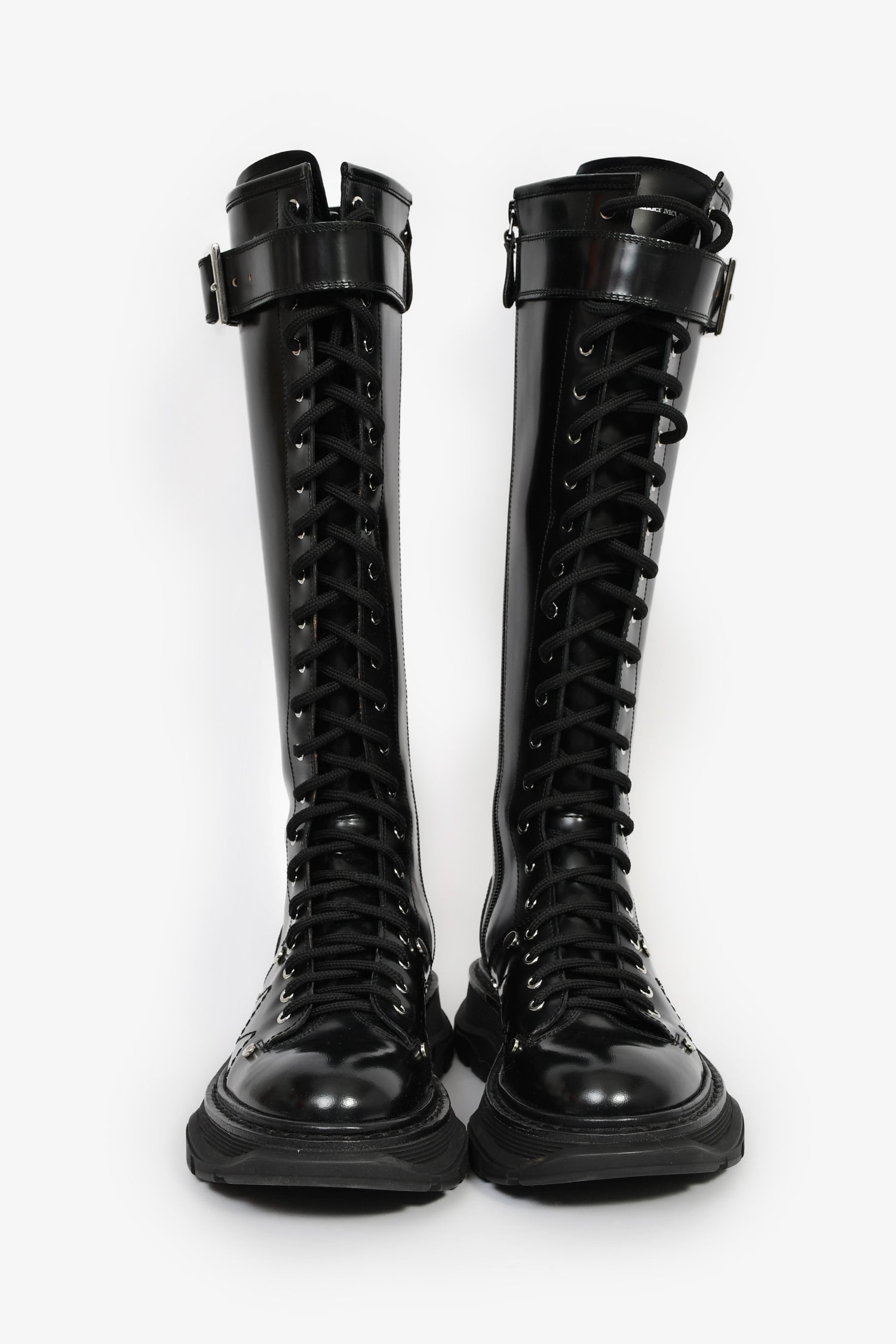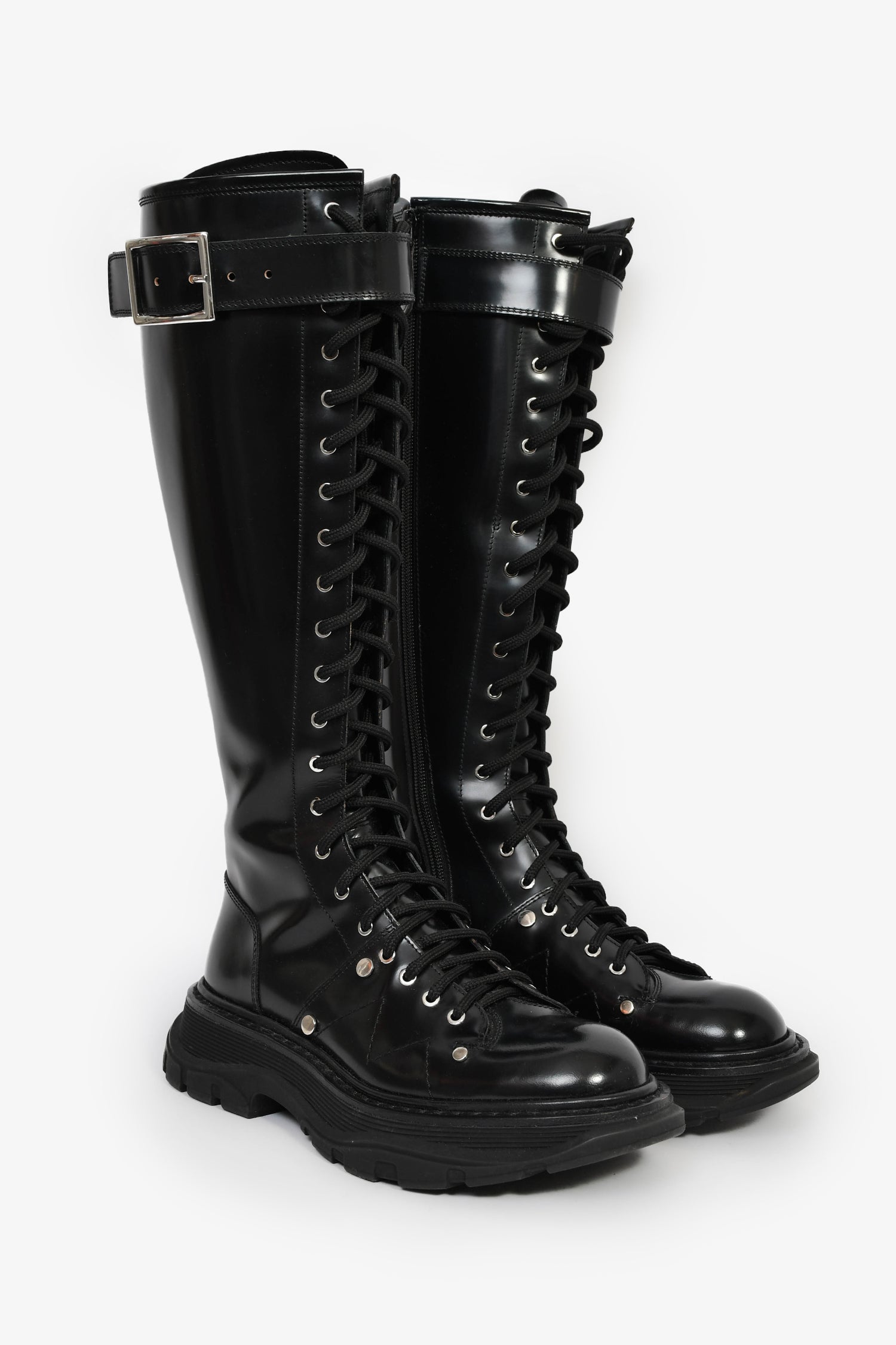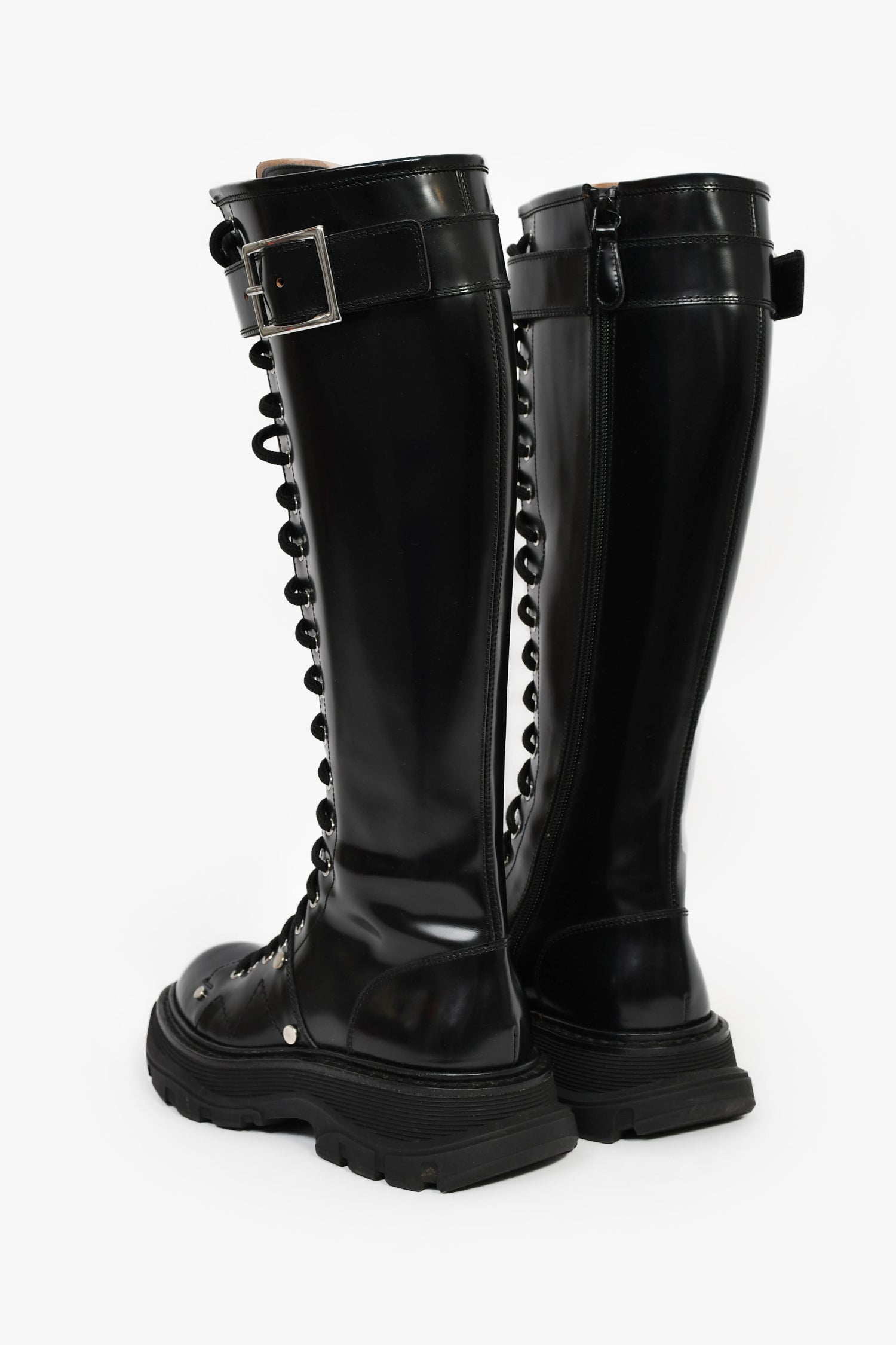 Alexander McQueen Black Leather Lace-Up Knee High Combat Boots. Pull-on. Round toe. Side zip and front lace-up closure. Silver-tone hardware. Tonal stitching.
