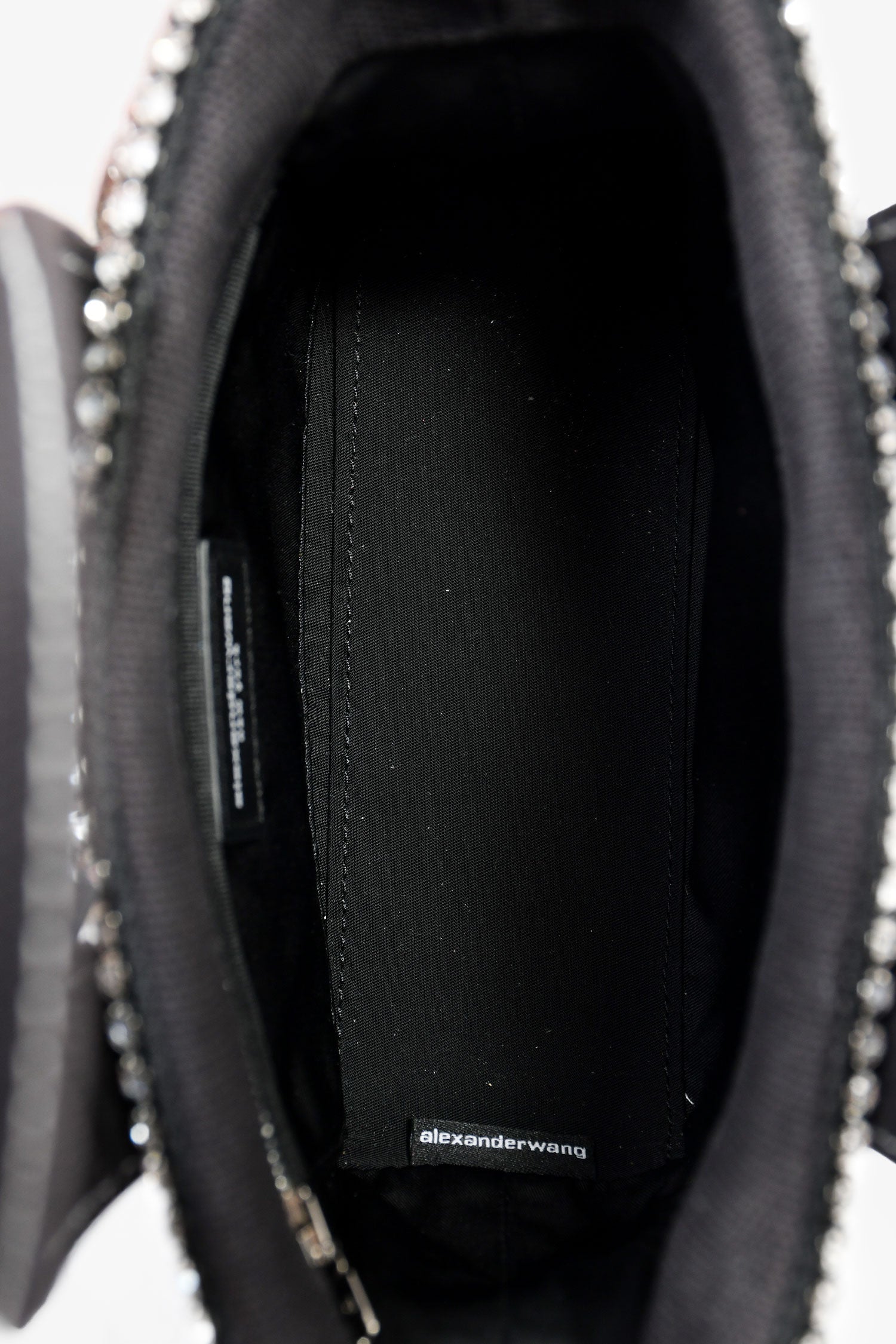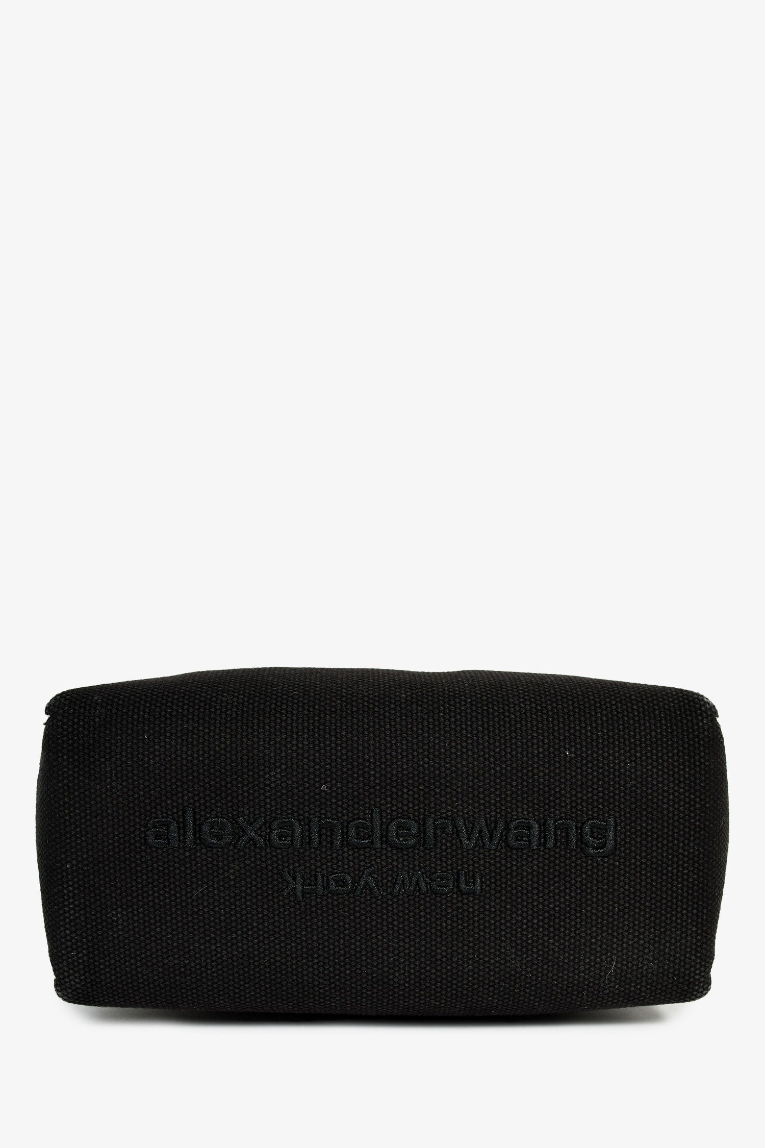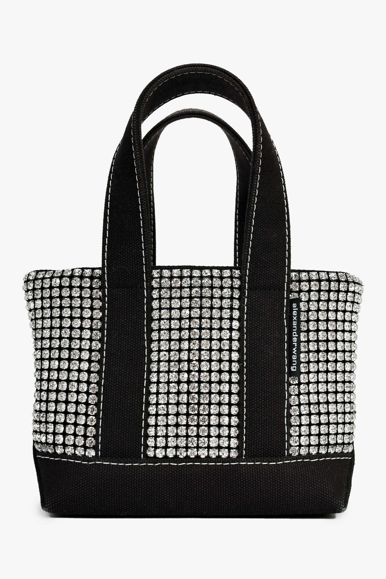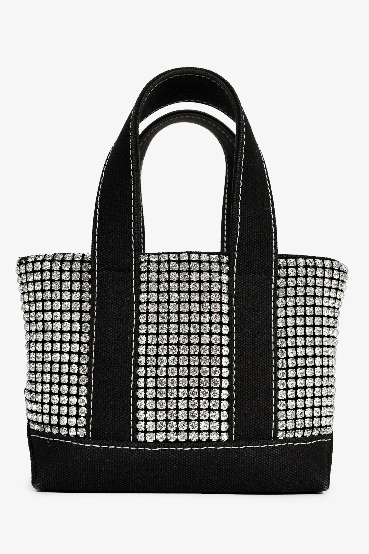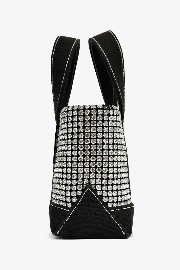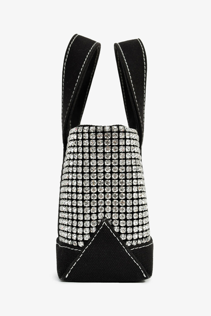 Alexander Wang Black Canvas/Crystal Top Handle Bag. Flat webbed top handles. Lined interior with single zip compartment. Embossed logo on bottom. Contrast stitching. Silver-tone hardware.