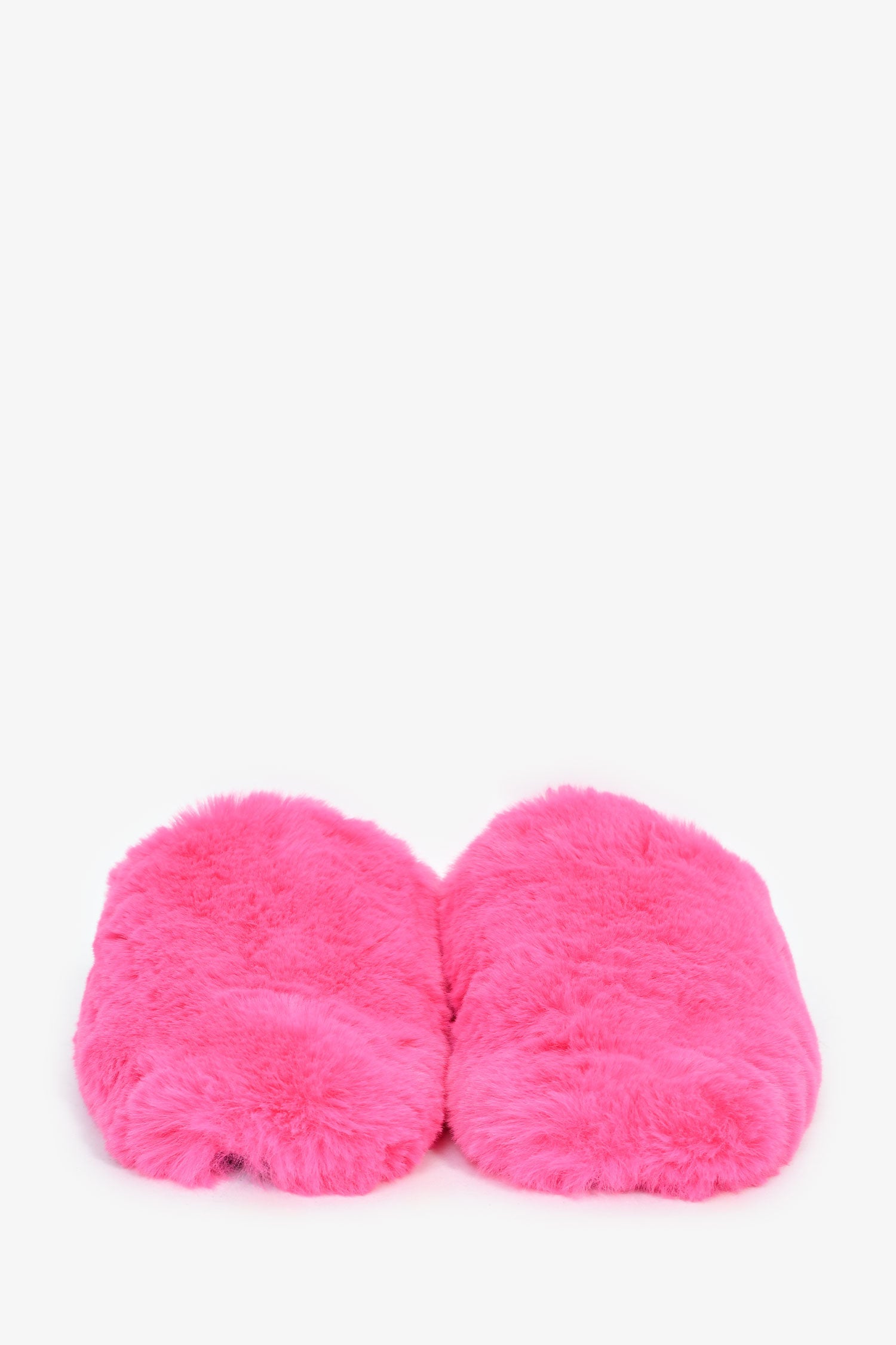 Balenciaga Pink Faux Fur Teddy Mules. Slip-on. Round toe. Metallic bottom soles. Tonal stitching.