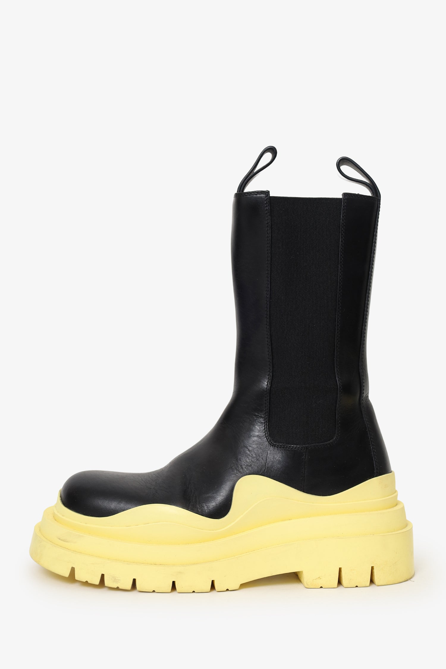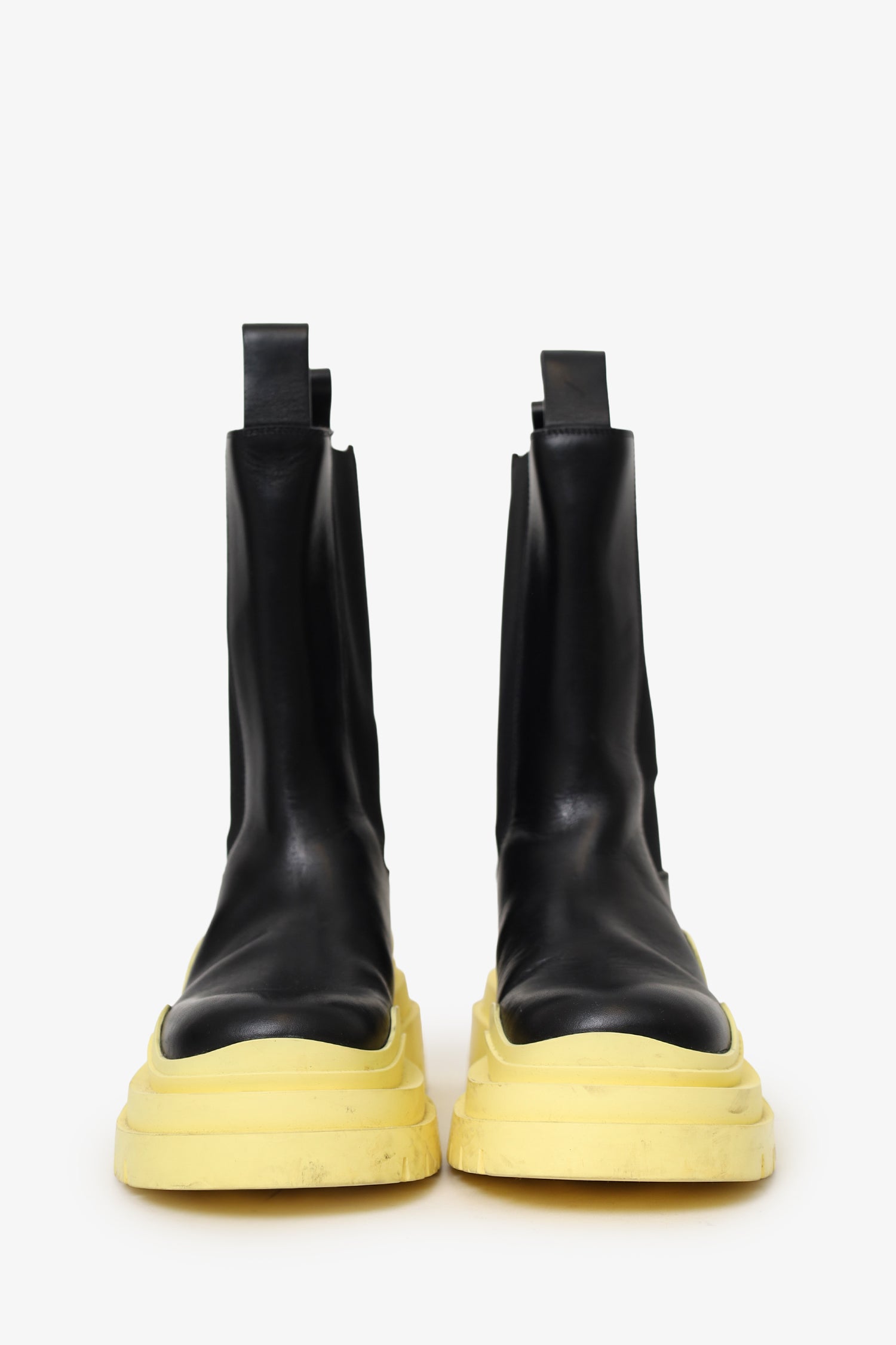 Bottega Veneta Black/Yellow Tire Chelsea Boots. Pull-on. Round-toe. Front and rear pull tabs. Lug soles. Elasticized panels at shaft. Tonal stitching.