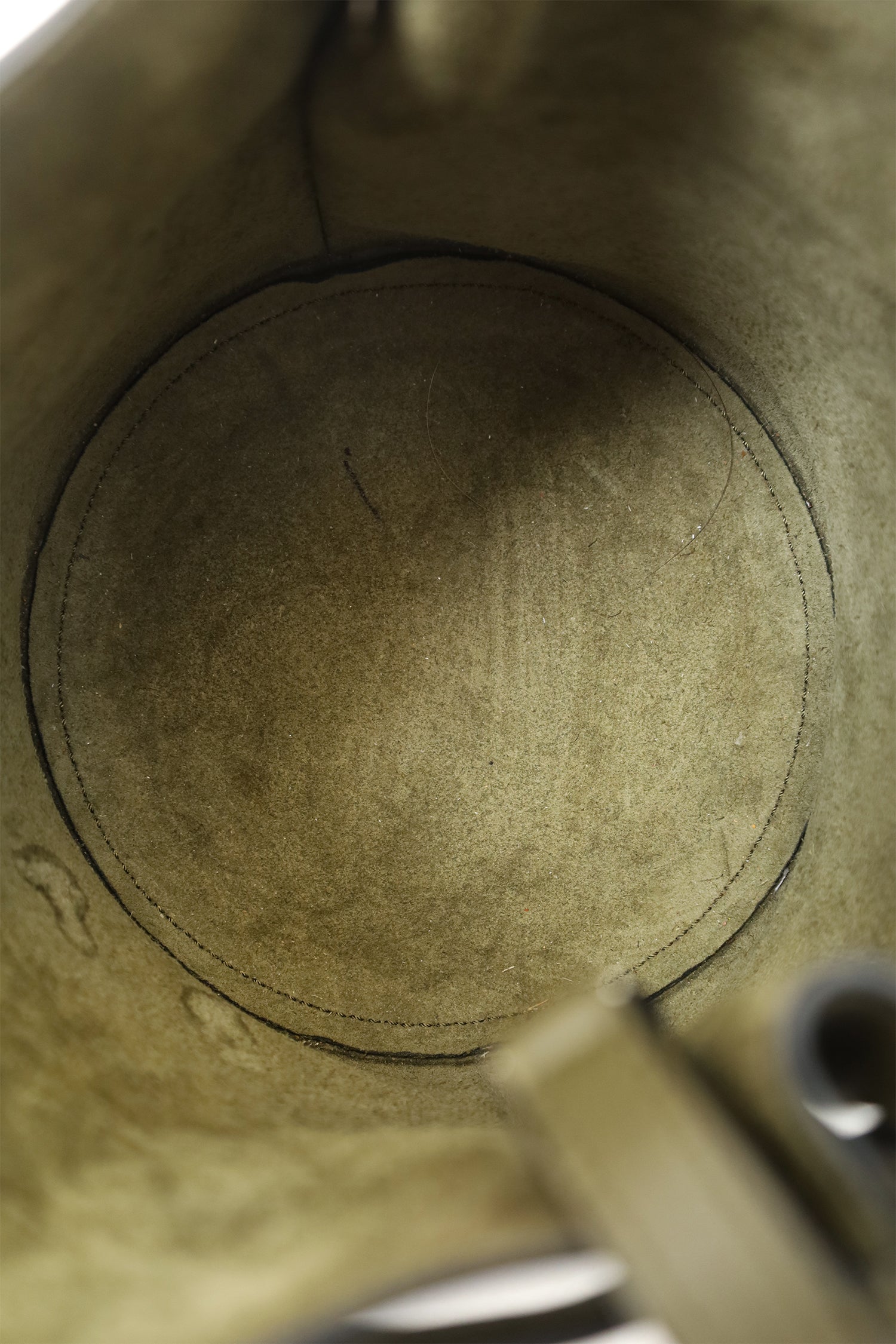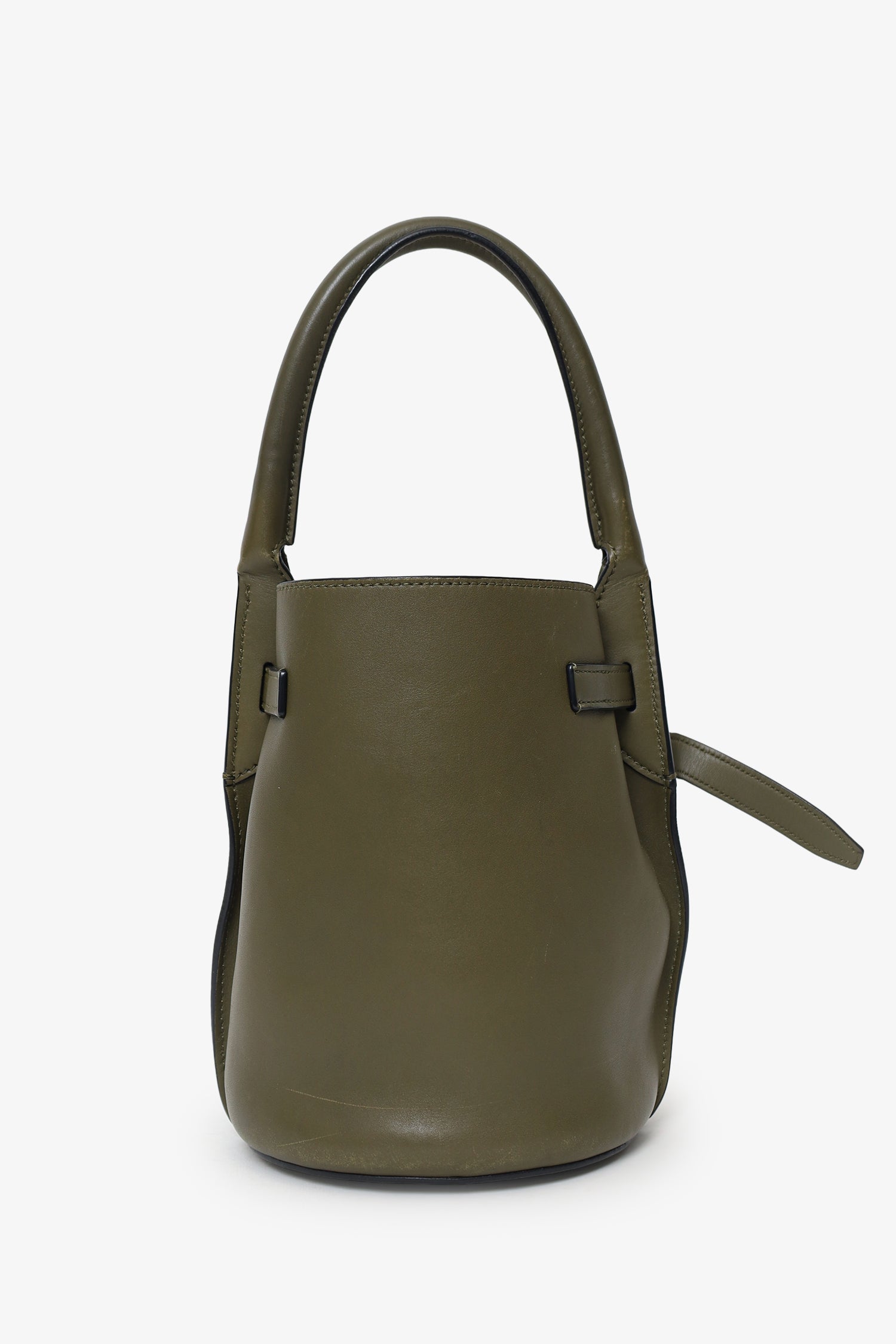 Celine Green Leather Nano Big Bucket Bag With Strap. Top handle. Adjustable and removable crossbody strap with clasp closure. Exterior adjustable pull-through buckle closure. Open interior. Silver-tone hardware. Tonal stitching.