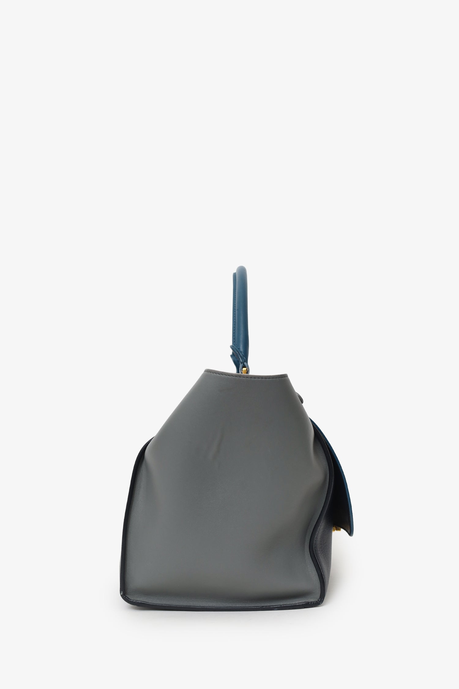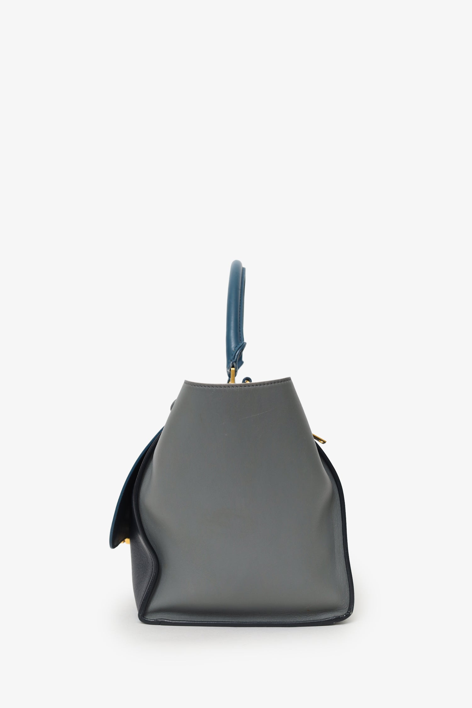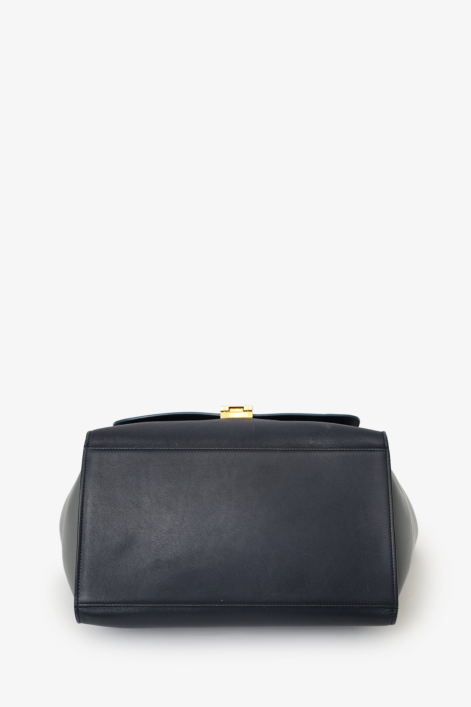 Celine Tri Color Leather Medium Trapeze Bag. Front fold-over flap with hinge lock closure. Top zip closure underneath fold-over flap. Single top handle. Removable shoulder strap with clasp closure. Single exterior wall zip pocket. 2 interior wall slip pockets. Gold-tone hardware. Tonal stitching.
