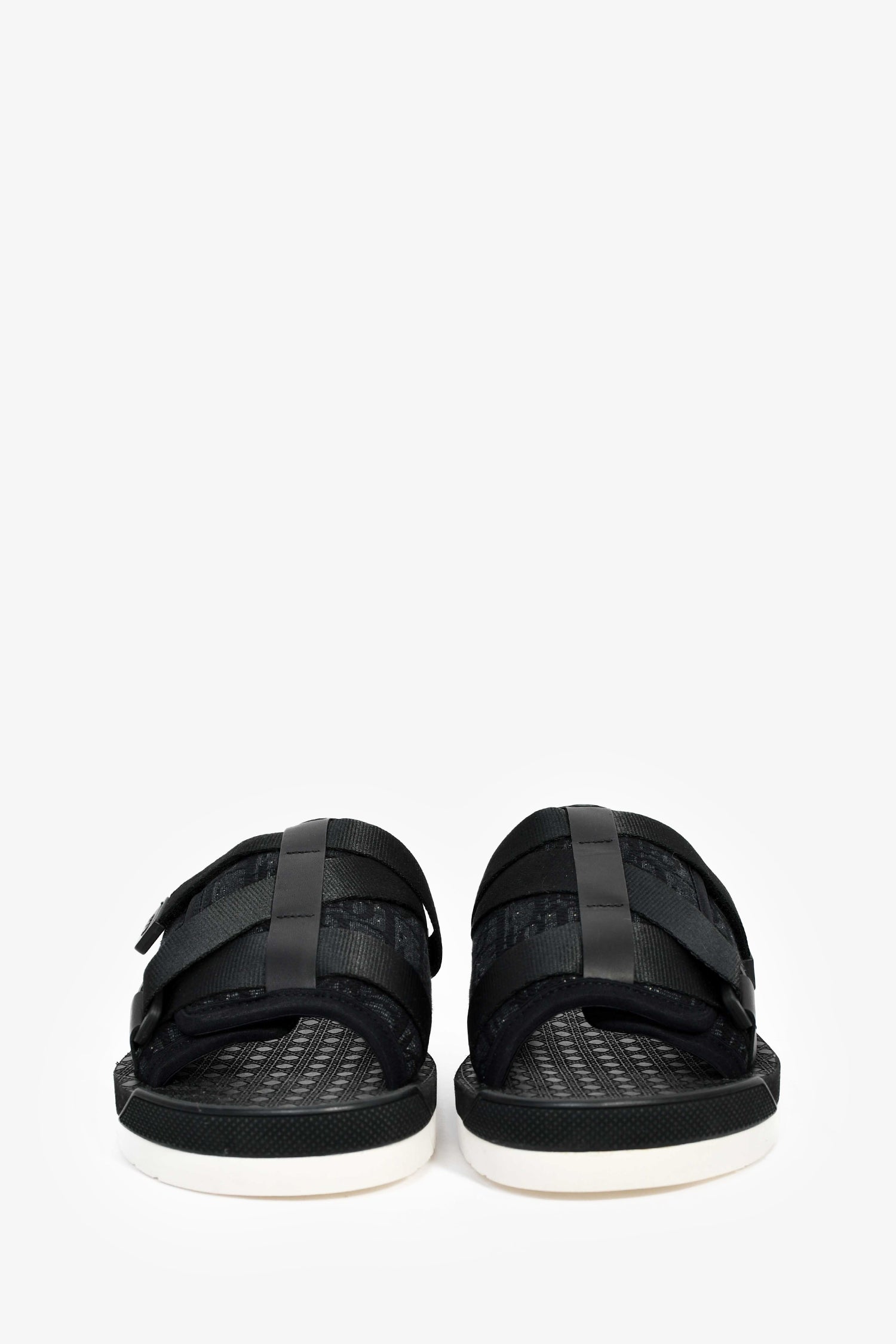 Christian Dior Black Oblique Jacquard 'Alpha' Sandals. Slip-on. Webbed velcro strap. Rubber soles. Tonal stitching.