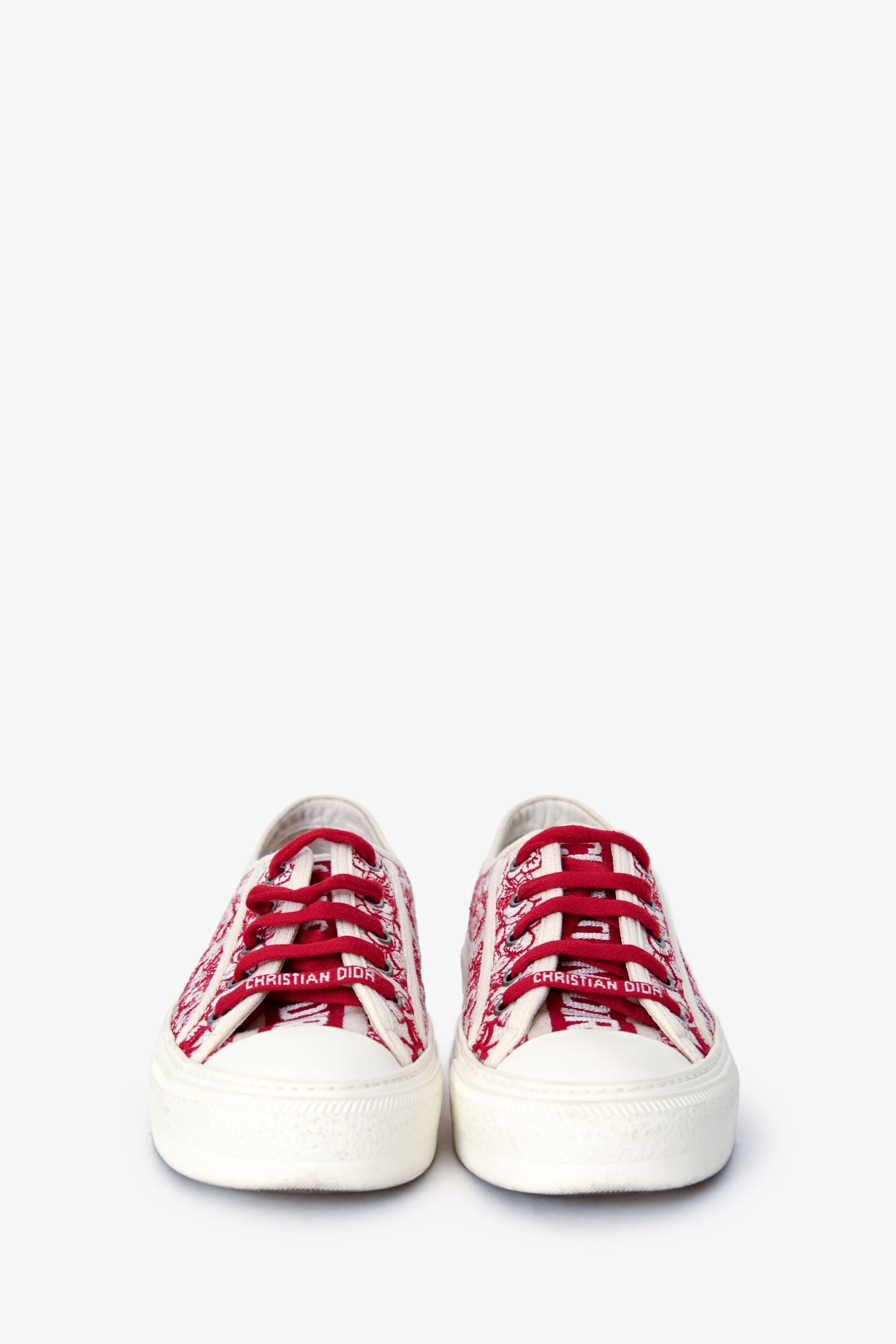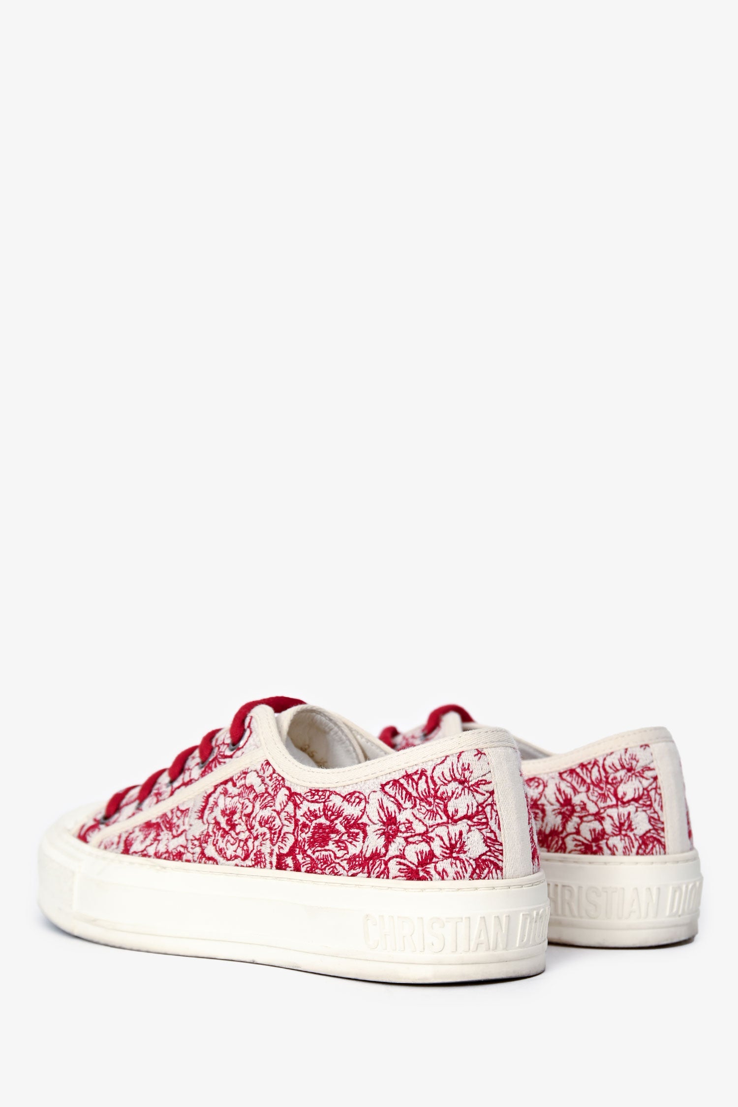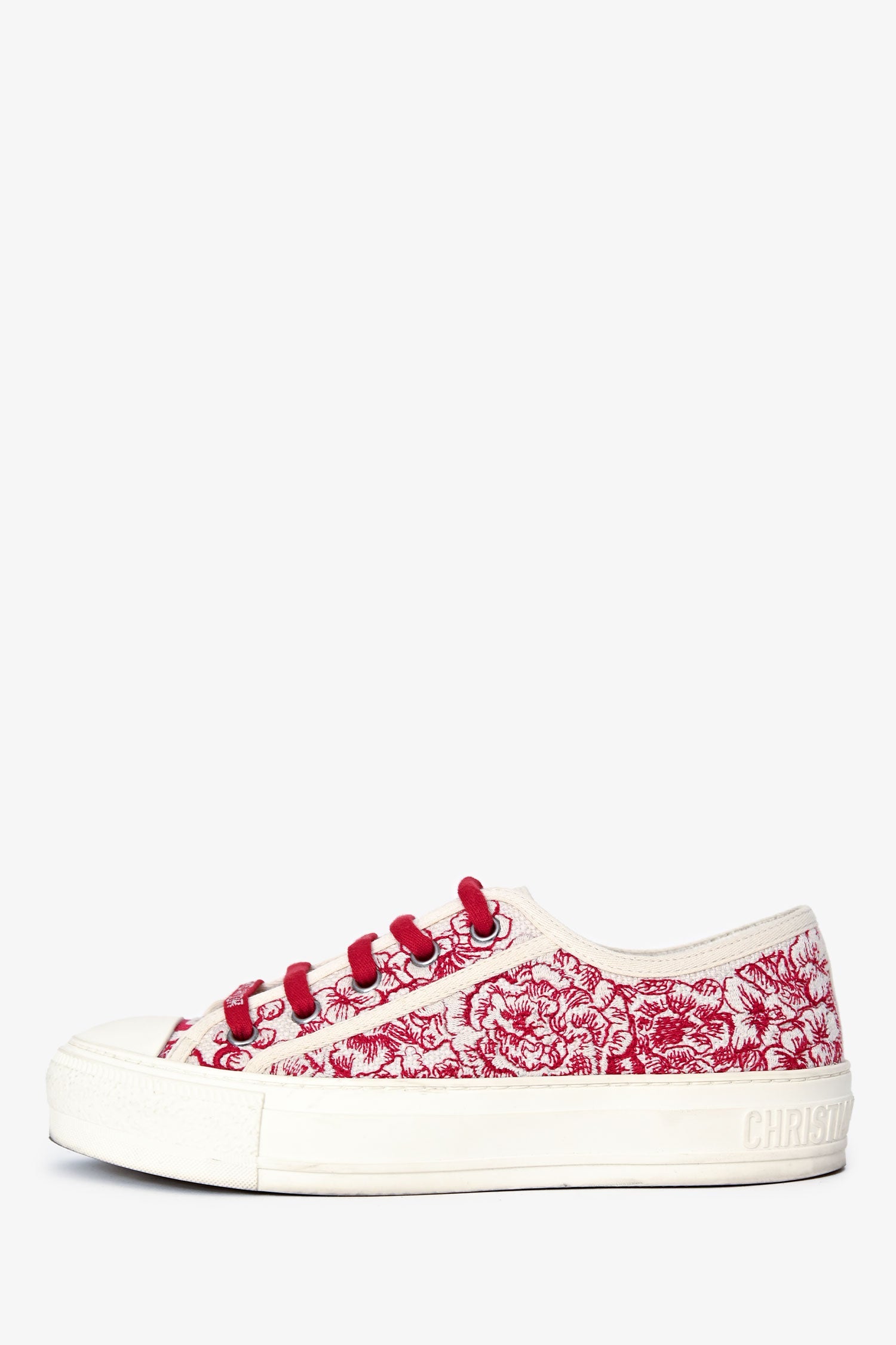 Christian Dior White/Red Floral Embroidered Walk’N’Dior Sneakers. Lace-up. Round toe. Leather insole. Fabric-lined interior. Silver-tone hardware. Tonal stitching.