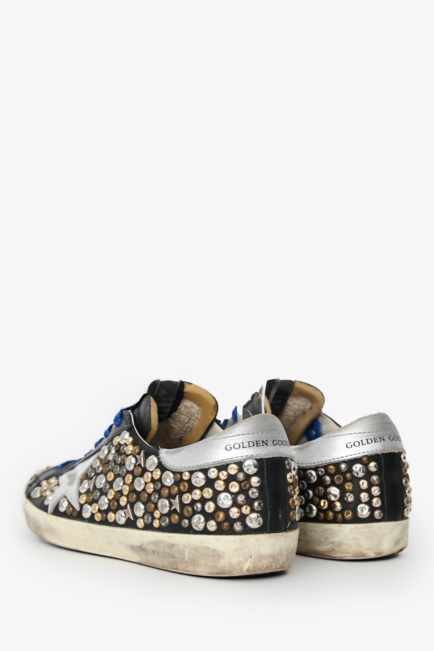 Golden Goose Black Leather Metallic Stud Sneakers. Slip-on. Round toe. Lace-up closures. Leather insoles. Rubber soles. Silver and gold-tone hardware. Tonal stitching.