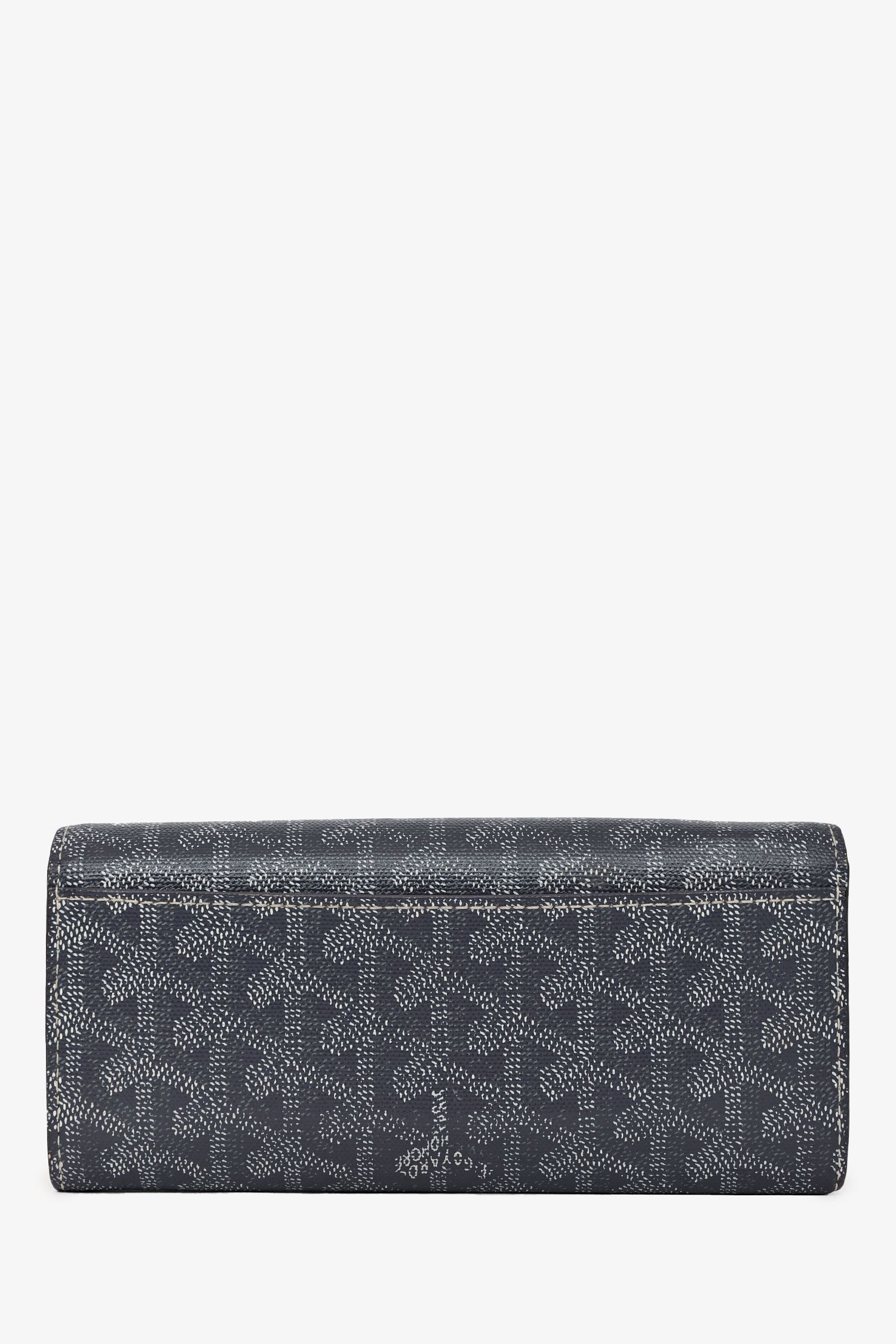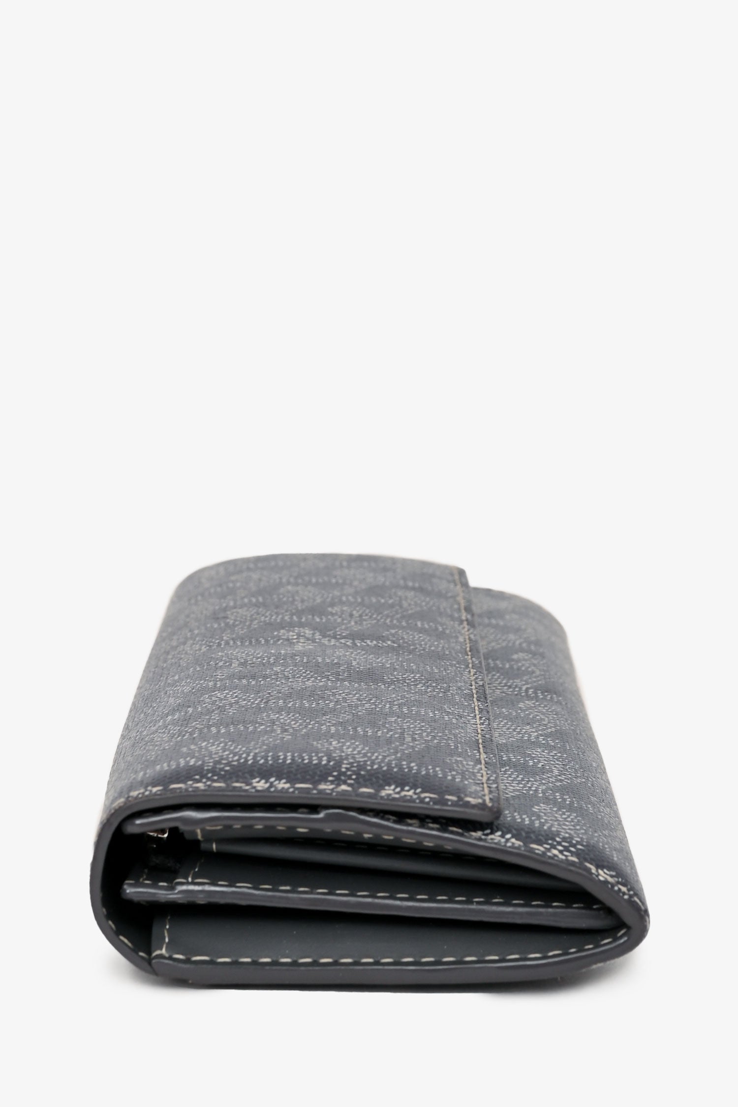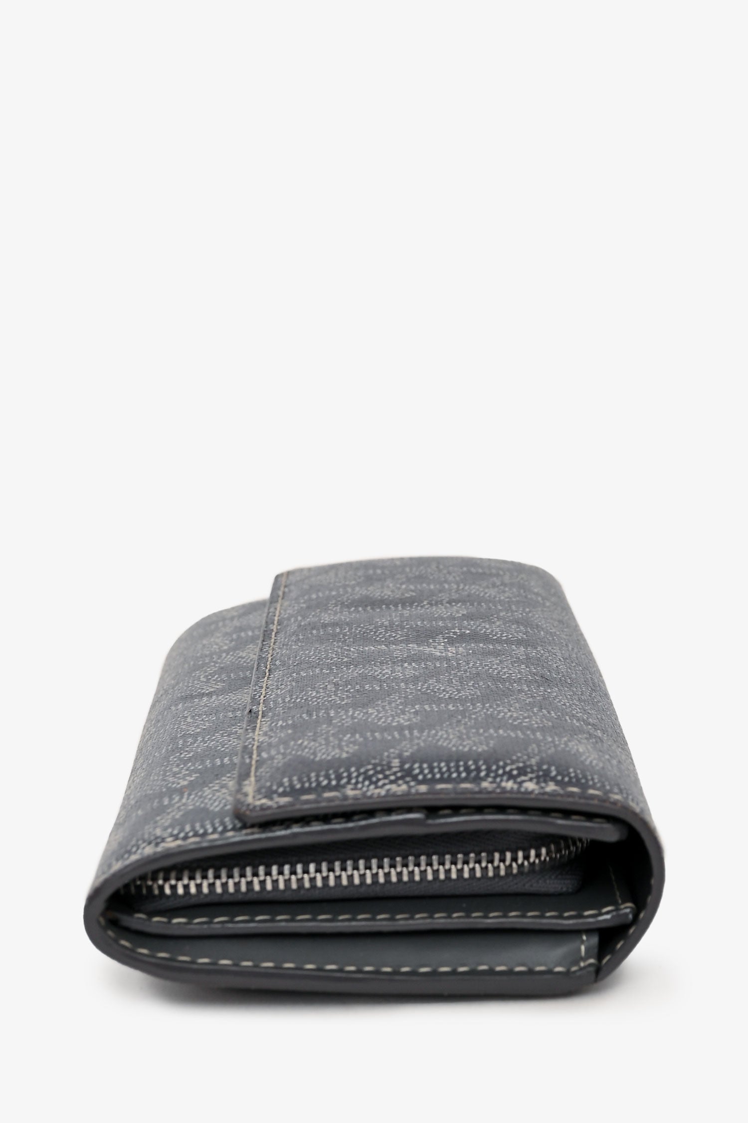 Goyard Grey Canvas/Leather Goyardine Long Wallet. Snap button closure. Multiple interior card slots, bill compartments, and zip coin pocket. Single exterior slip pocket. Silver-tone hardware. Tonal stitching.