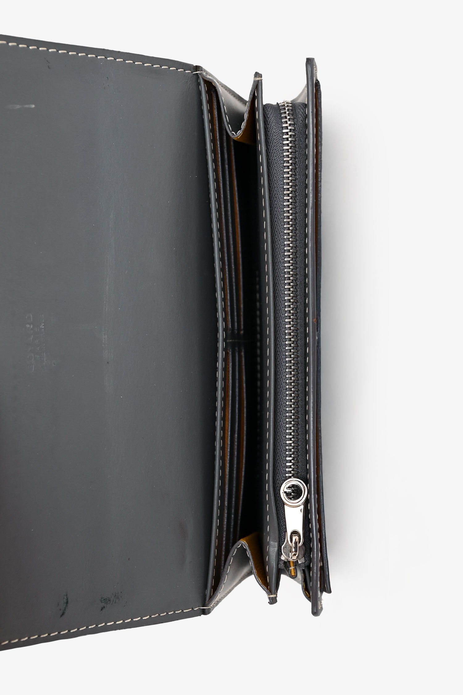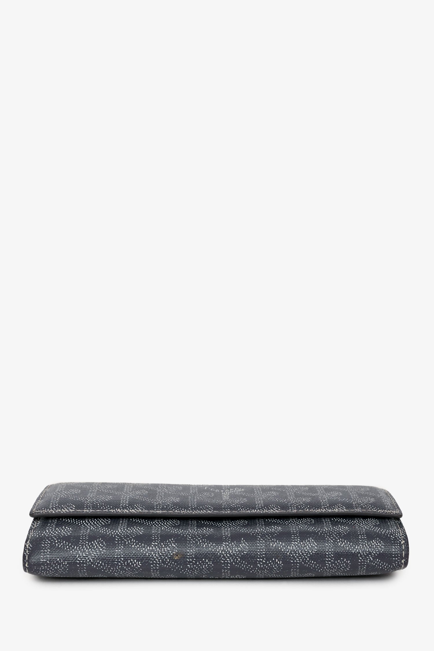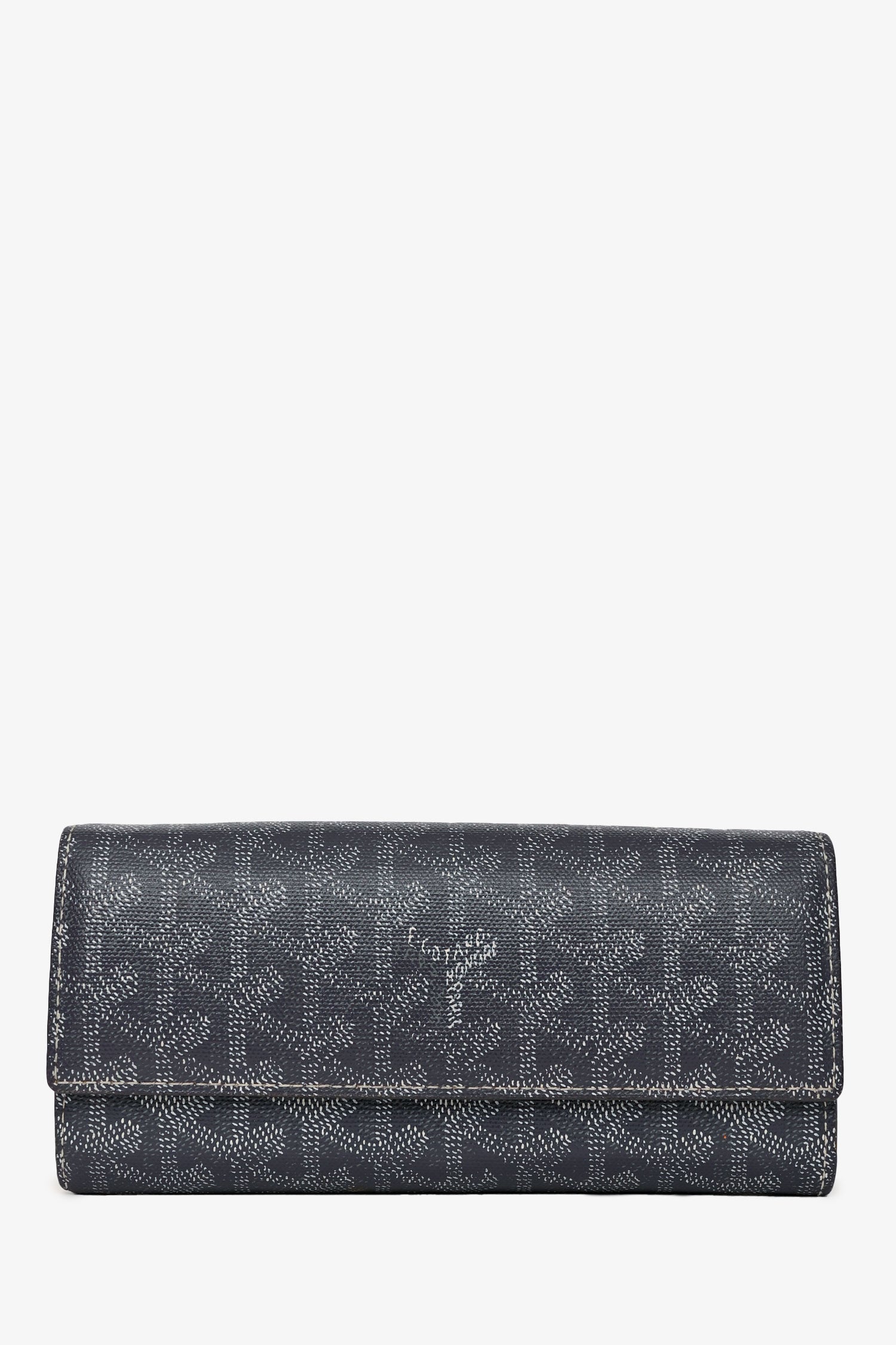 Goyard Grey Canvas/Leather Goyardine Long Wallet. Snap button closure. Multiple interior card slots, bill compartments, and zip coin pocket. Single exterior slip pocket. Silver-tone hardware. Tonal stitching.