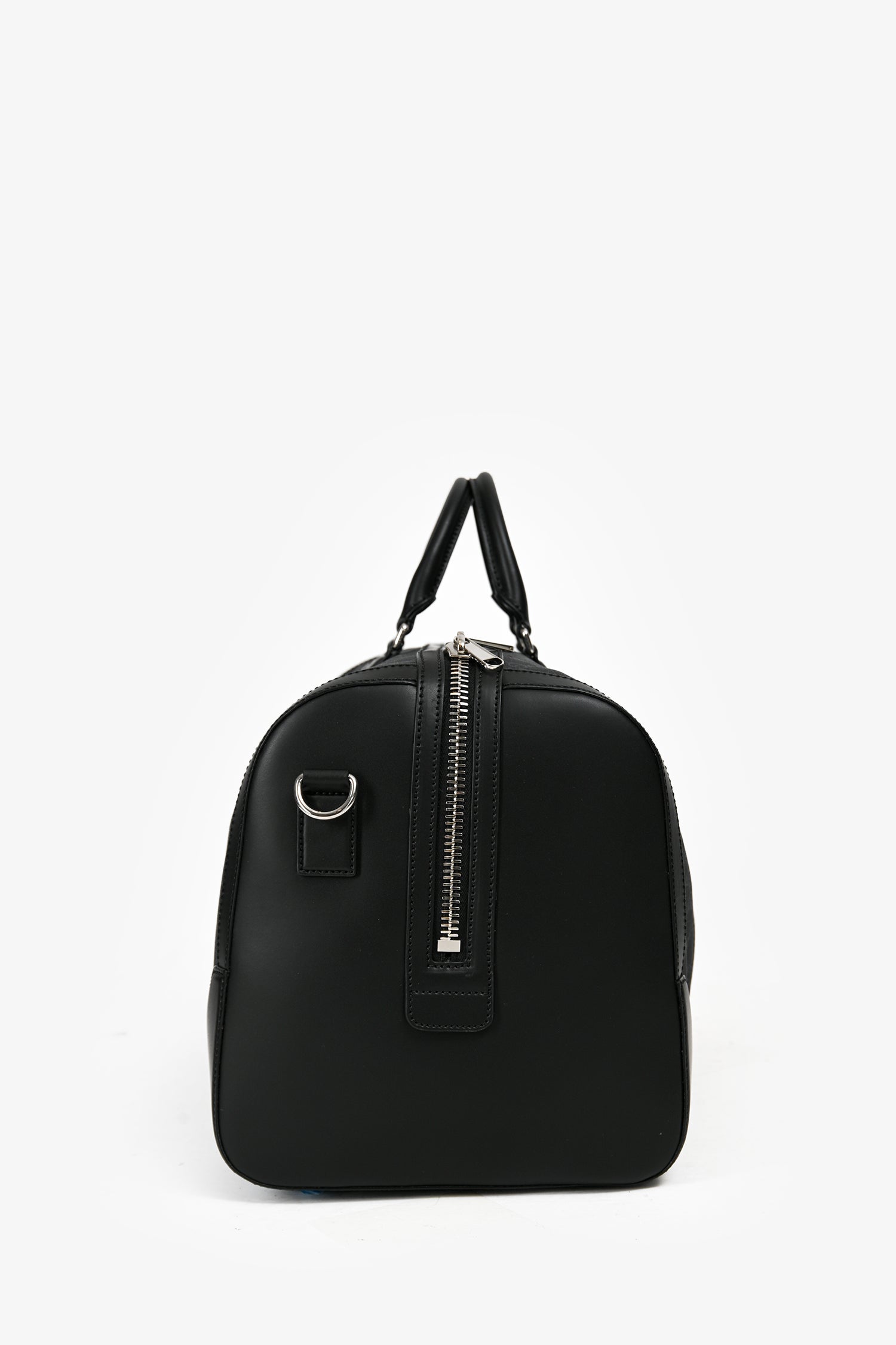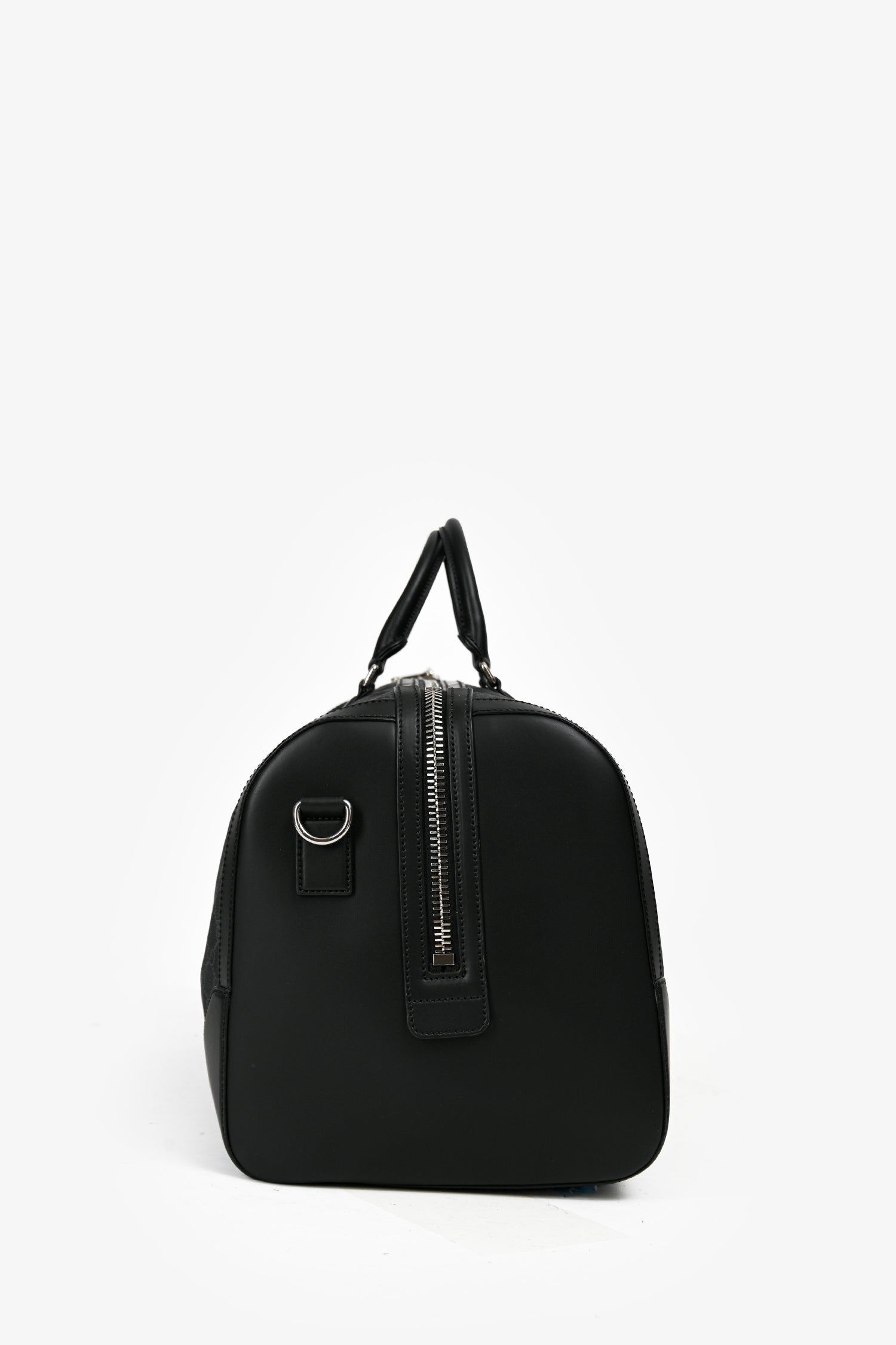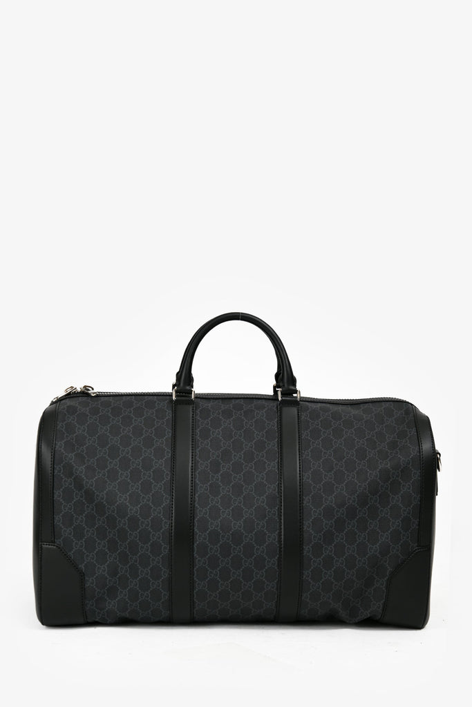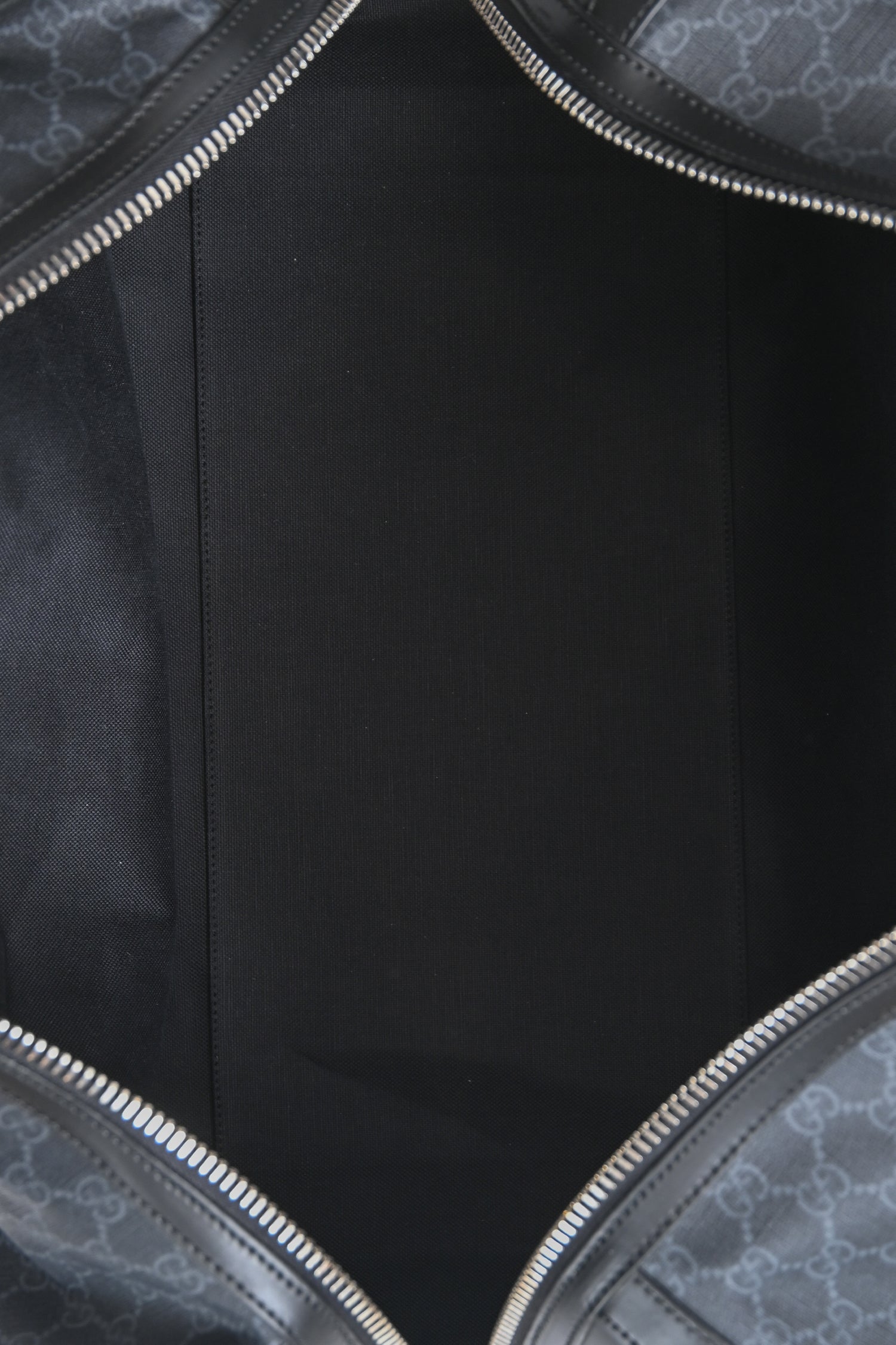 Gucci Black GG Supreme Canvas Leather Trimmed Large Duffle Bag with Web Canvas Shoulder Strap. Two-way zip closure. Dual leather top handles. Detachable/adjustable web canvas shoulder strap with leather shoulder rest. 1 interior compartment with 1 interior zip pocket. Silver-tone hardware. Tonal stitching.