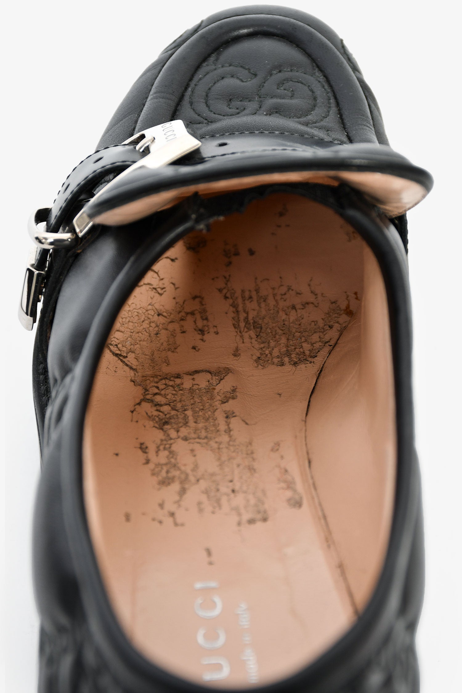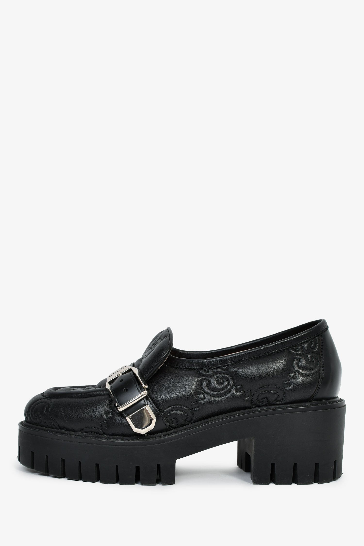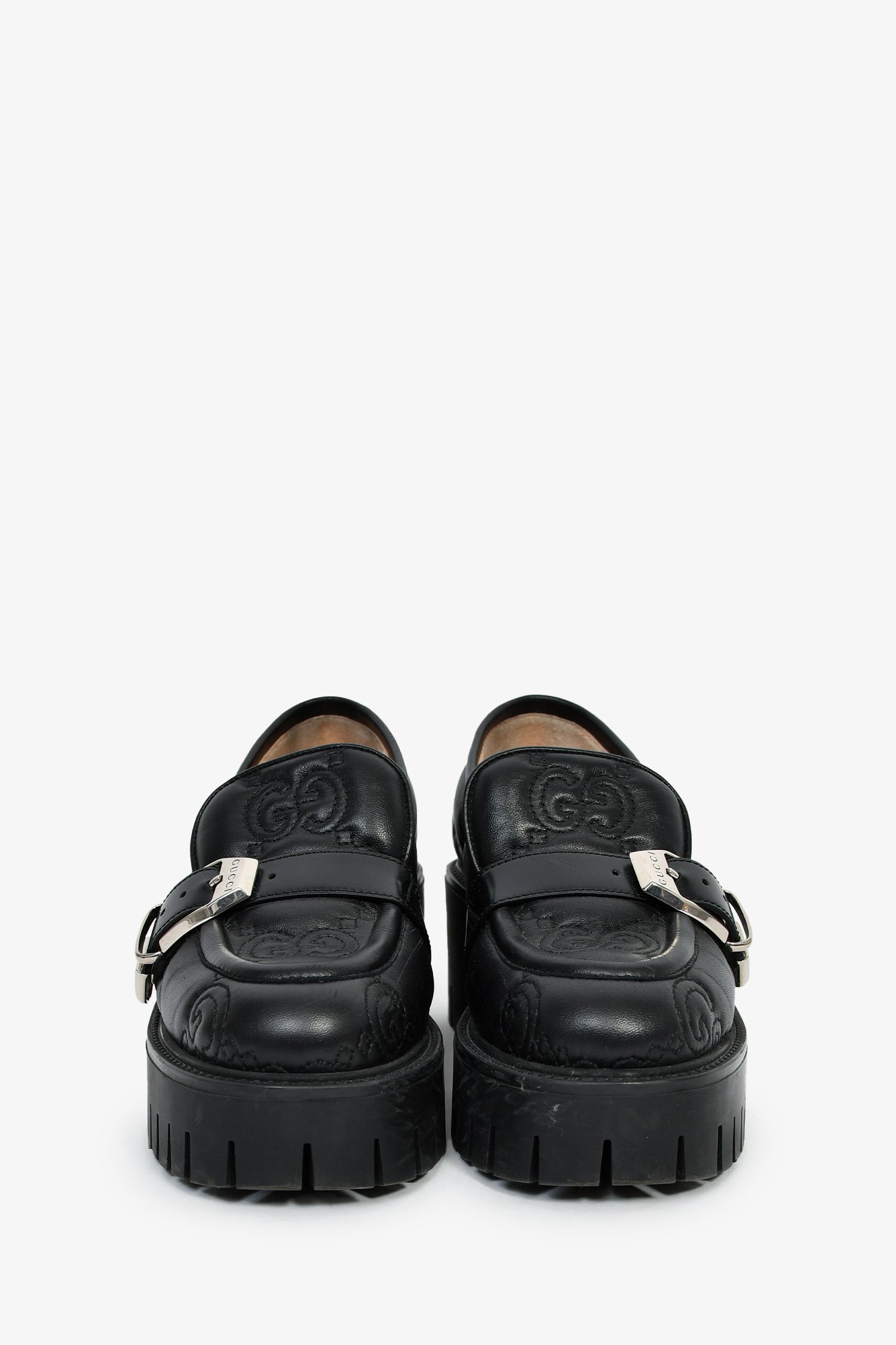 Gucci Black Leather GG Embossed Buckle Detail Platform Loafers. Slip-on. Round-toe. Silver-tone hardware. Leather-lined interior. Rubber soles. Silver-tone hardware. Tonal stitching.