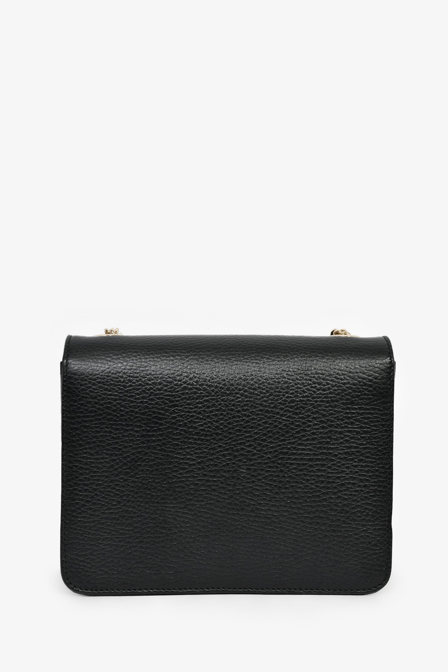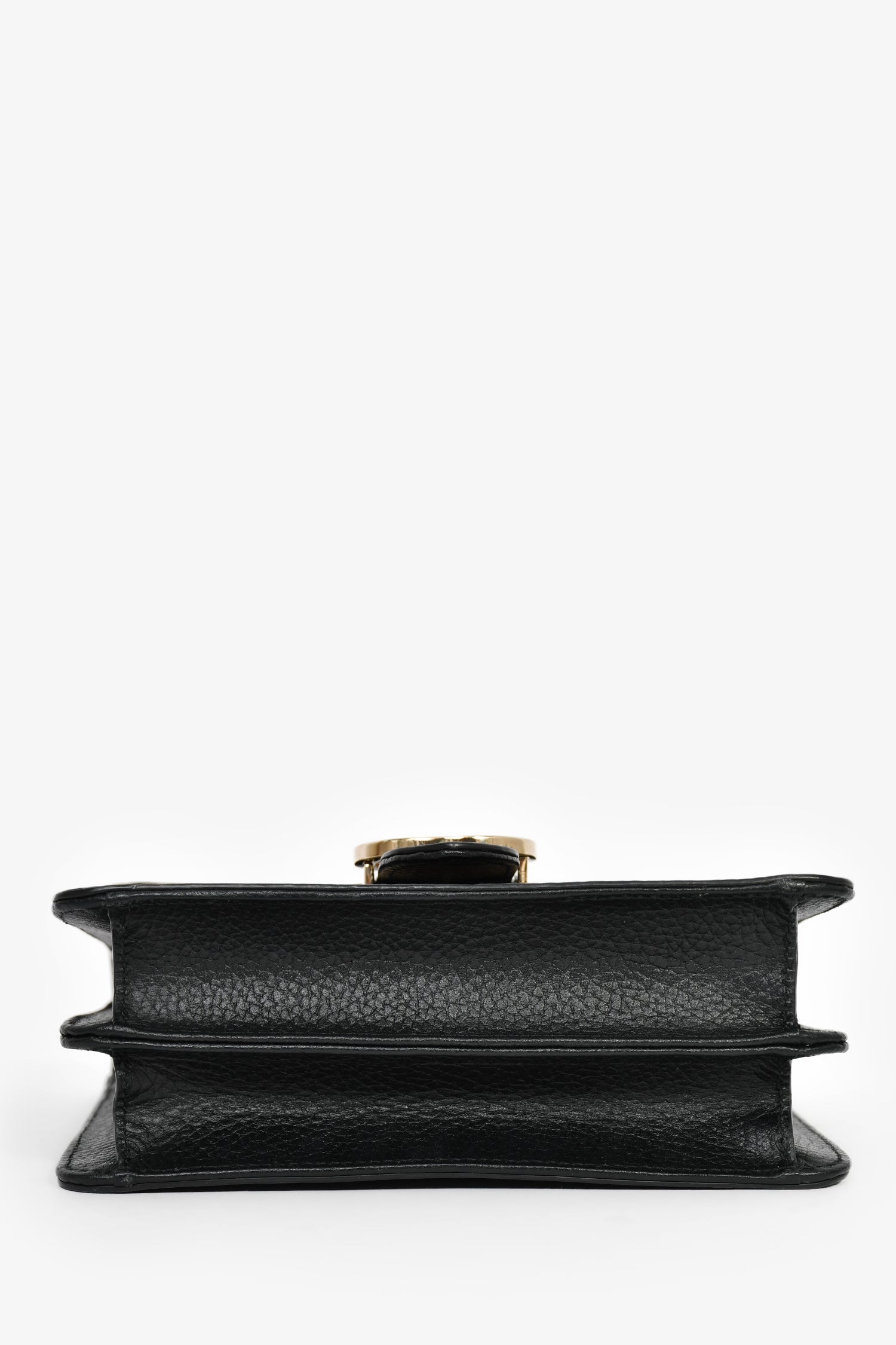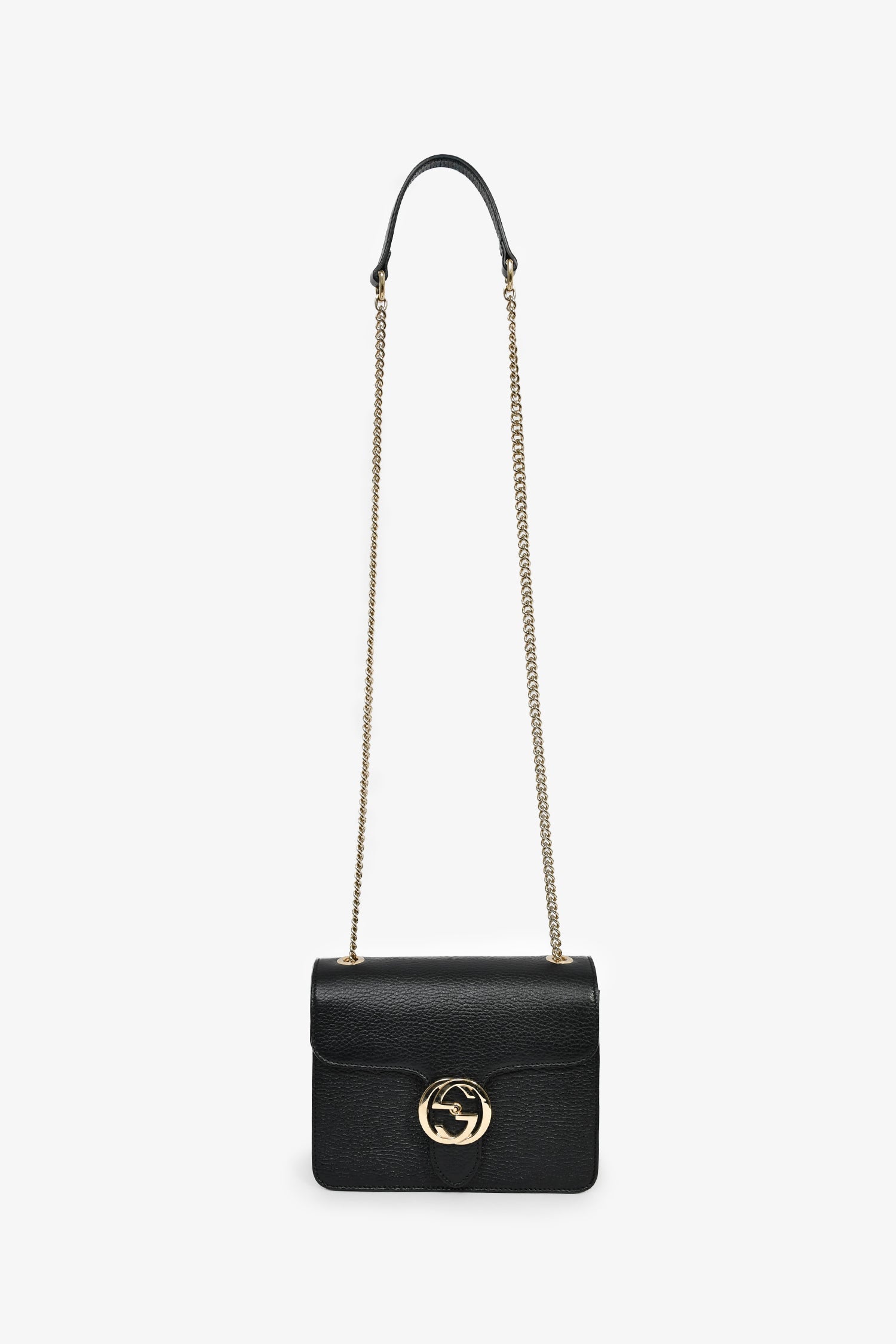 Gucci Black Leather GG Interlocking Small Chain Crossbody Bag. Front fold-over flap with flip-lock closure. Slide-around chain strap. Textile-lined interior. 2 interior compartments; separated by a divider. Single interior wall slip pocket. Gold-tone hardware. Tonal stitching.