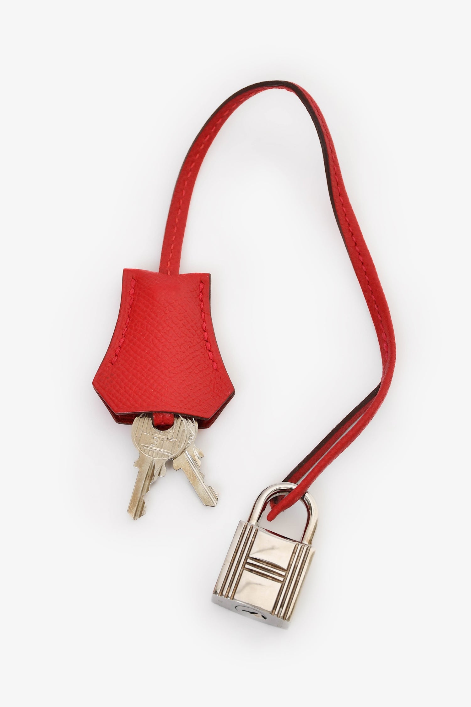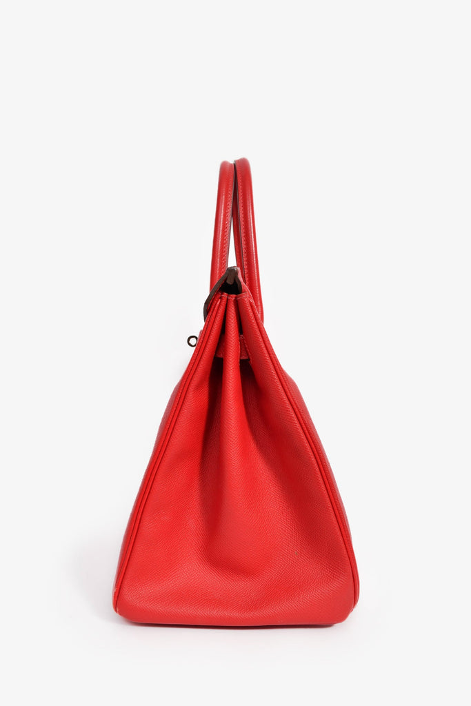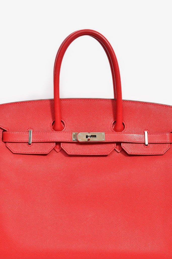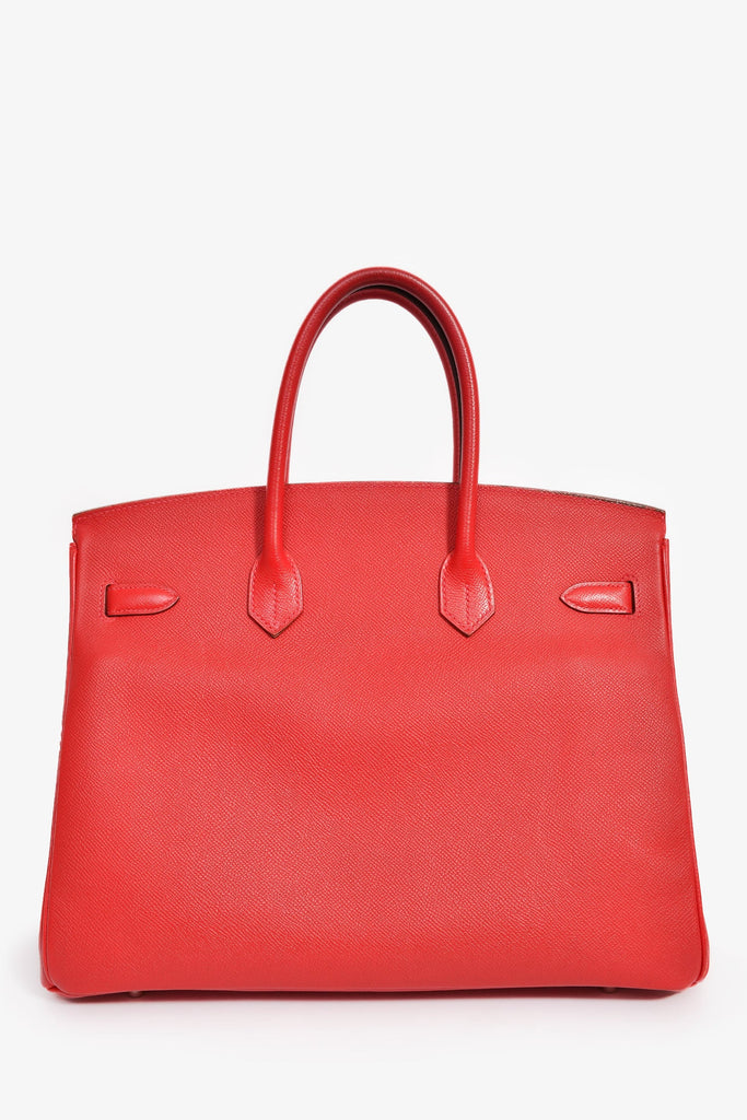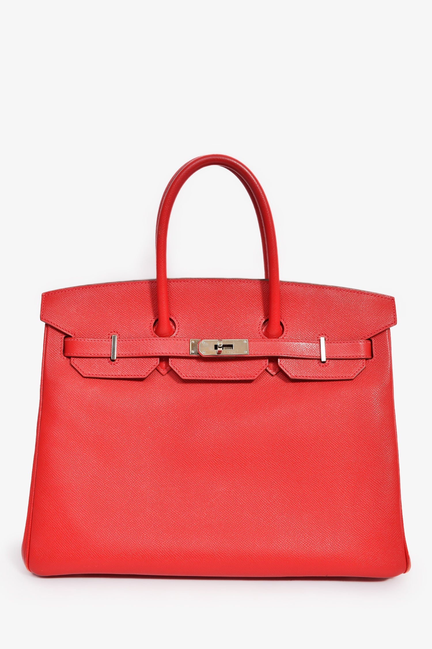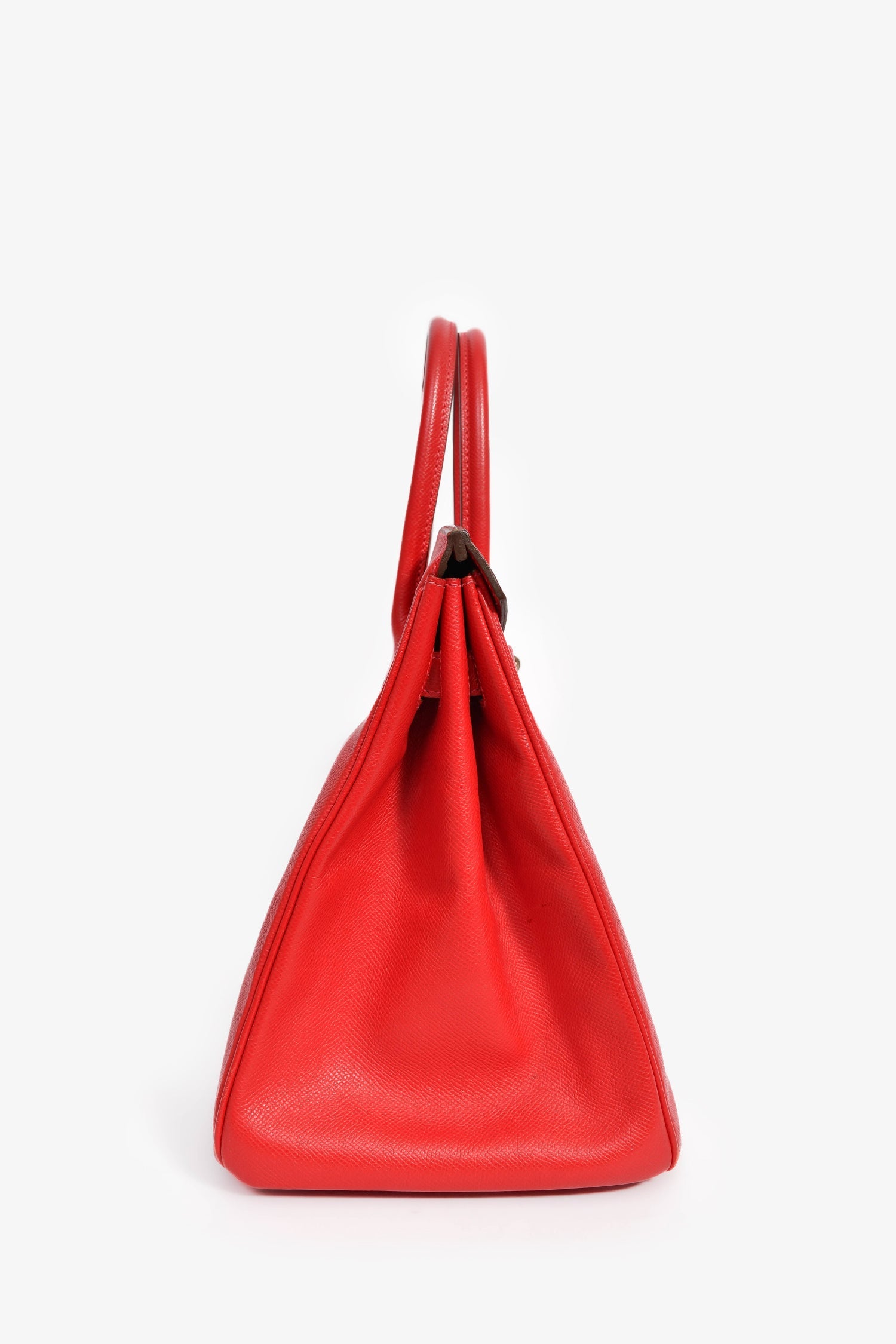 Hermès 2013 Rouge Epsom Leather Birkin 35. Fold-over flap. Pull-through straps with a turn-lock closure. 1 slip and 1 zip compartment. Detachable clochette with 2 keys. Palladium hardware. Tonal stitching.