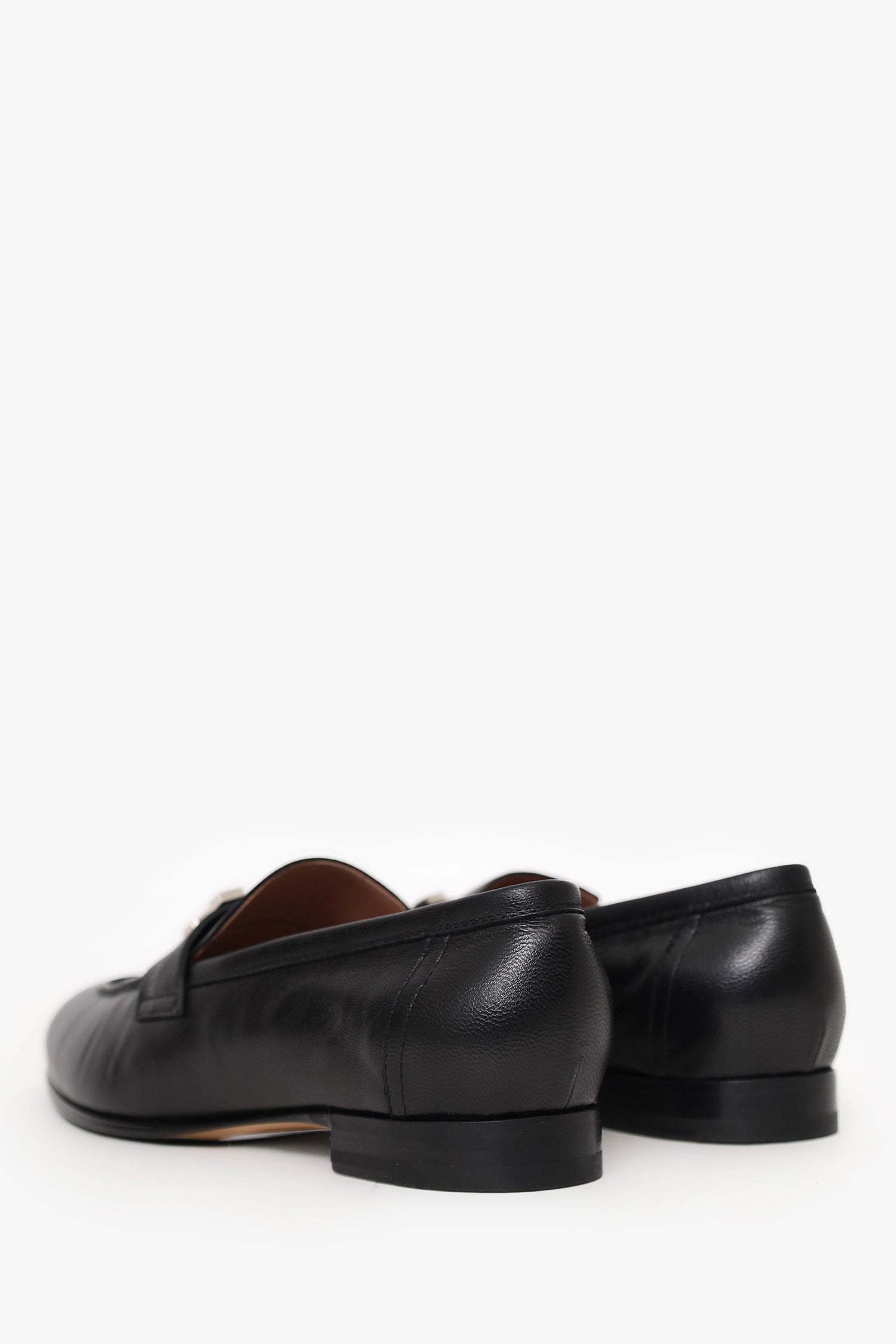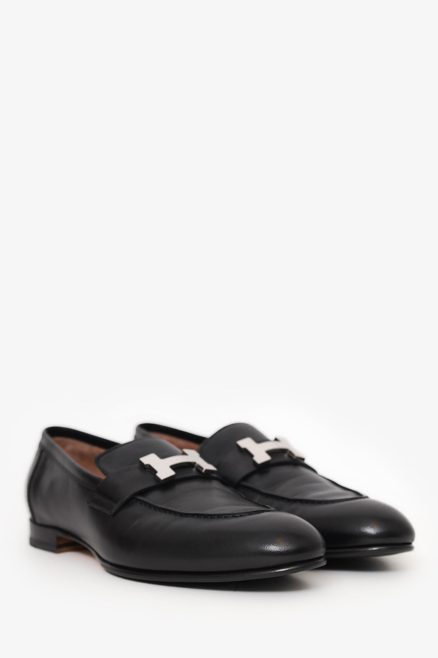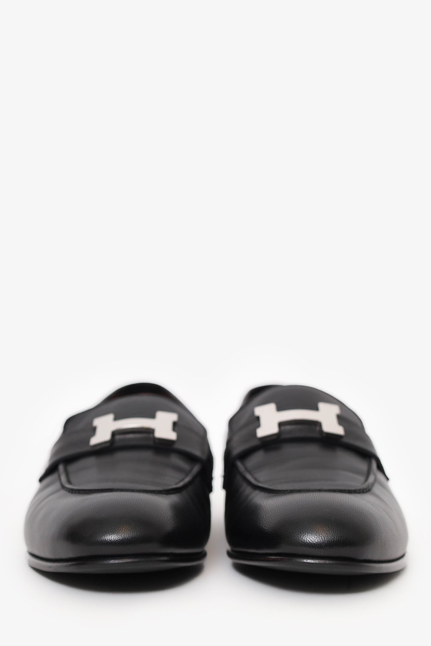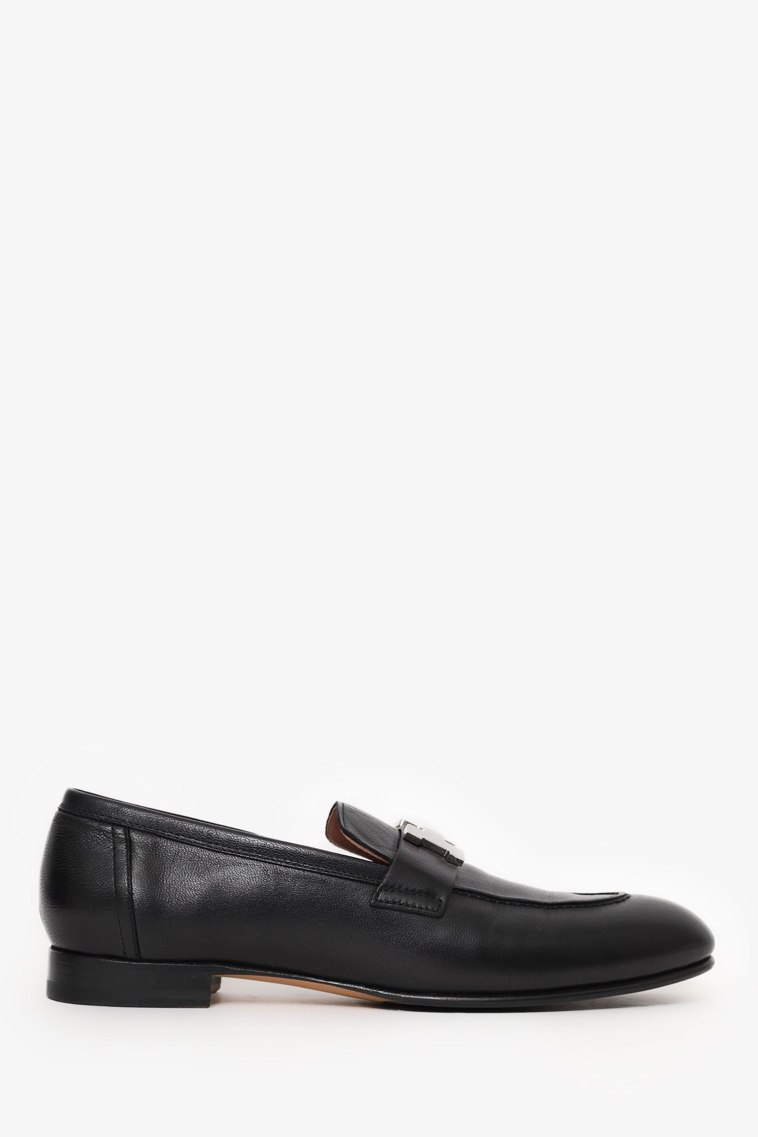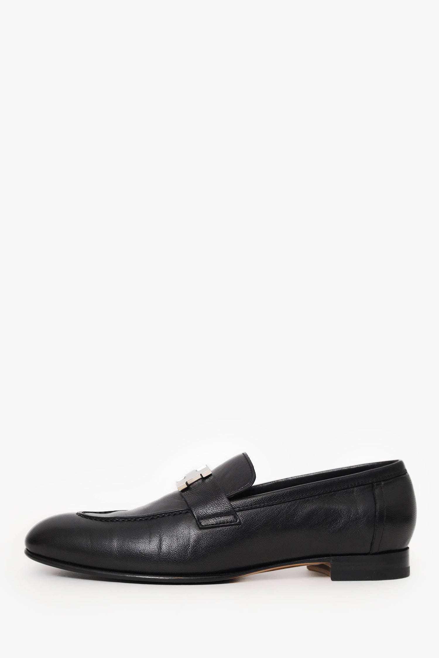 Hermes Black Leather Paris Loafer. Slip-on. Pointed toe. Silver-tone hardware. Tonal stitching.
