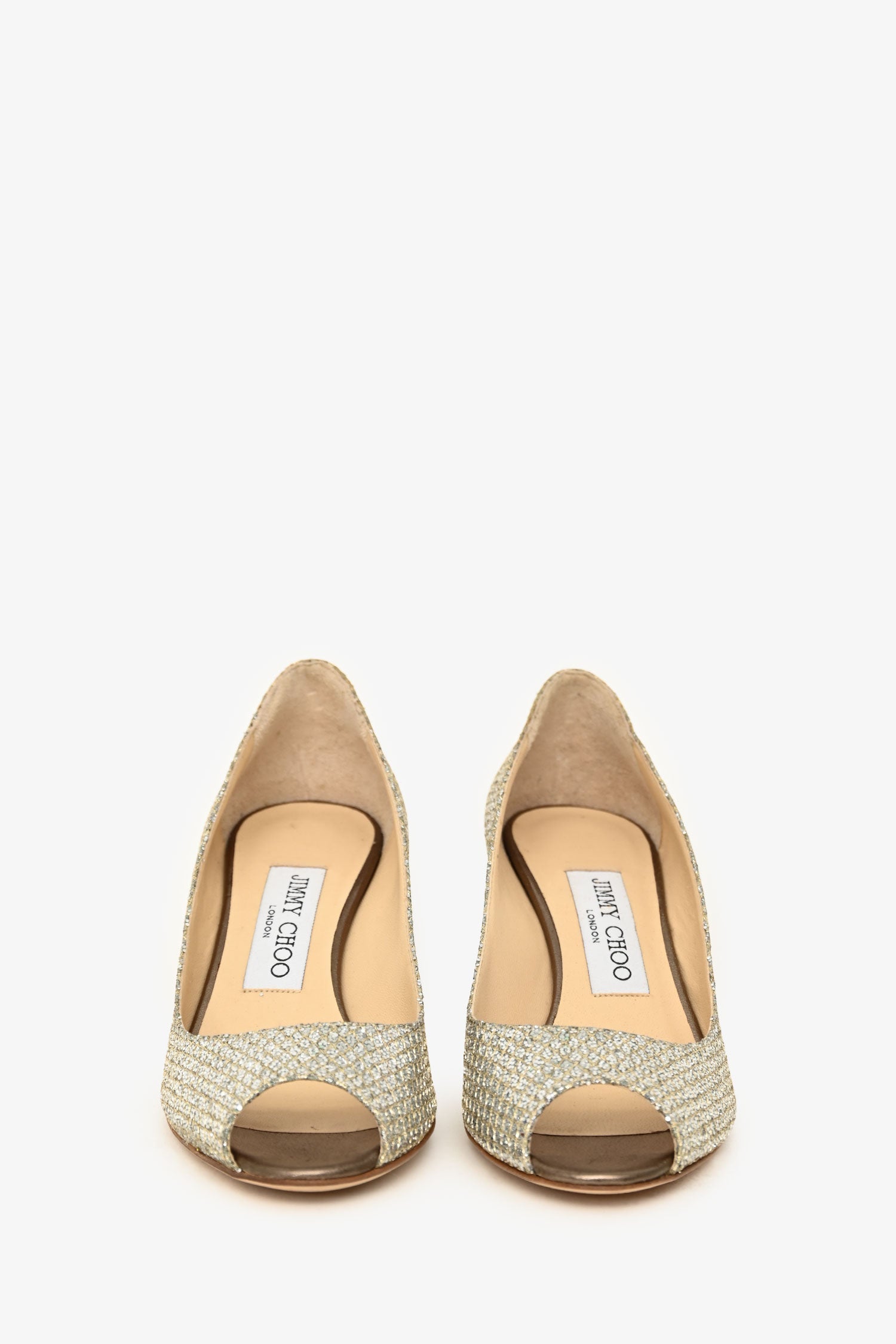Jimmy Choo Silver Metallic Peep Toe Heels. Slip-on. Round, open toe. Leather insoles. Tonal stitching.