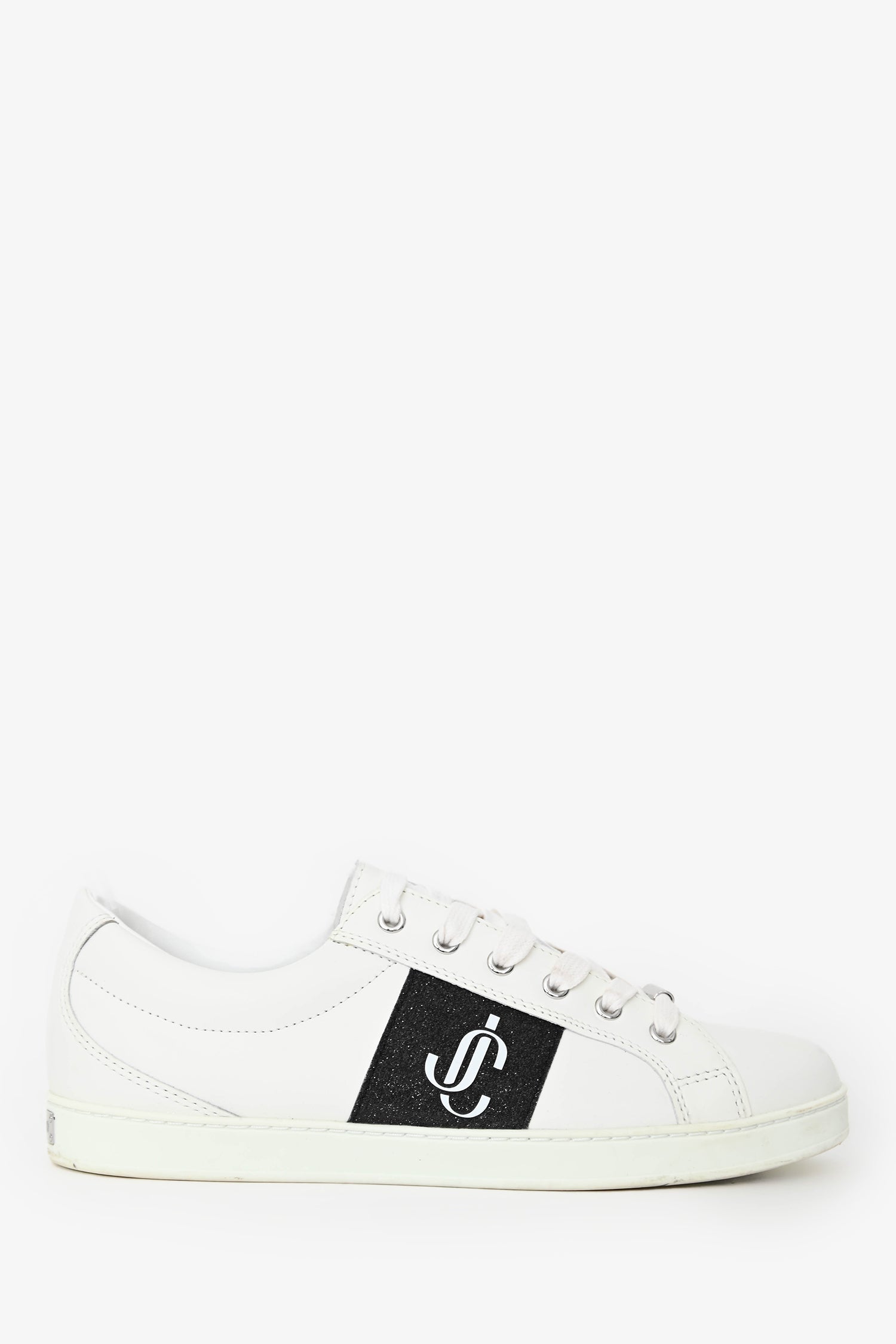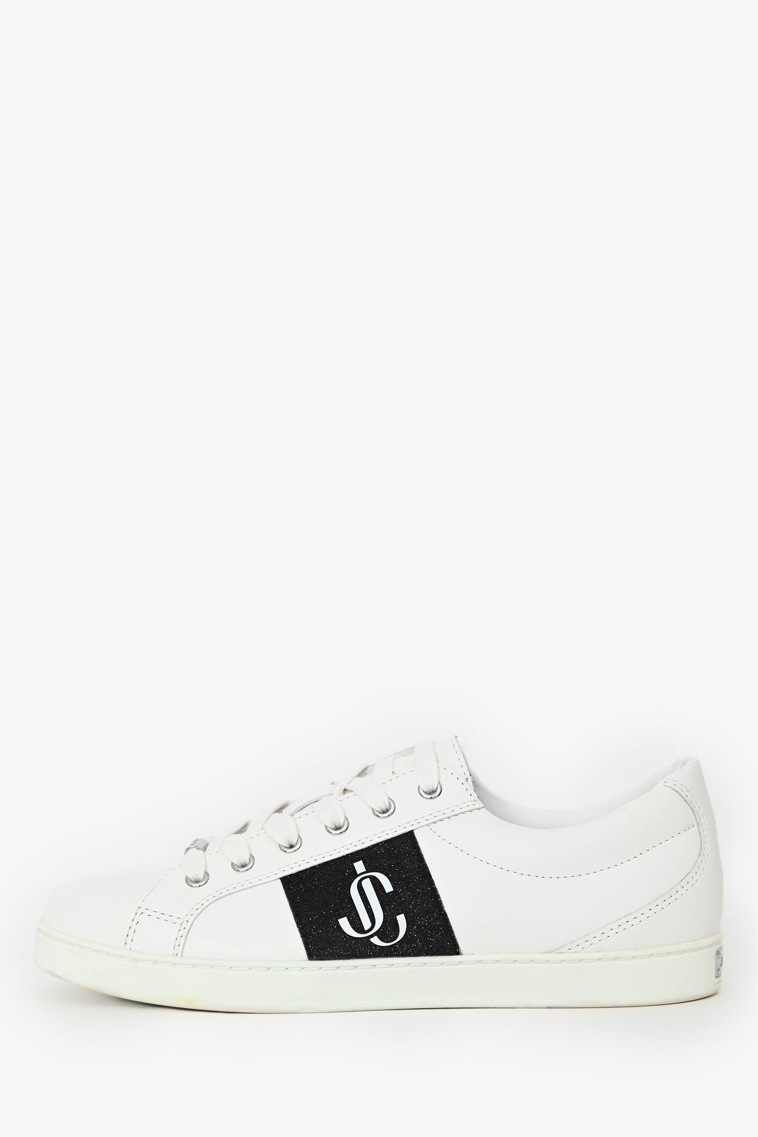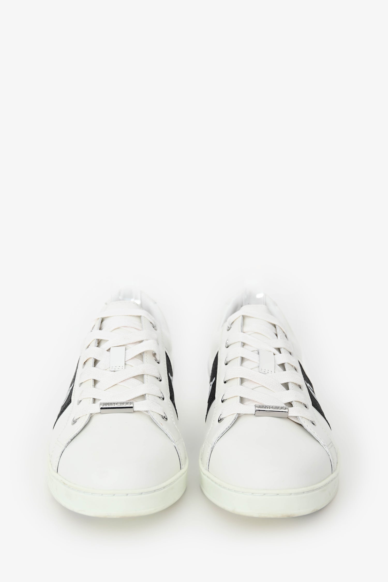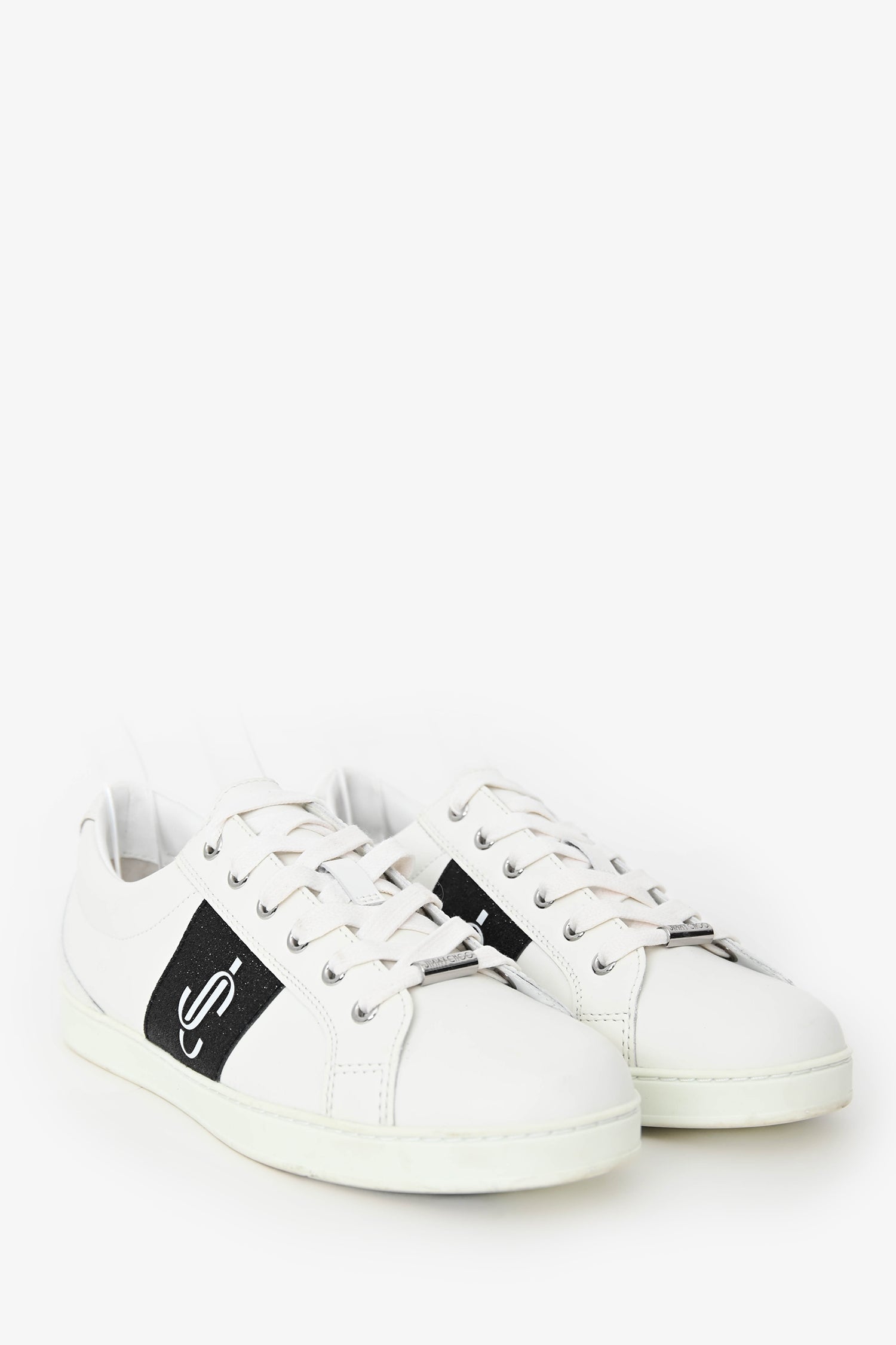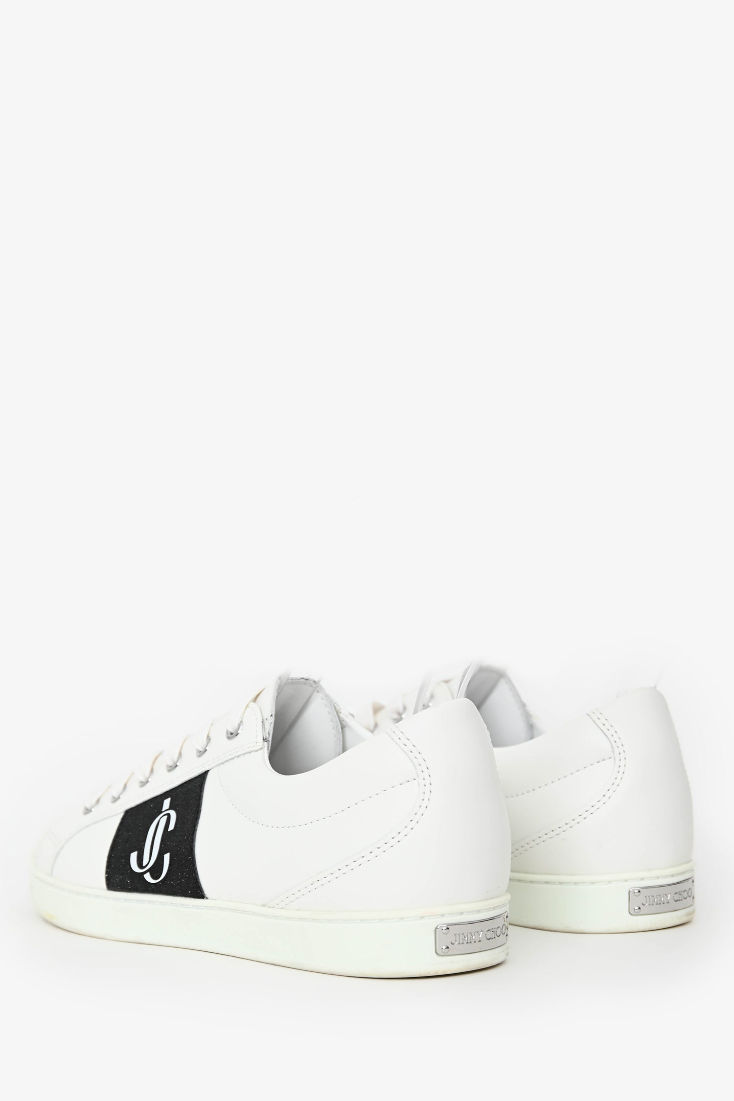 Jimmy Choo White Leather Sneakers. Slip-on. Round-toe. Leather insole. Rubber soles. Silver-tone hardware. Tonal stitching.