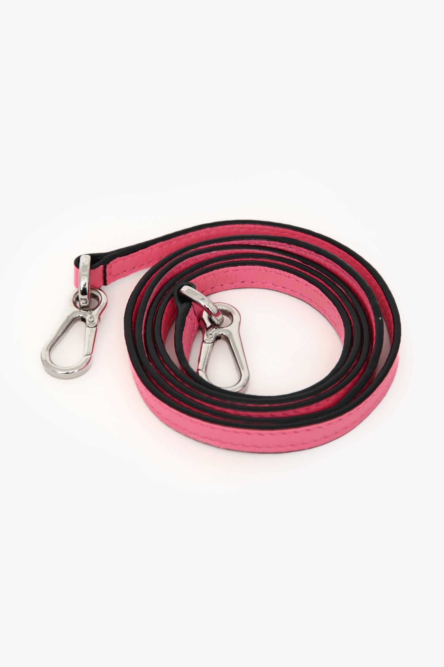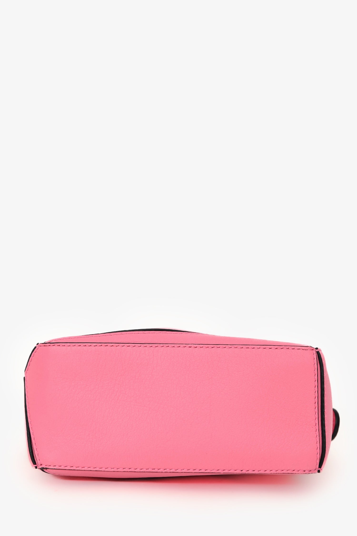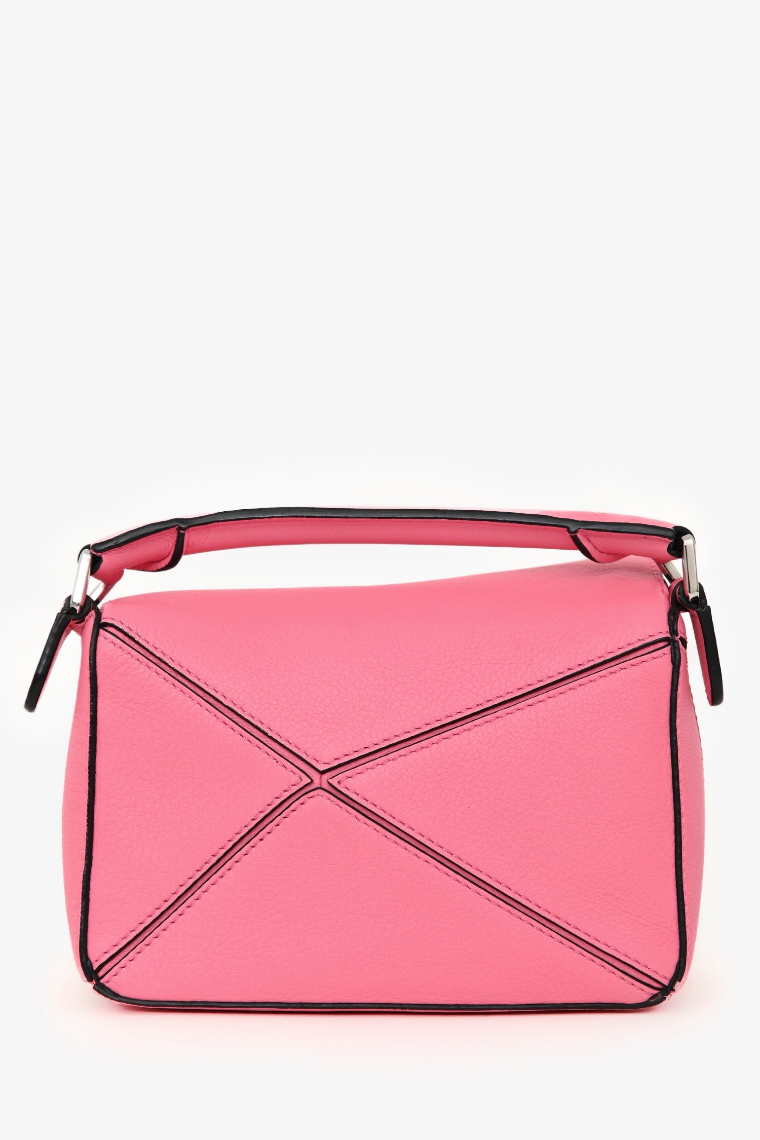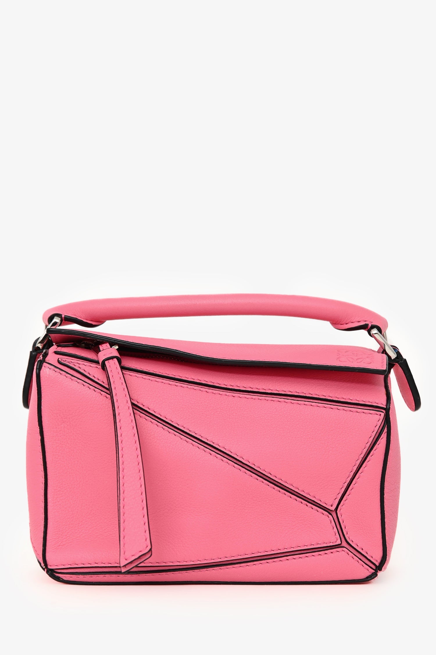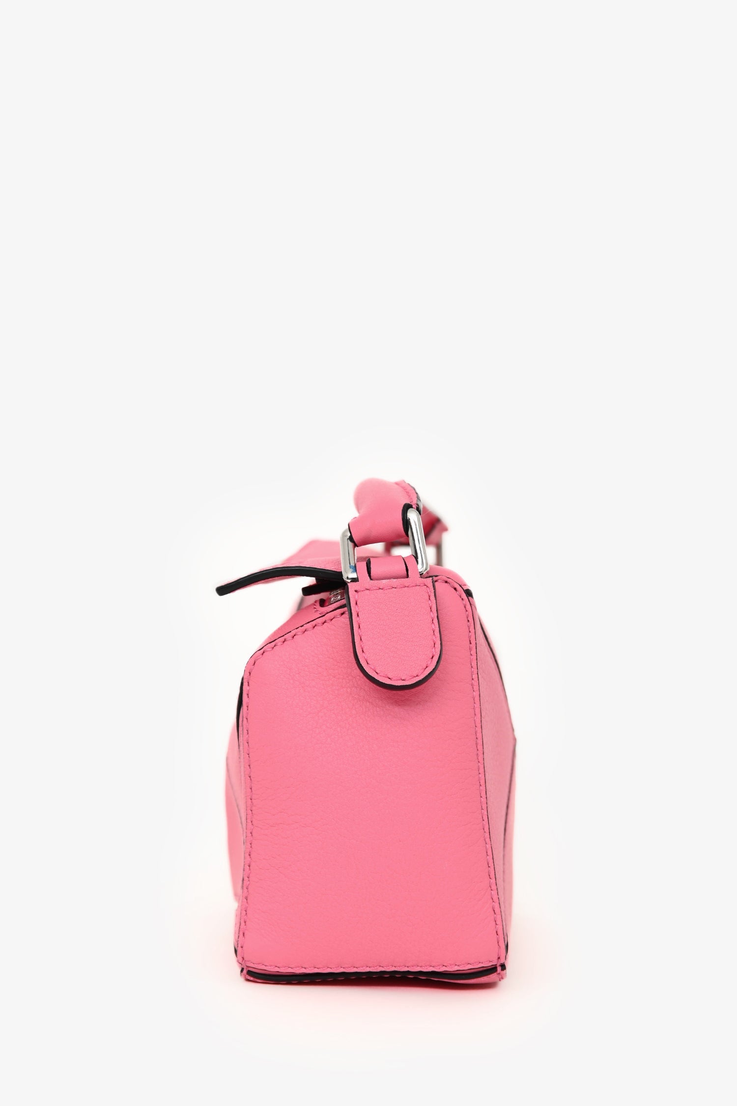 Loewe Pink Leather Mini Puzzle Crossbody. Top zip closure. Removable crossbody strap. Silver-tone hardware. Tonal stitching.