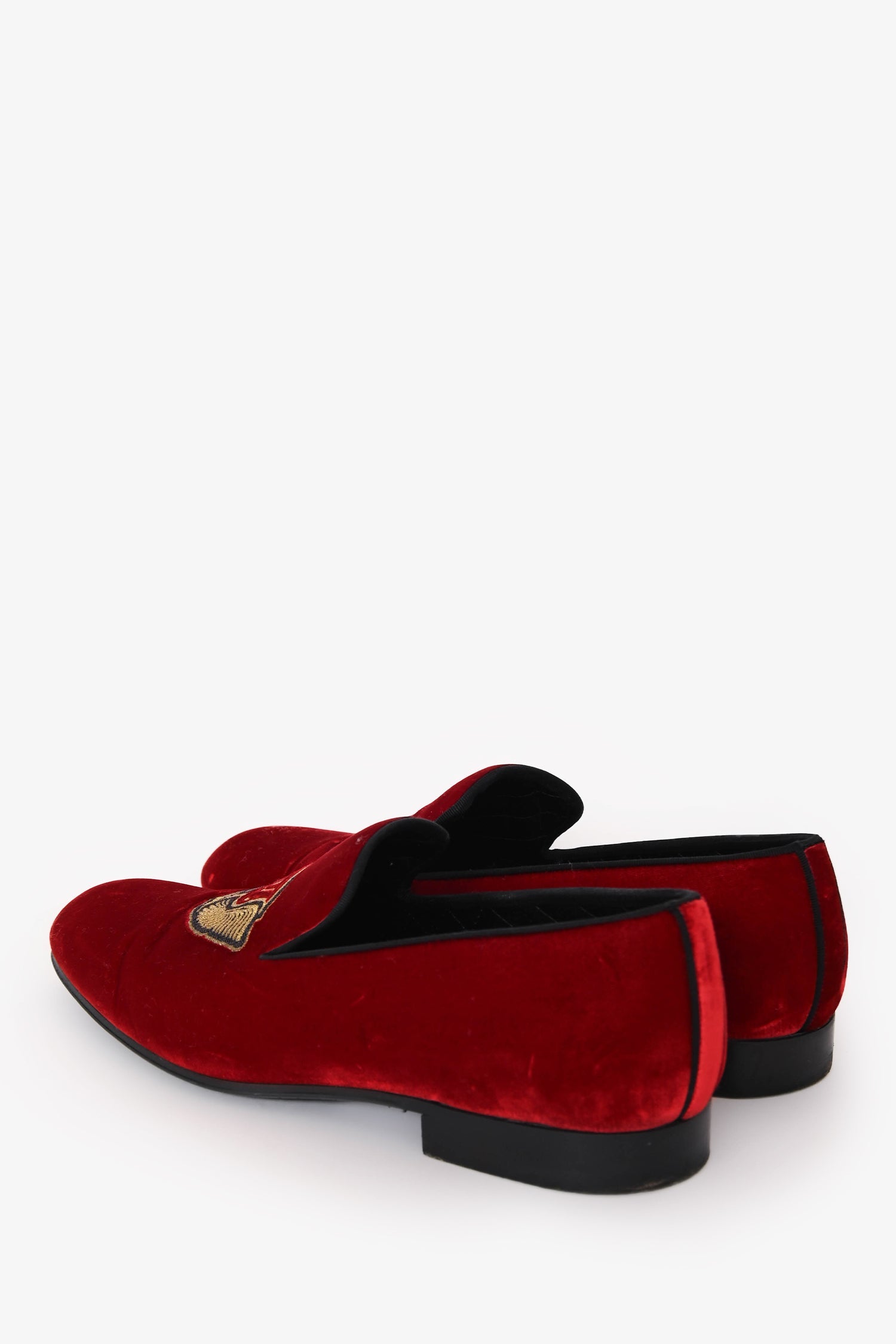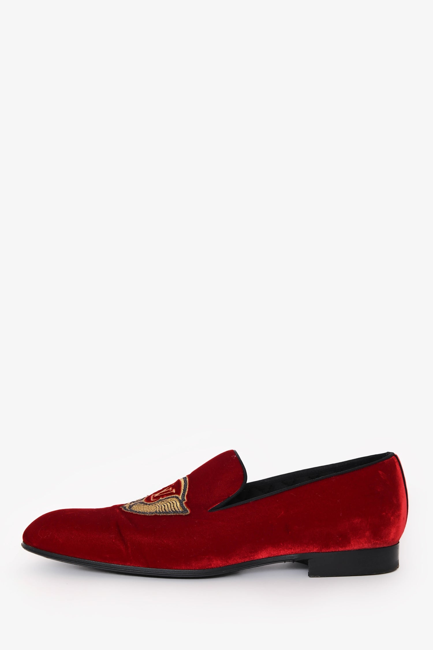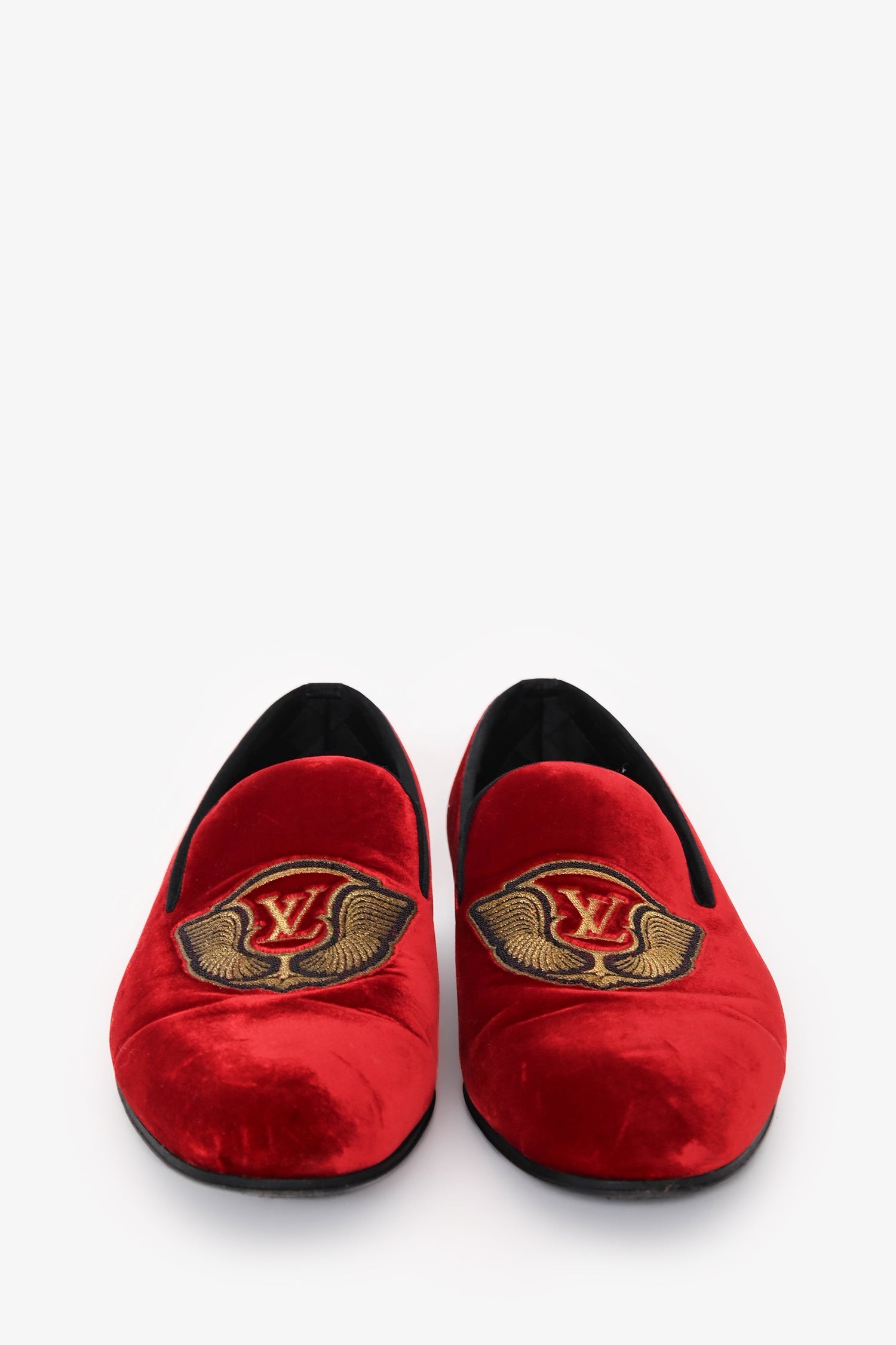 Louis Vuitton Red Velvet Slip-On 'Auteuil' Loafers. Slip-on. Round toe. Tonal stitching.
