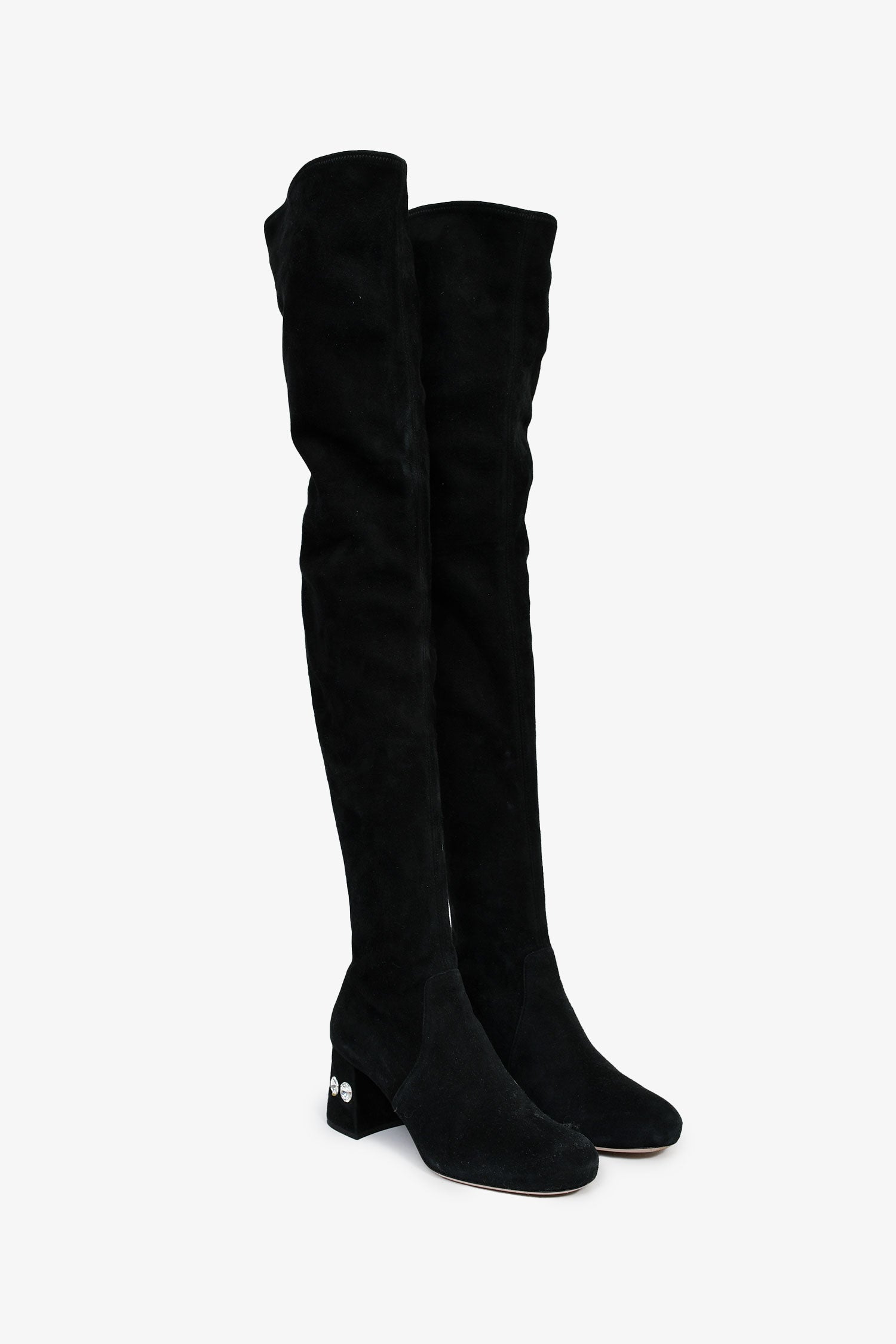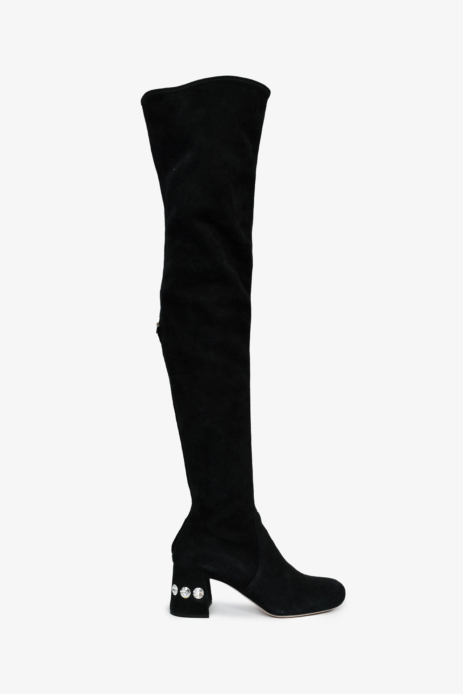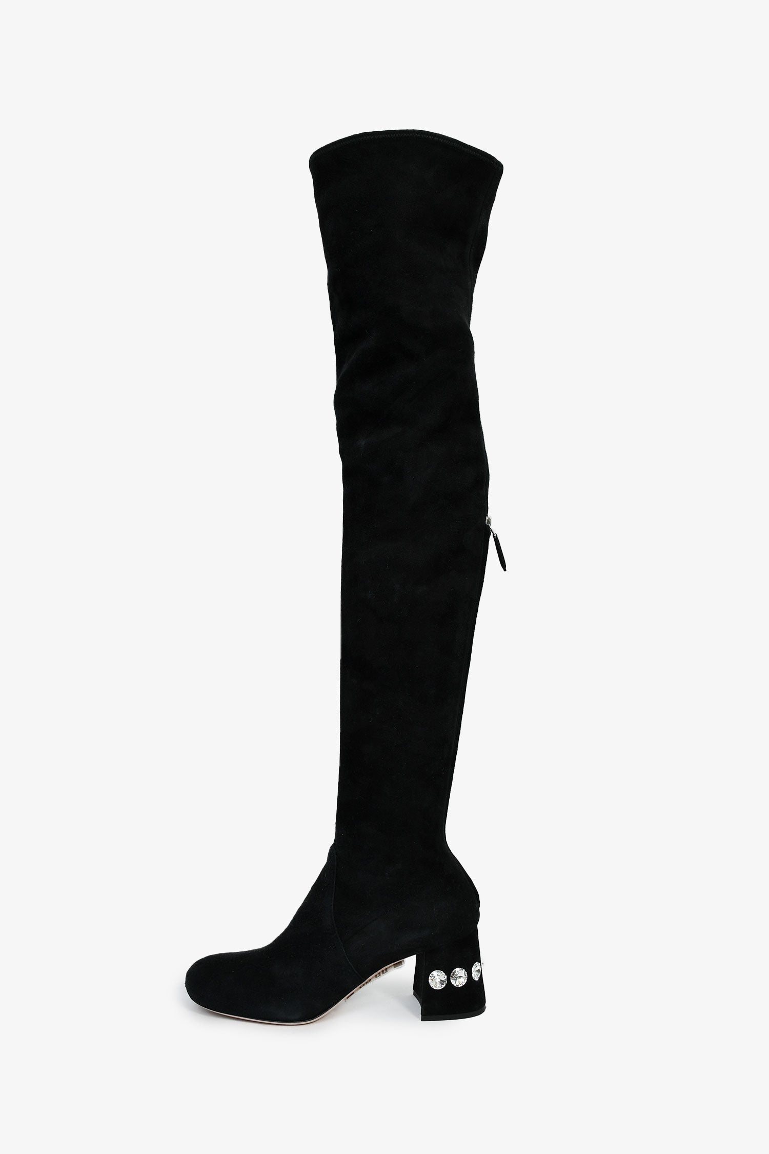 Miu Miu Black Suede Leather Crystal Embellished Knee High Boots Size 35.5