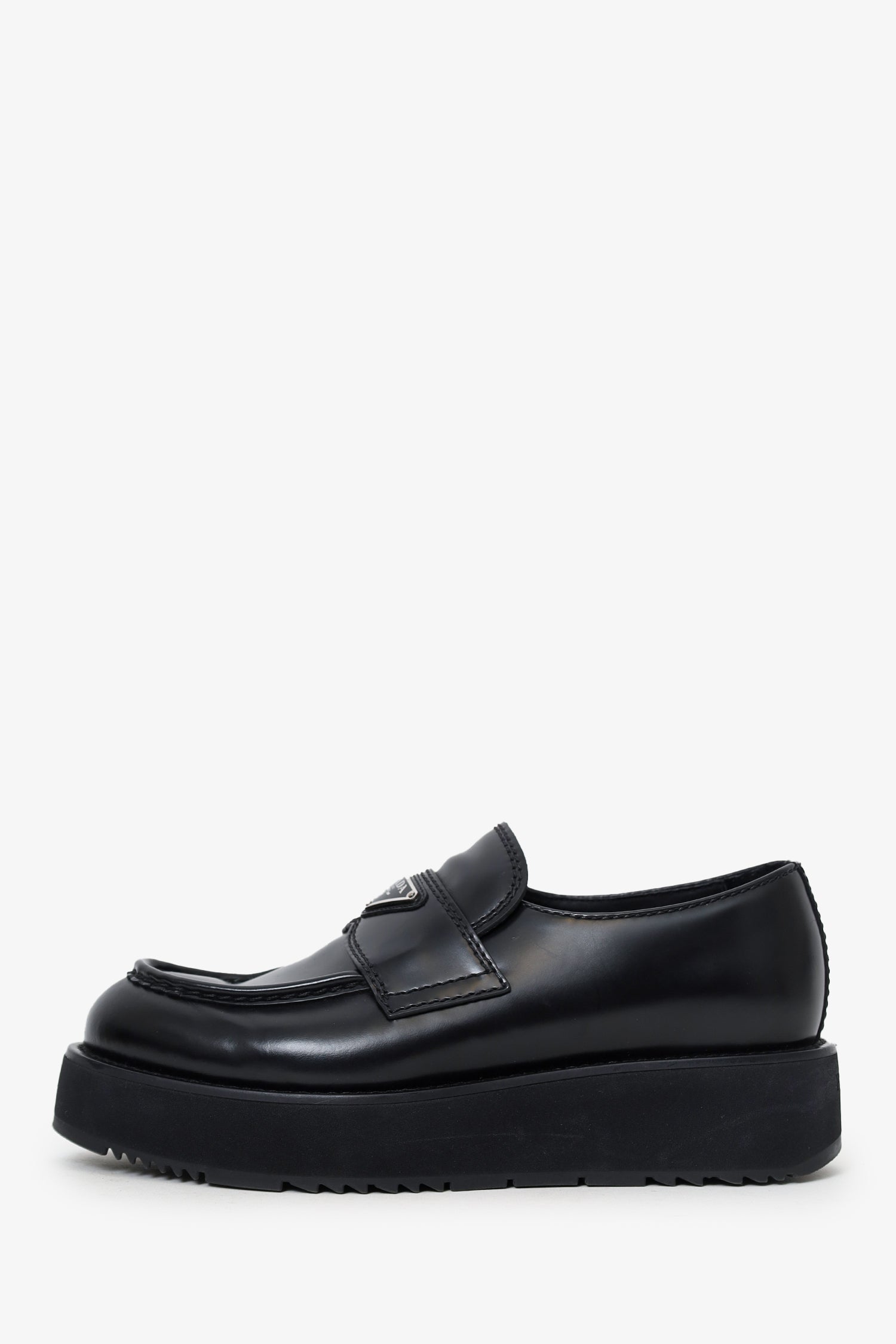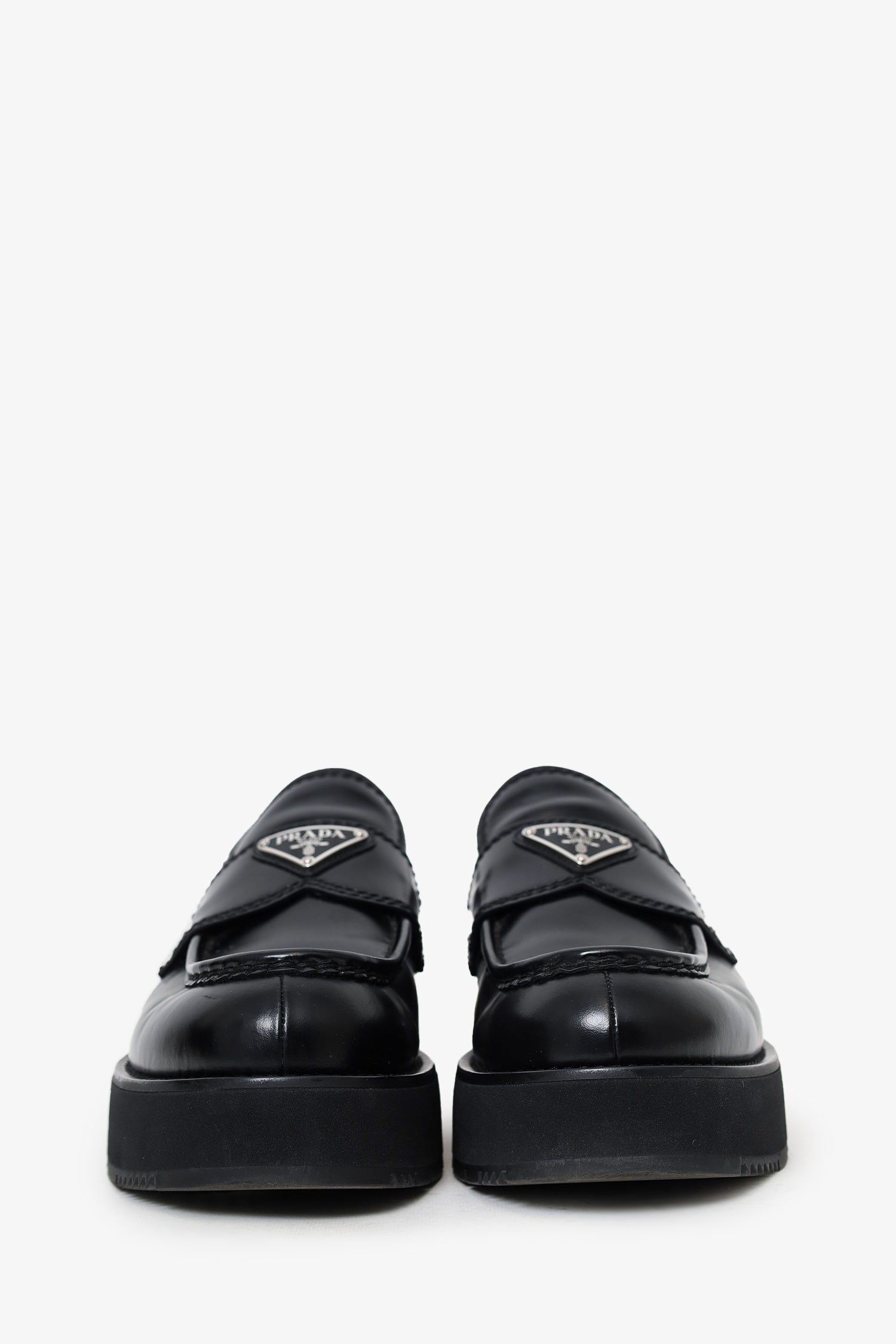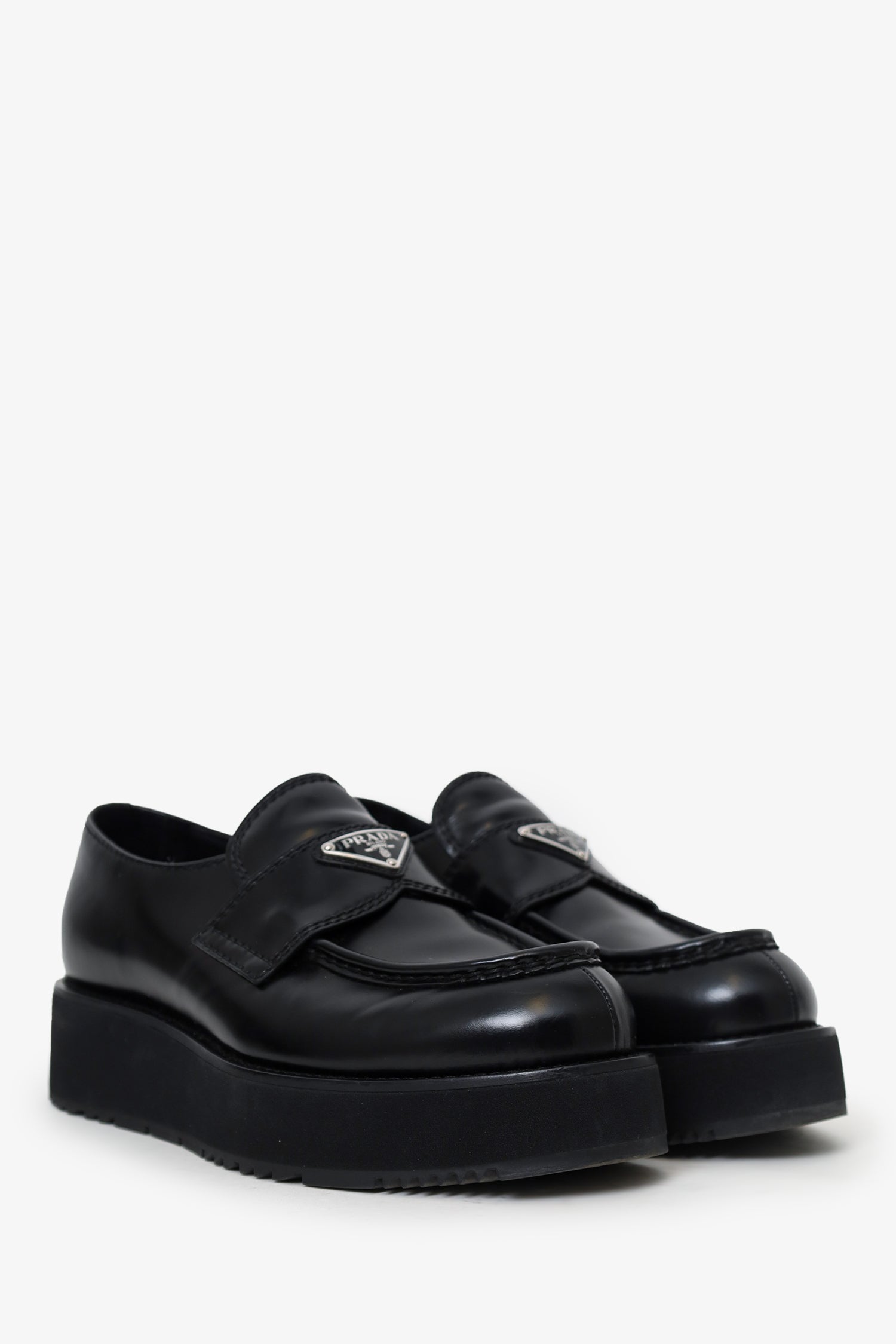 Prada Black Leather Brushed Loafers. Slip-on. Round-toe. Silver-tone hardware. Tonal stitching.