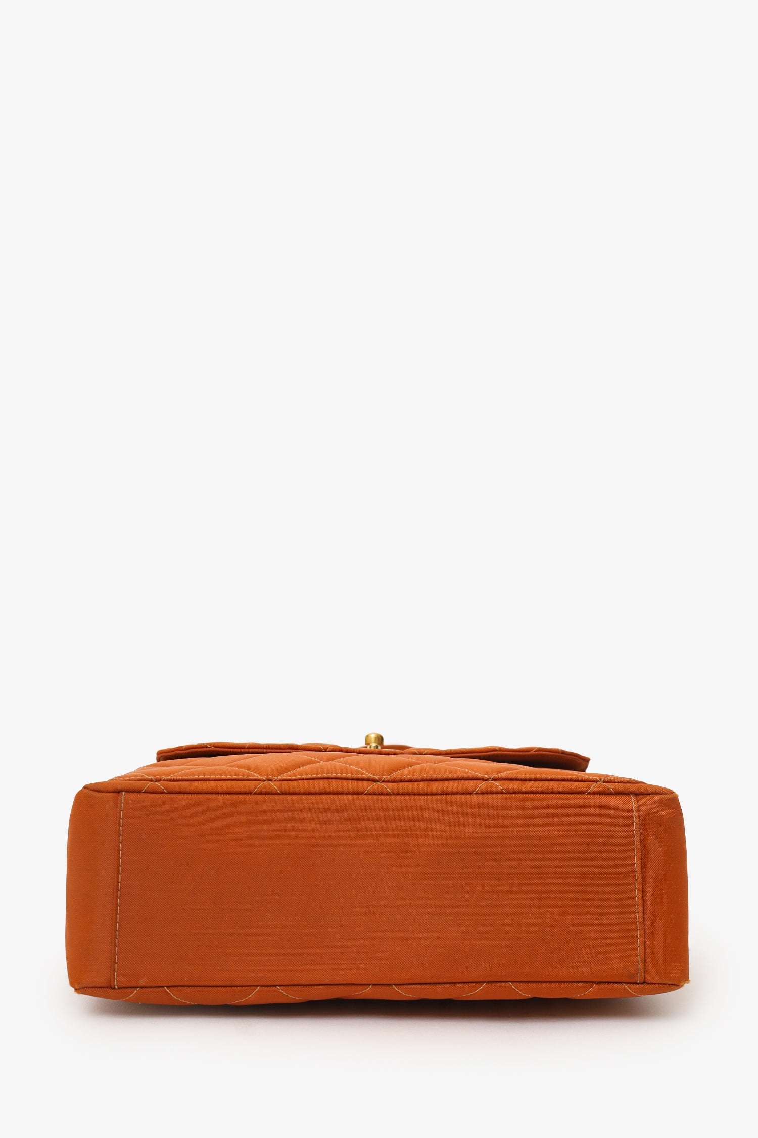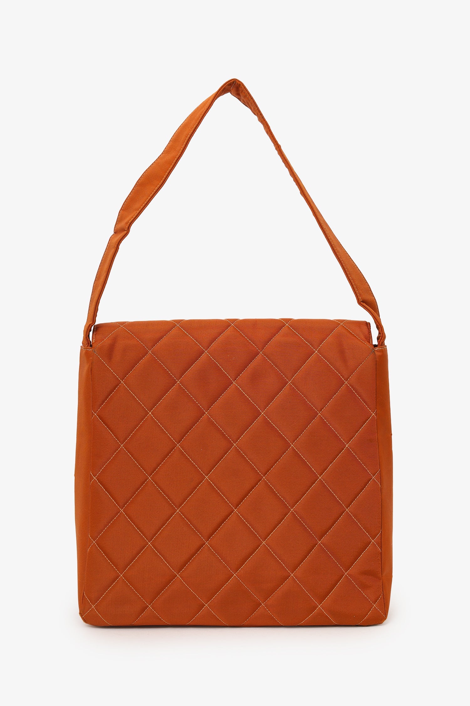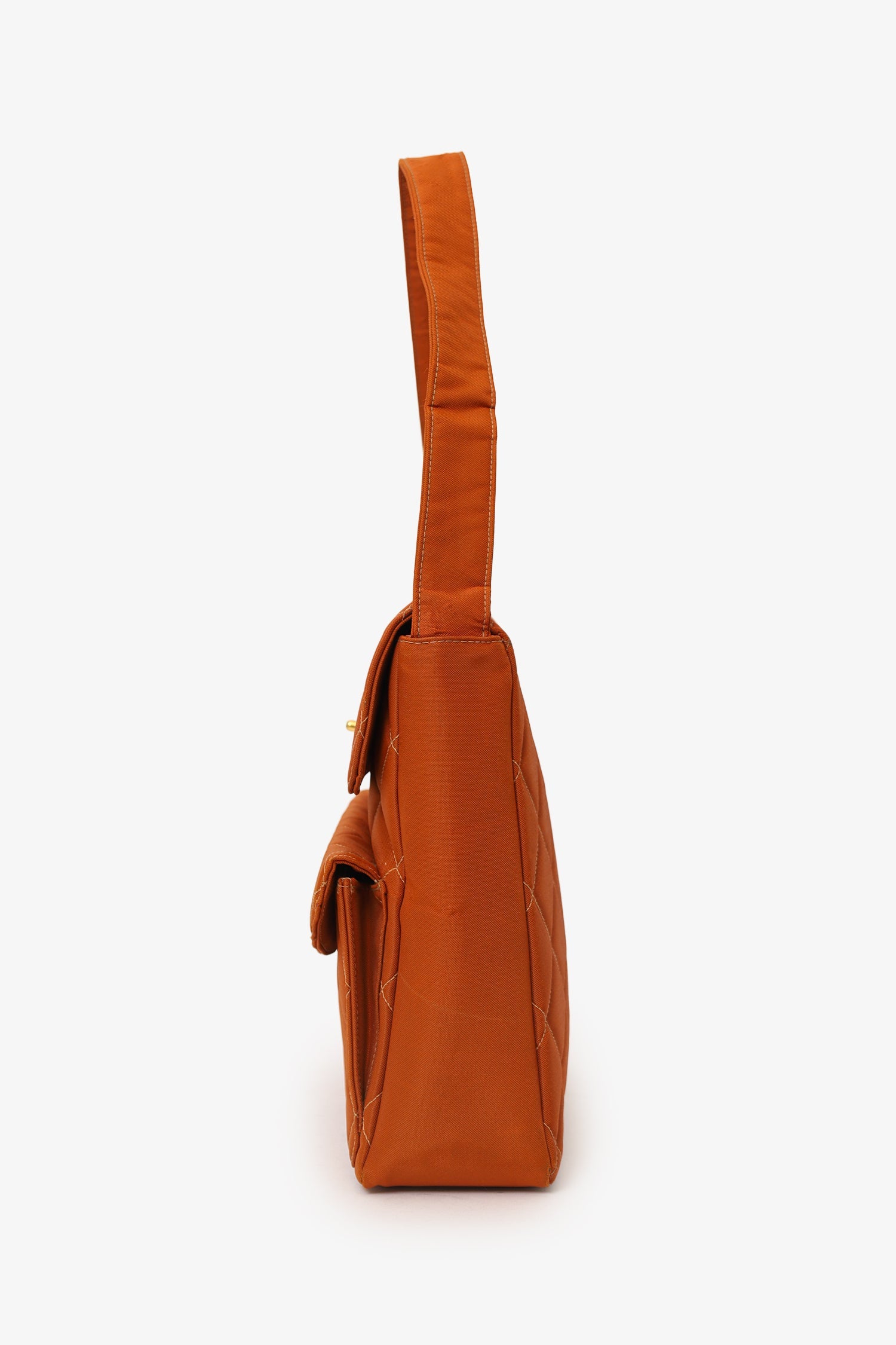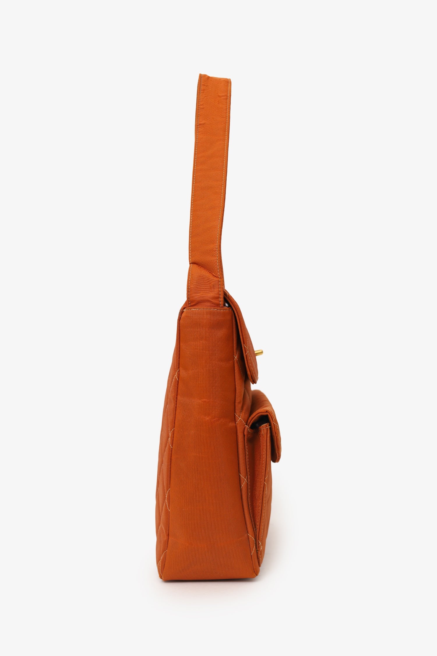 Pre-Loved Chanel™ 1996-97 Orange Nylon Quilted Two Pocket Shoulder Bag. Front fold-over flap with turn-lock closure. Single shoulder strap. Lined interior with 2 pockets; 1 zip, and 1 slip.