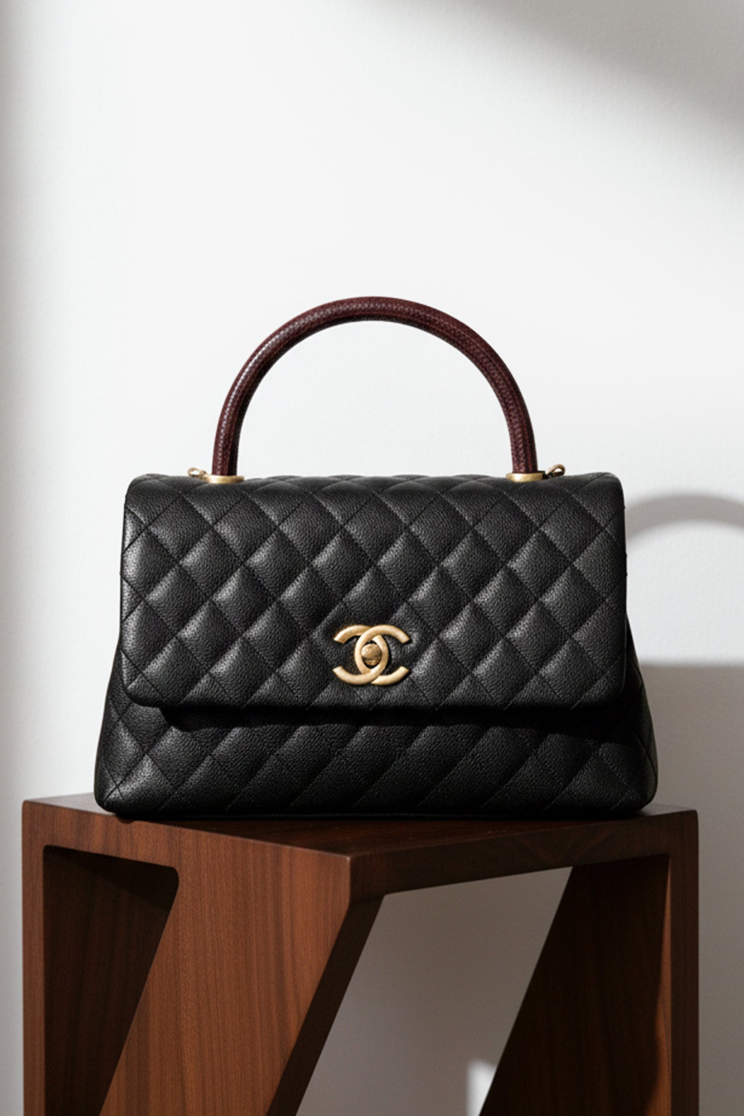 Pre-Loved Chanel™ Black Caviar/Lizard Medium Coco Top Handle Bag with Gold Hardware. Flap front with turn-lock closure. Top handle. Detachable chain link shoulder strap with leather shoulder rest. 1 exterior slip pocket. 2 interior compartments with 2 interior zip pockets; 2 interior slip pocket. 4 protective base studs. Gold-tone hardware. Tonal stitching.