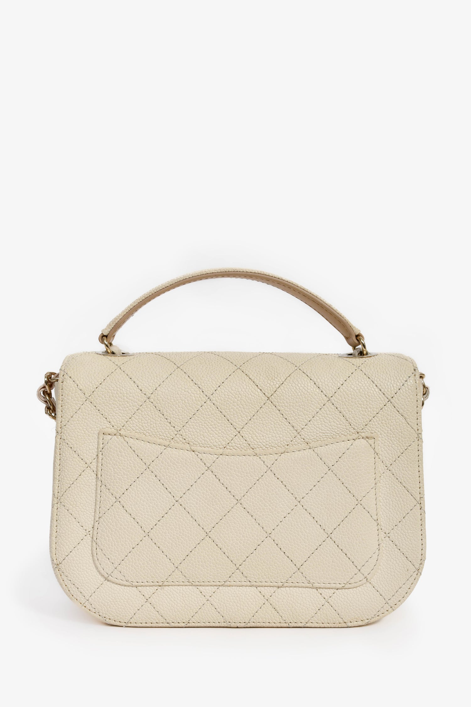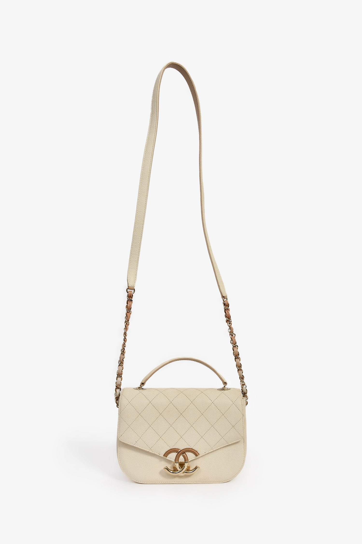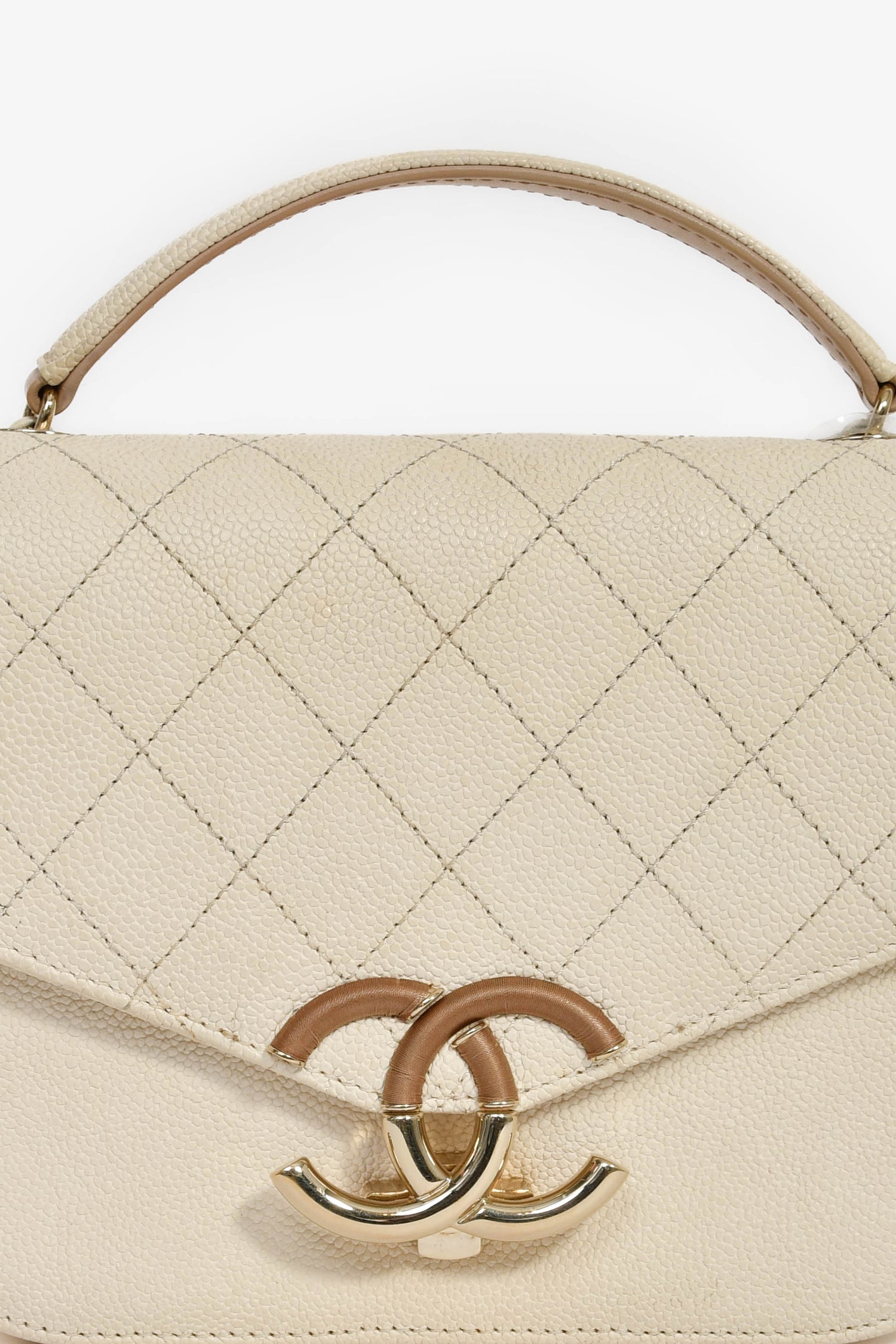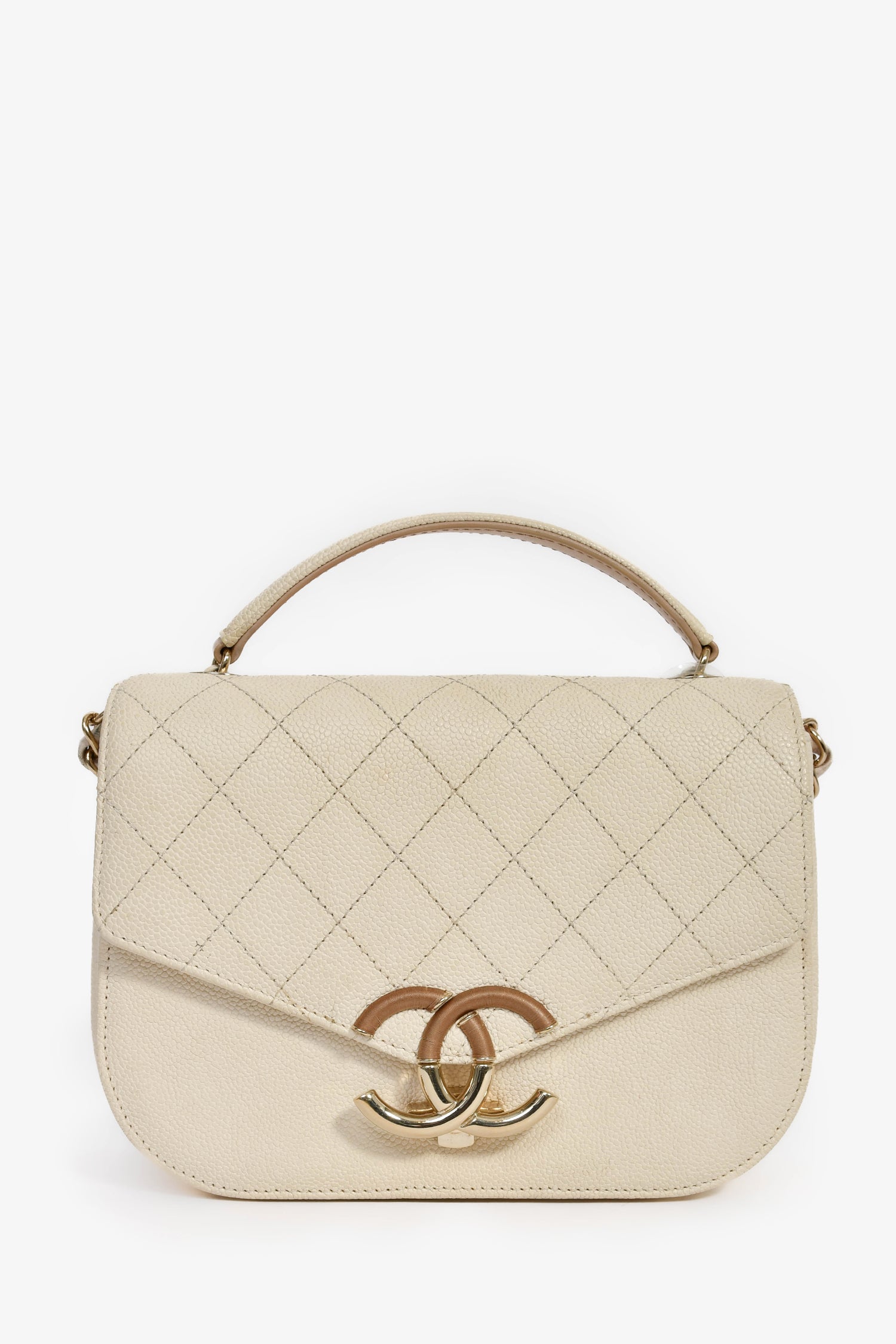Pre-Loved Chanel™ 2018 Paris-Cuba Beige Caviar Leather Thread Around Flap Bag. Top handle. Front fold-over flap with push-lock closure. Lined interior. Single interior wall zip pocket. 1 exterior rear slip pocket. Gold-tone hardware. Tonal stitching.