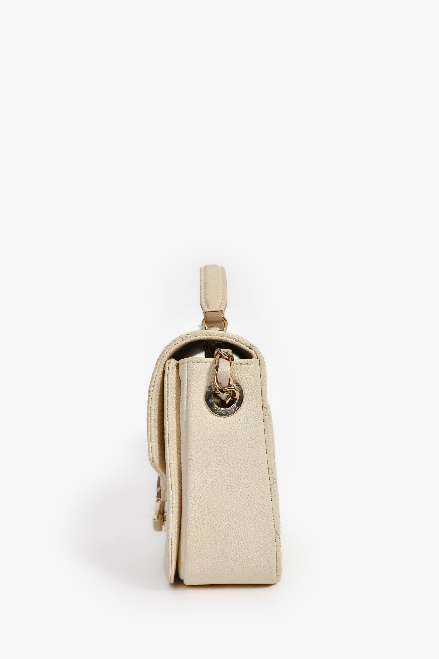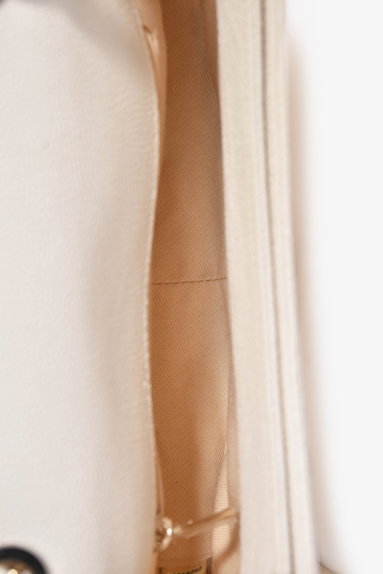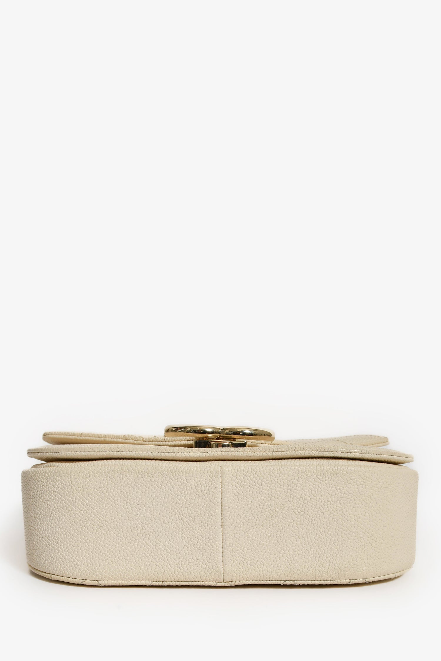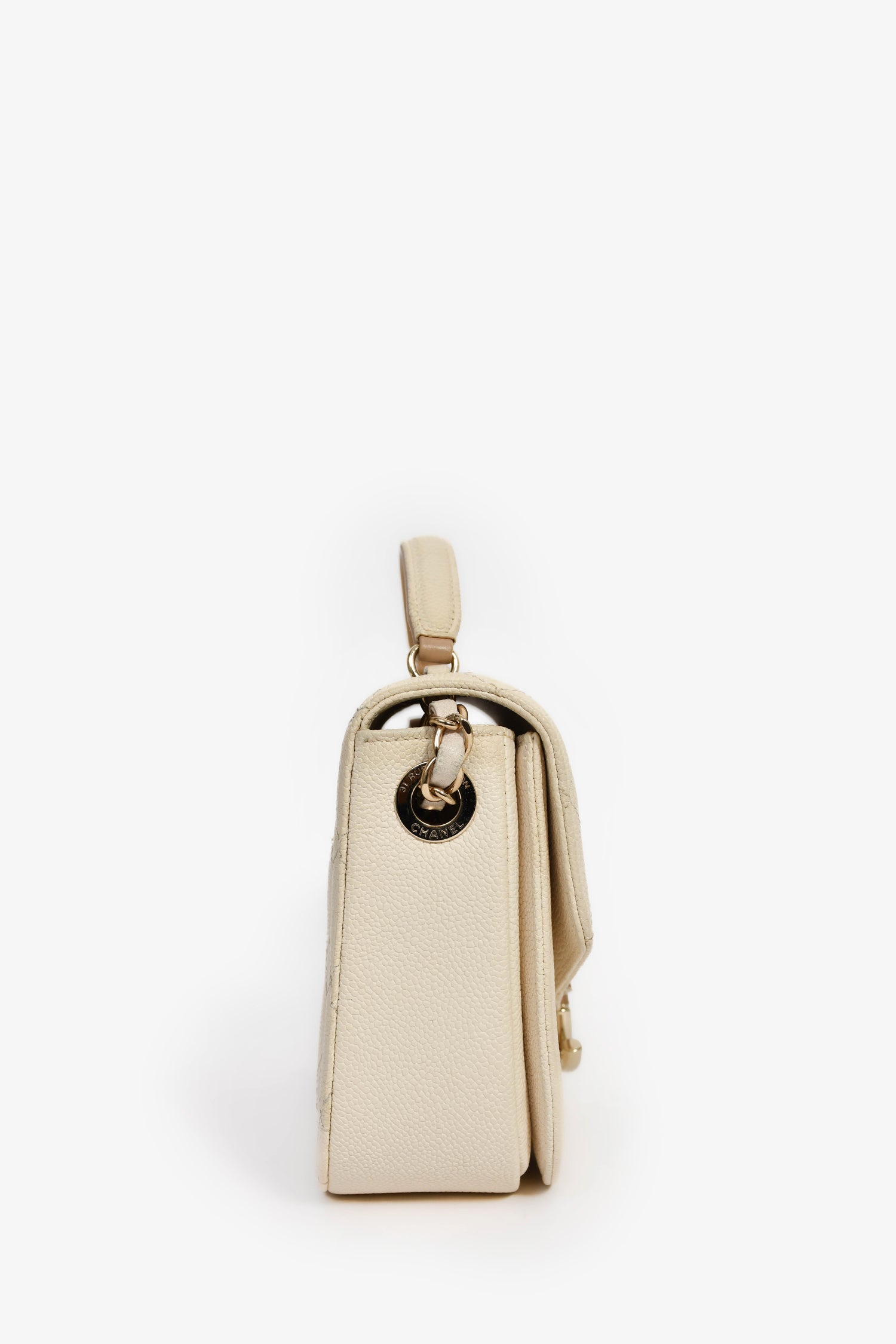 Pre-Loved Chanel™ 2018 Paris-Cuba Beige Caviar Leather Thread Around Flap Bag. Top handle. Front fold-over flap with push-lock closure. Lined interior. Single interior wall zip pocket. 1 exterior rear slip pocket. Gold-tone hardware. Tonal stitching.