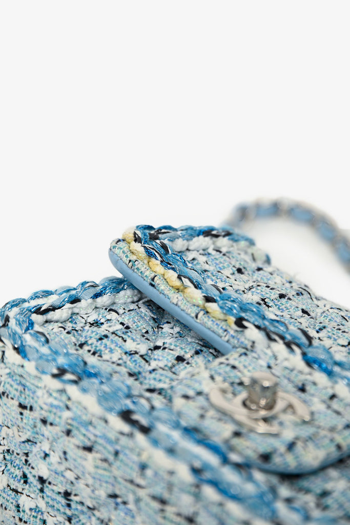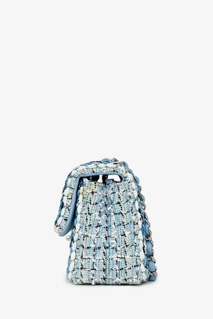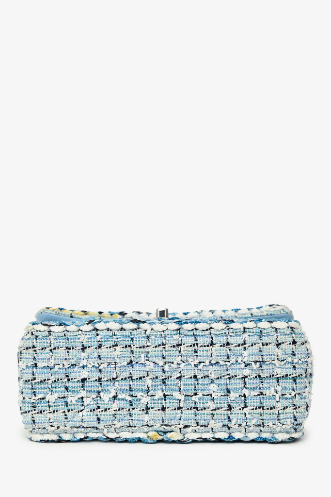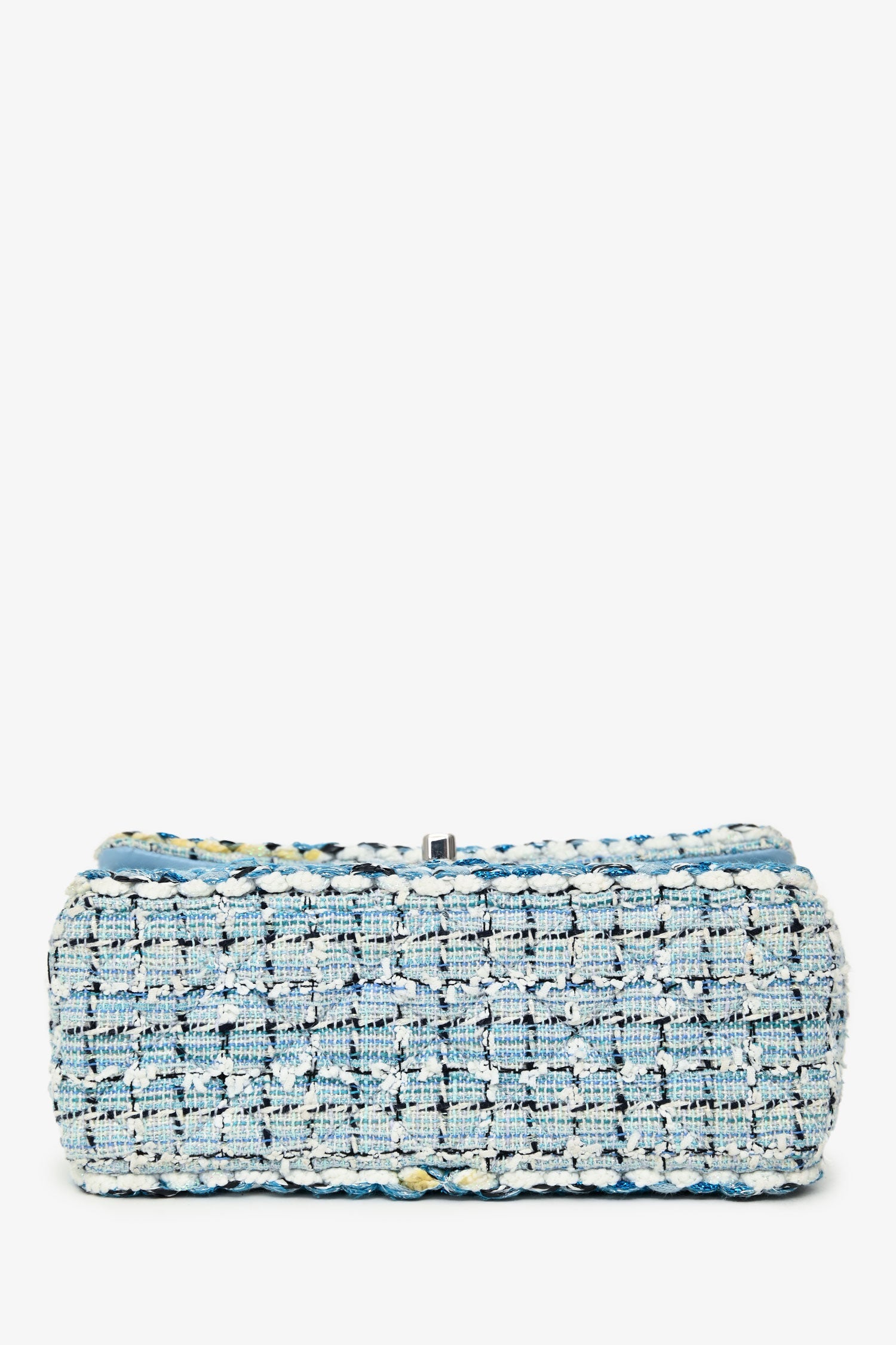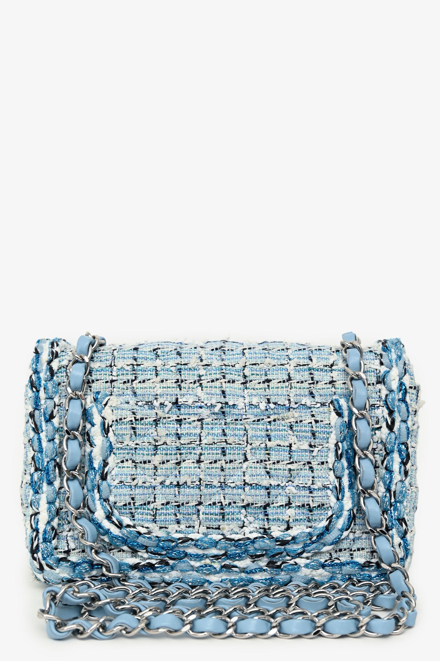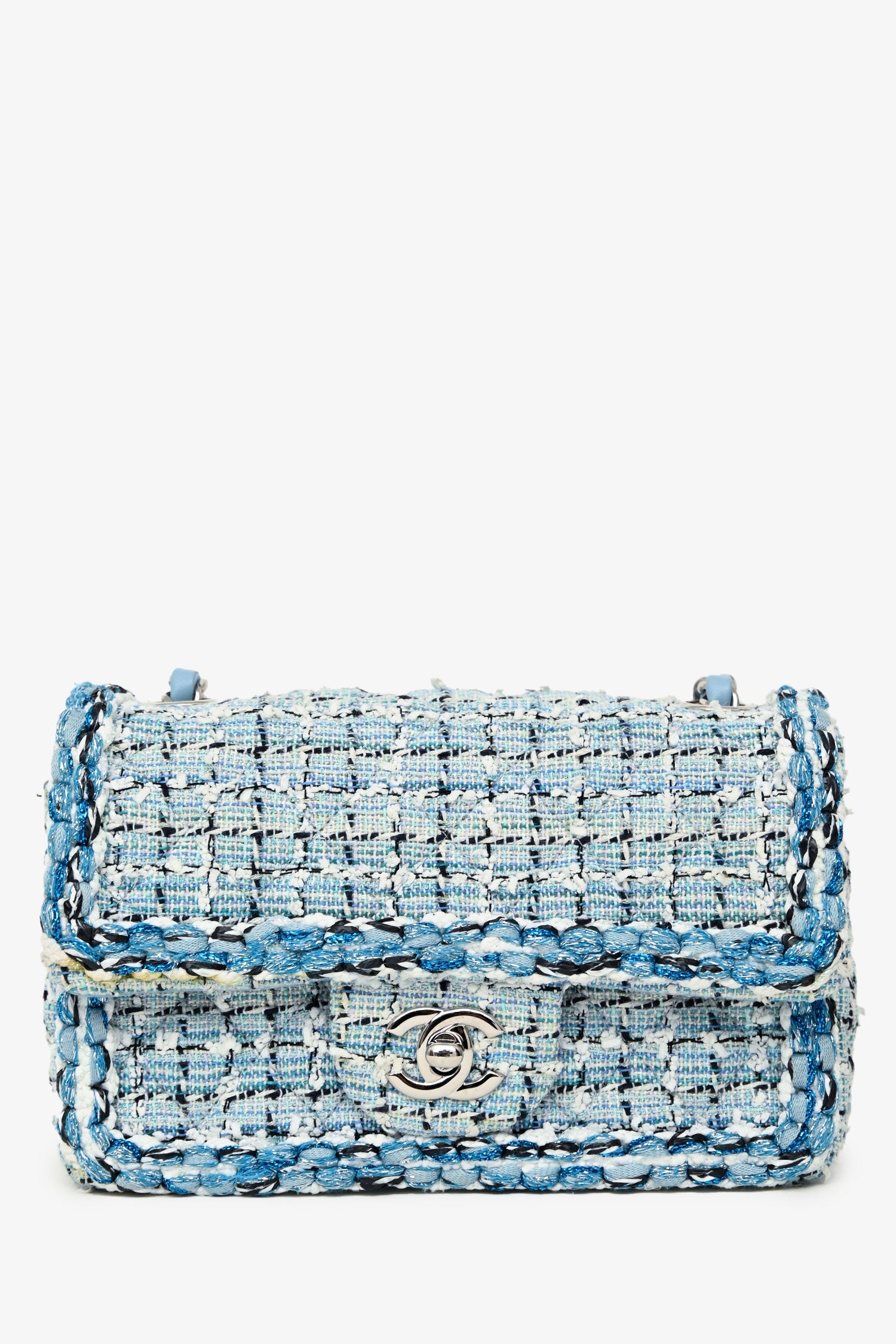 Pre-Loved Chanel™ 2019C Blue Tweed Mini Single Flap Silver Hardware. Flap front with turn-lock closure. Leather-and-chain shoulder strap. 1 exterior slip pocket. 1 interior compartment with 1 interior slip pocket and 1 zip pocket. Silver-tone hardware. Tonal stitching.