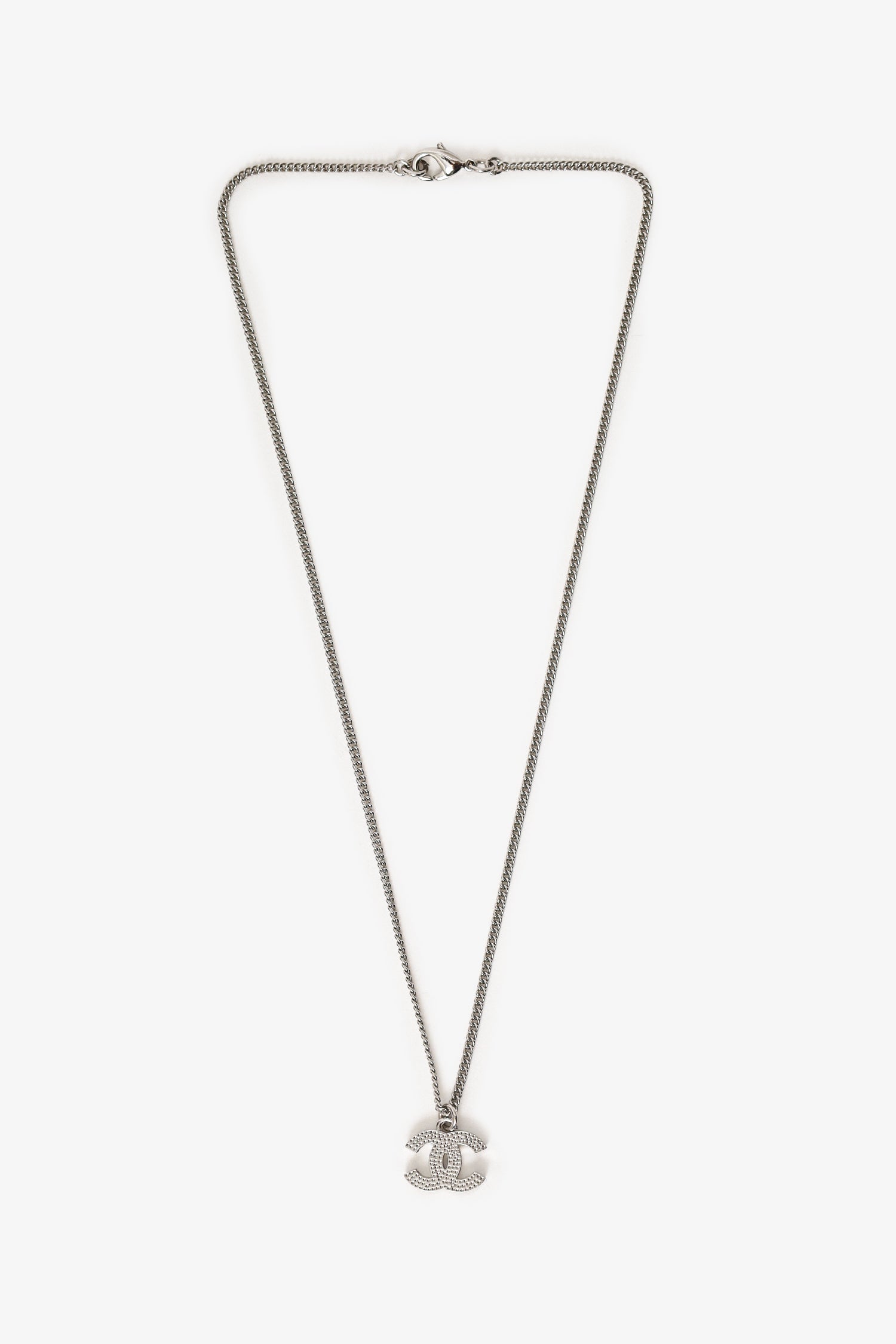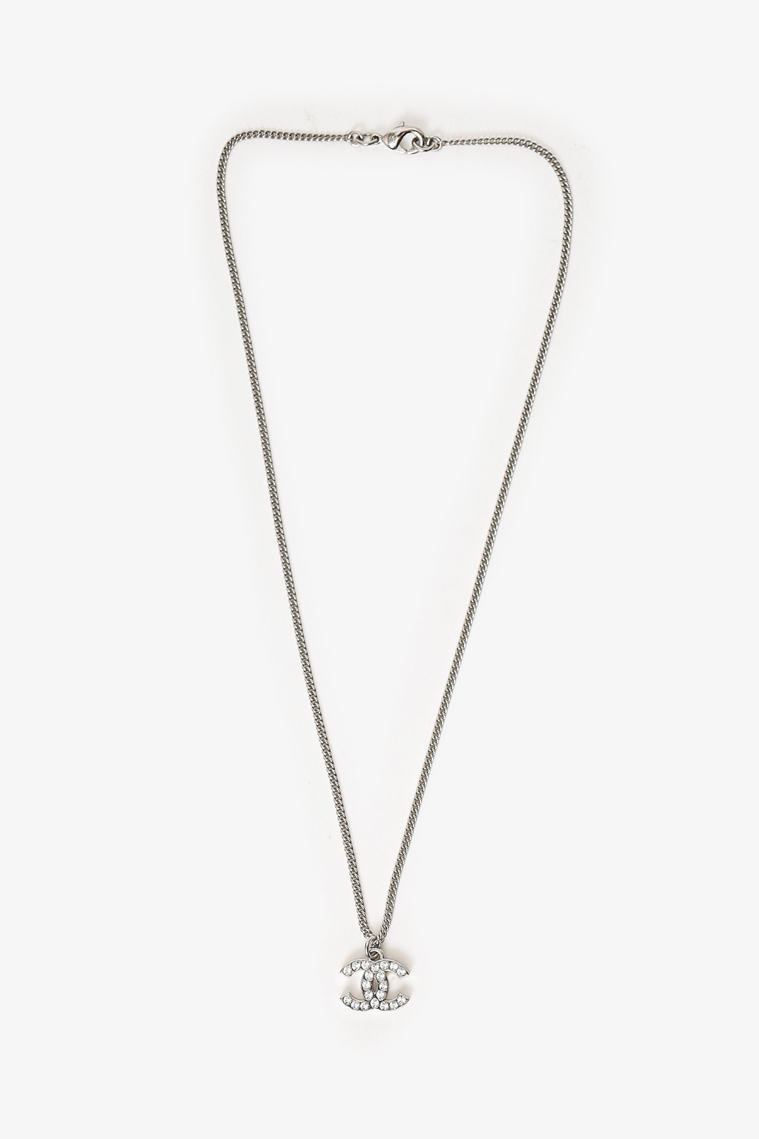Pre-Loved Chanel™ F12 Silver Tone Double CC Crystal Pendant Necklace. Rear clasp closure. Silver-tone hardware.