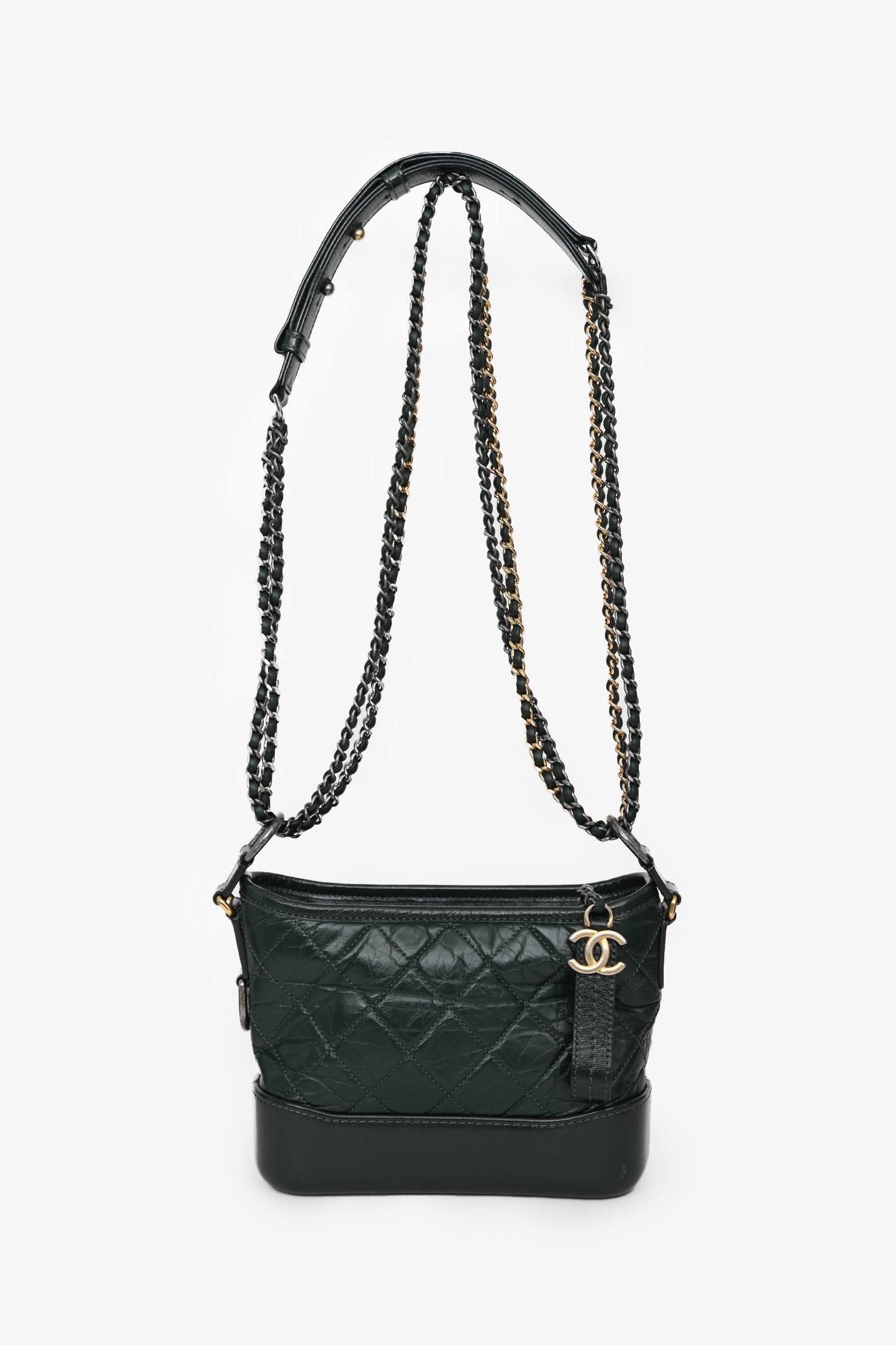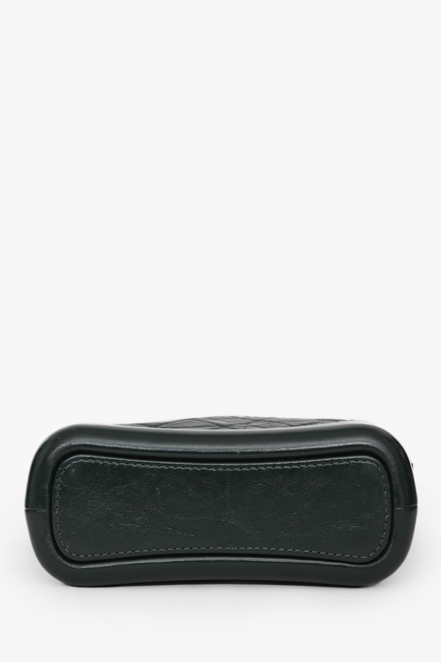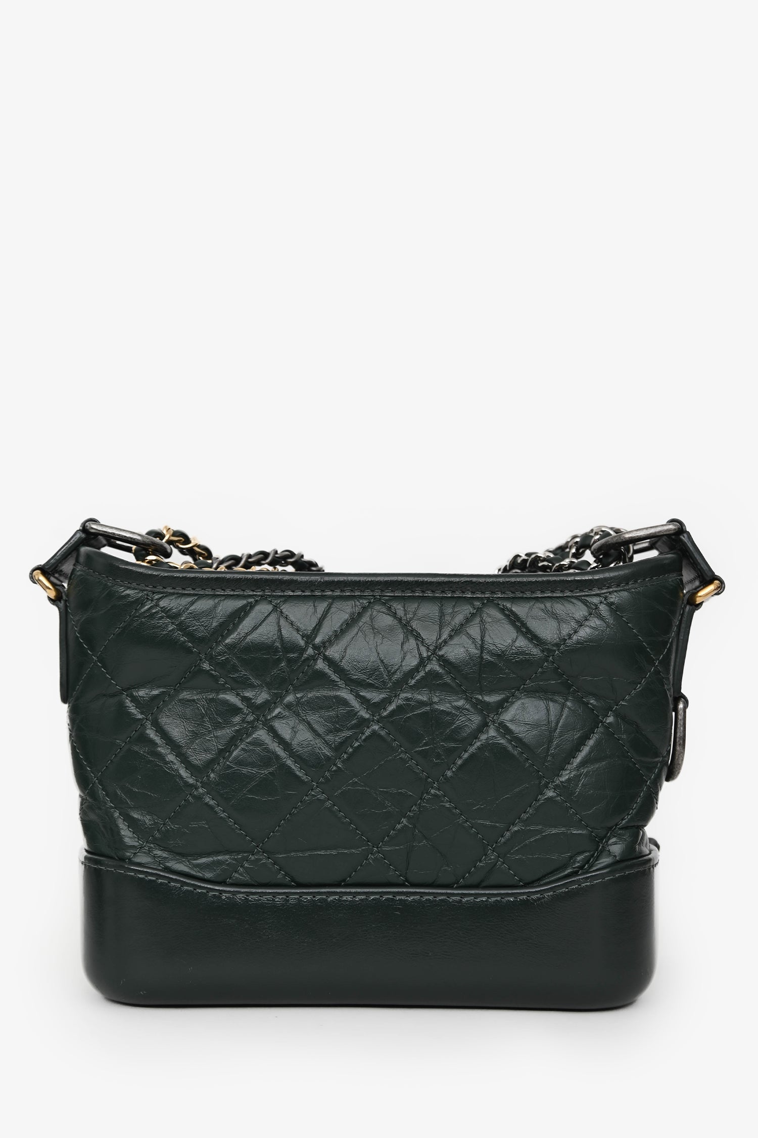Pre-Loved Chanel™ Green Aged Leather Small Gabrielle Crossbody. Zip closure at the top. Adjustable leather-and-chain crossbody strap. 1 interior compartment with 1 interior zip pocket; 2 interior slip pockets. Interior stap with lobster clasp. Gold-tone and silver-tone hardware. Tonal stitching.